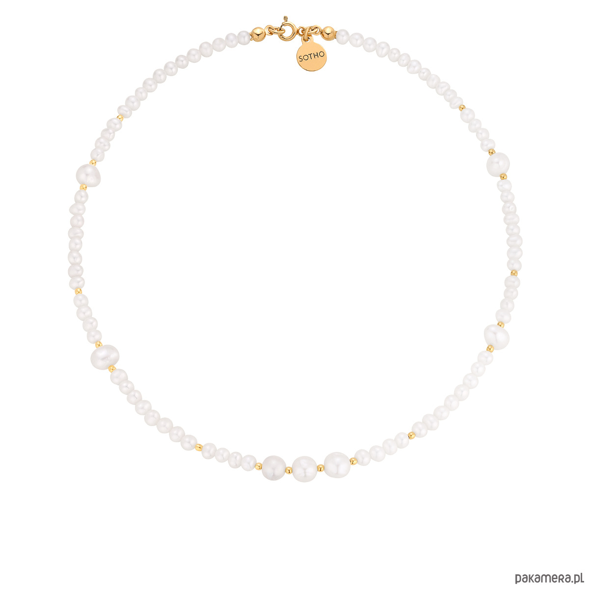 Złoty naszyjnik wykonany z naturalnych pereł słodkowodnych, zdobiony złotymi kuleczkami i zawieszką z logo marki. Wszystkie elementy wykonane ze srebra 925 powlekanego 24 karatowym żółtym złotem.