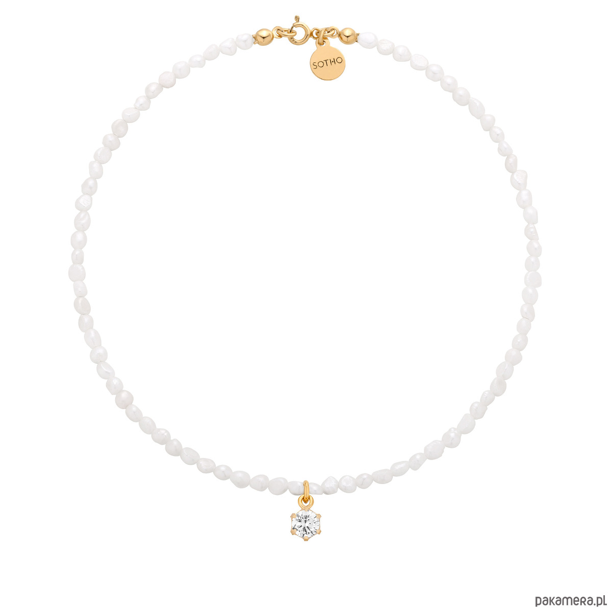 Złoty naszyjnik wykonany z naturalnych pereł słodkowodnych z bezbarwną cyrkonią i zawieszką z logo marki. Wszystkie elementy wykonane ze srebra 925 powlekanego 24 karatowym żółtym złotem.