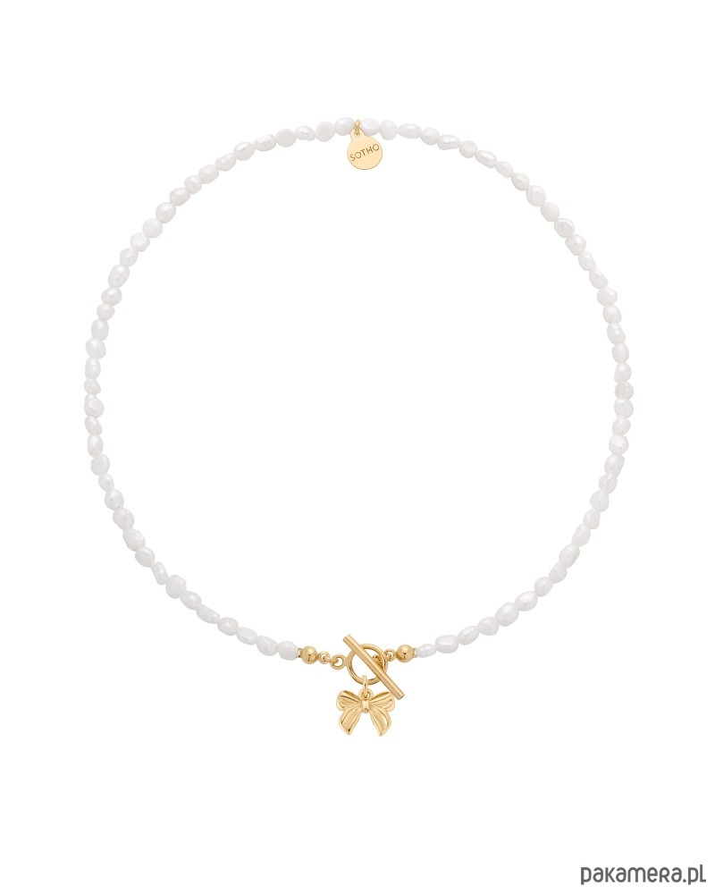 Złoty naszyjnik wykonany z naturalnych pereł słodkowodnych z ozdobnym zapięciem, kokardką i zawieszką z logo marki. Wszystkie elementy wykonane ze srebra 925 powlekanego 24 karatowym żółtym złotem.