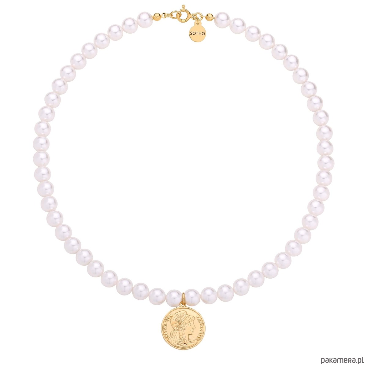 Złoty naszyjnik z monetą wykonany z pereł SWAROVSKI® CRYSTAL w kolorze białym White. Wszystkie elementy wykonane ze srebra 925 powlekanego 24 karatowym żółtym złotem.