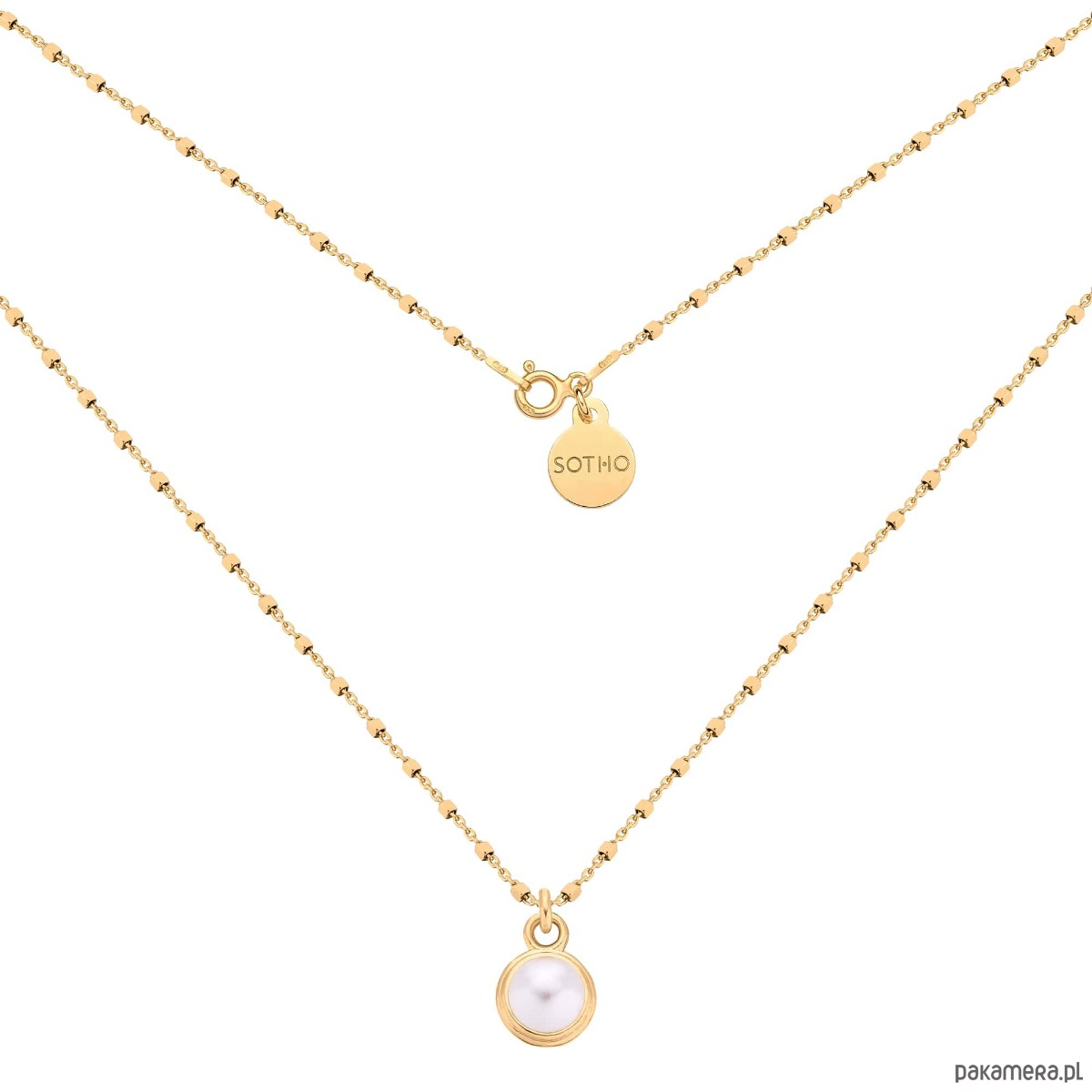 Złoty naszyjnik kosteczkowy zdobiony perłą SWAROVSKI® CRYSTAL w kolorze białym White i zawieszką z logo marki. Całość wykonana ze srebra 925 powlekanego 24 karatowym żółtym złotem.