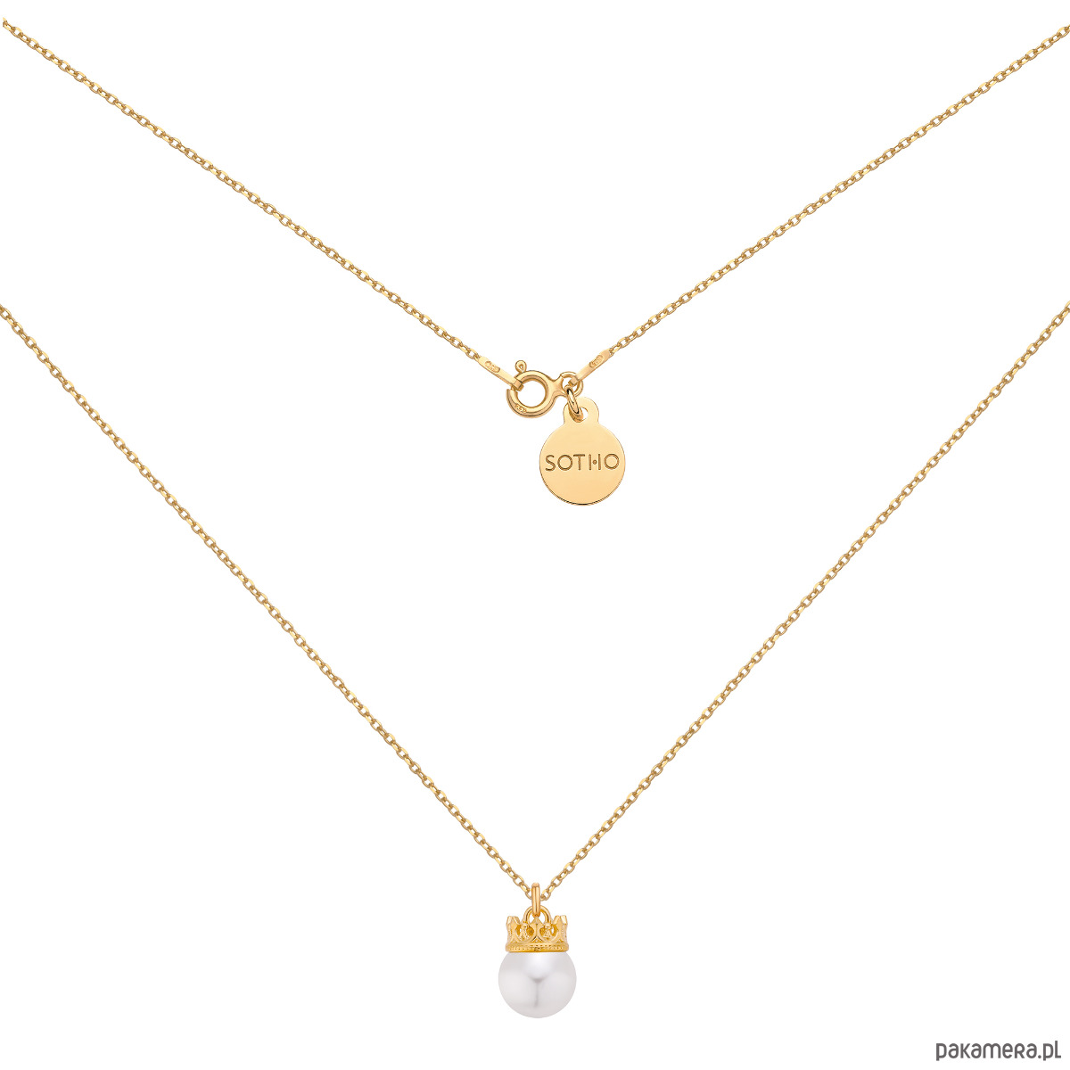 Złoty naszyjnik z perłą w koronie. Całość wykonana ze srebra 925 powlekanego 24 karatowym żółtym złotem.
