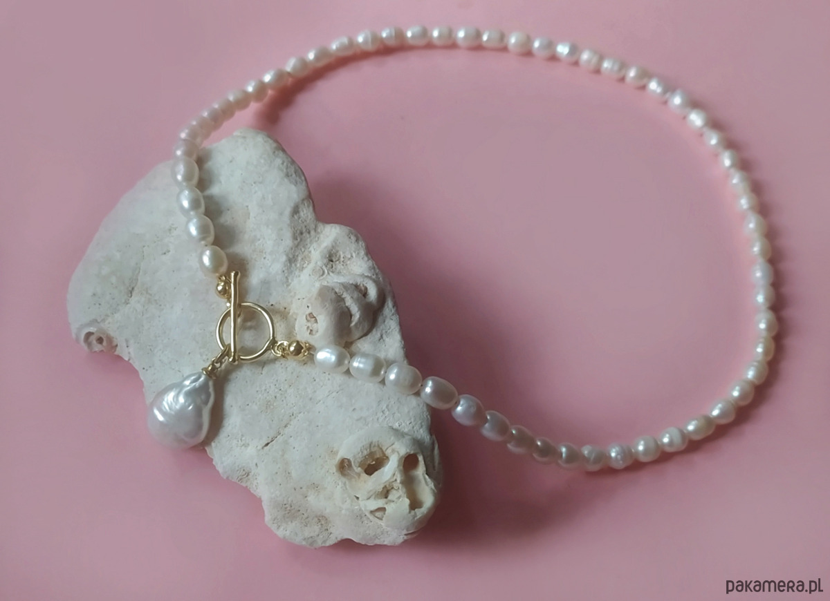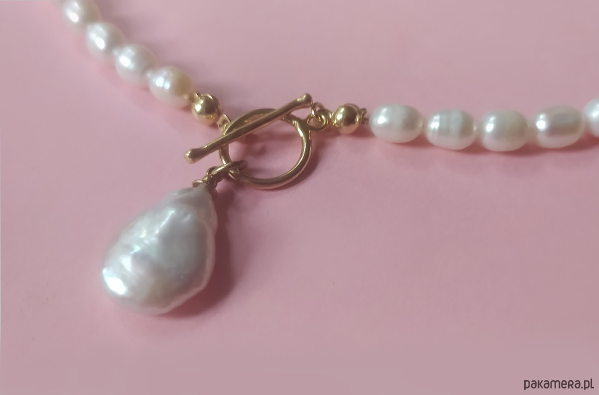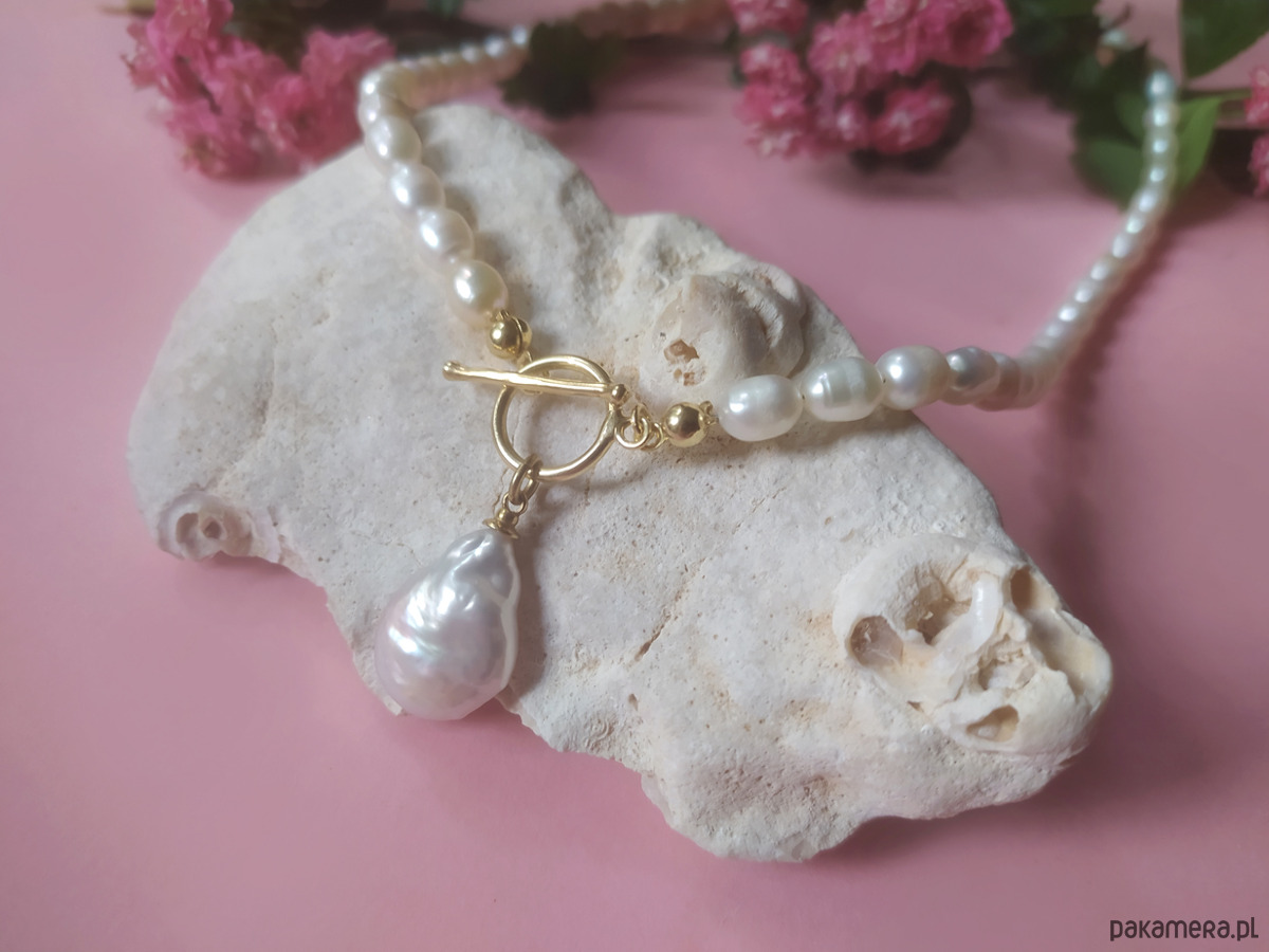 Efektowny naszyjnik wykonany z najwyższej jakości srebra próby 925, pokrytego 24-karatowym złotem oraz naturalnych pereł. Wyjątkowym detalem jest dekoracyjne, okrągłe zapięcie, do którego przymocowana została duża, naturalna perła – efektowny akcent przyciągający uwagę.
