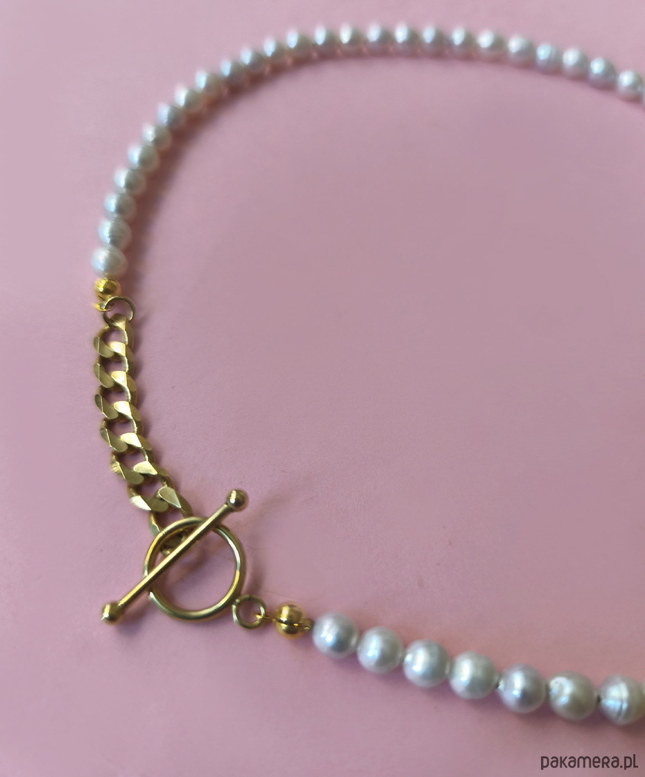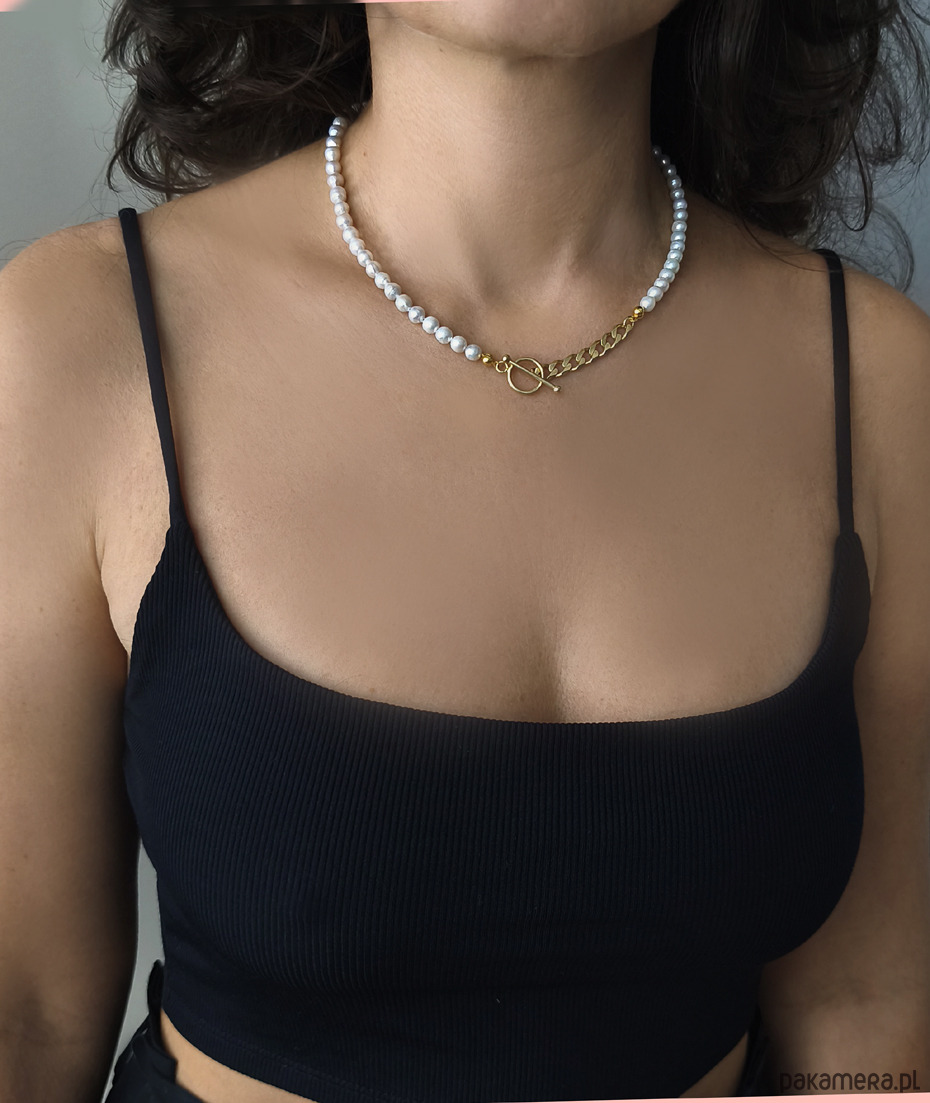 Łańcuch typu pancerka połączony jest z białymi prawdziwymi perłami.