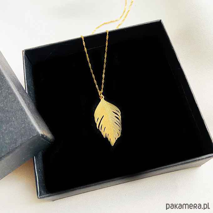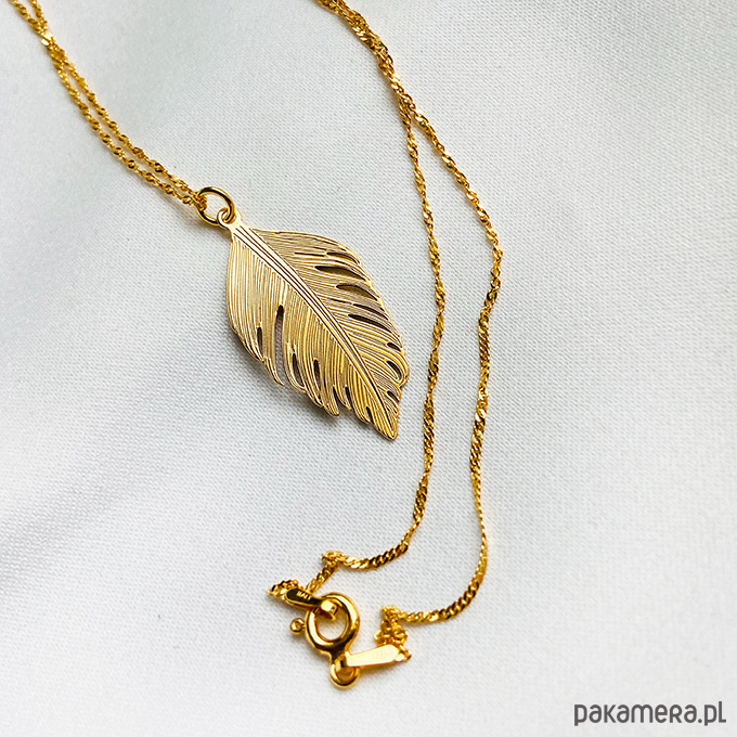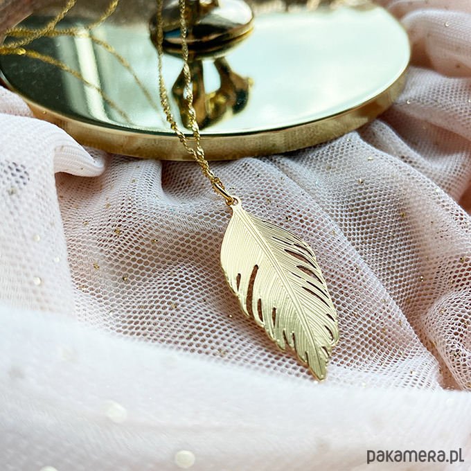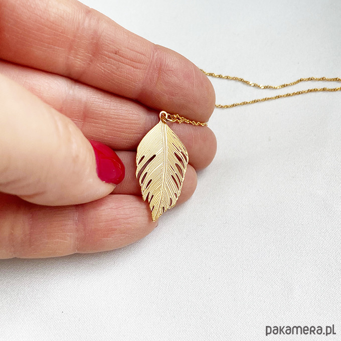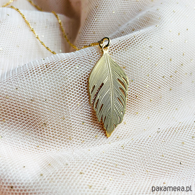 Inspirowany naturą naszyjnik z delikatną, ale efektowną dużą zawieszką w kształcie pióra.Wykonany ze srebra próby 925 złoconego 24 k złotem.