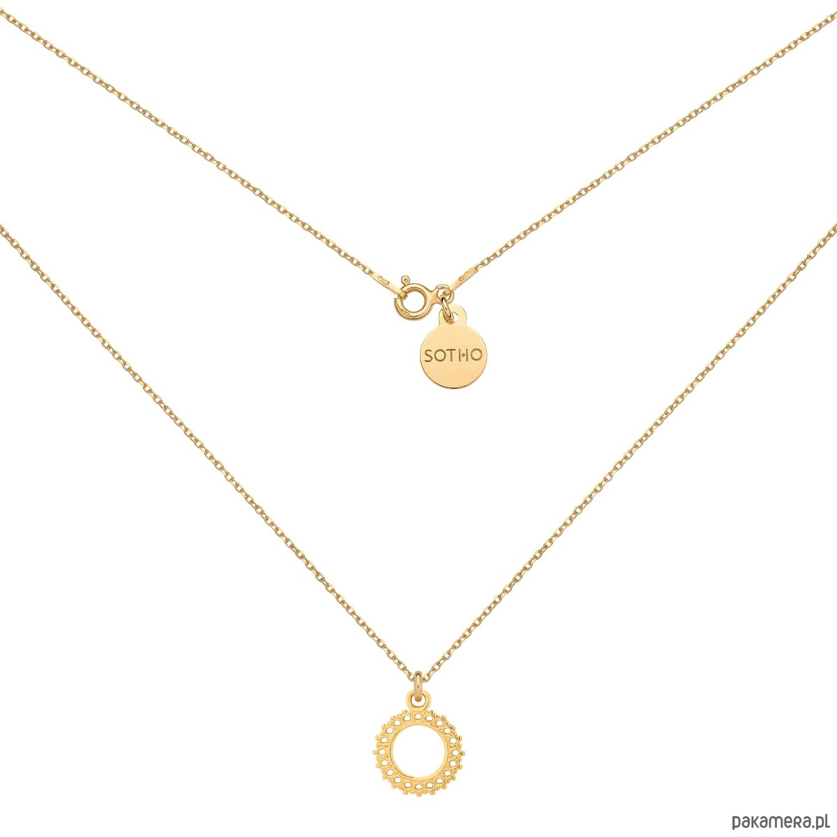 Złoty naszyjnik łańcuszkowy zdobiony rozetką i zawieszką z logo marki. Całość wykonana ze srebra 925 powlekanego 24 karatowym żółtym złotem.
