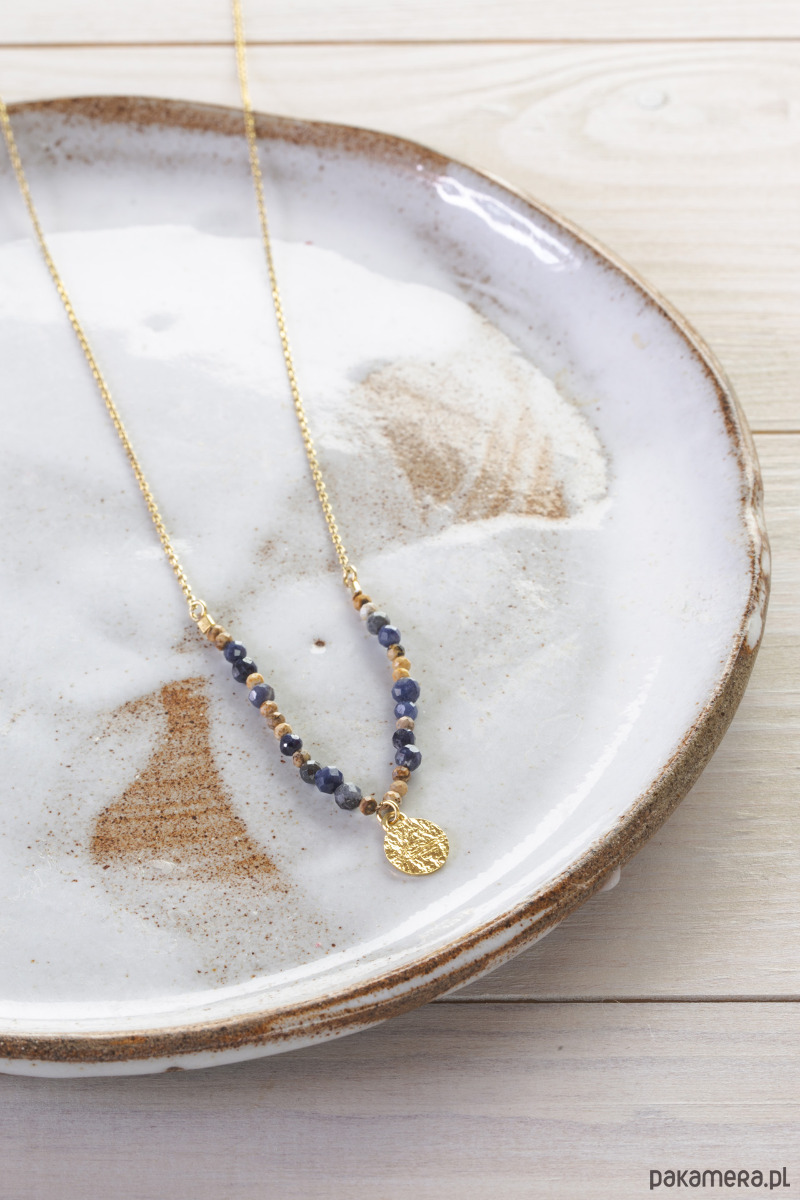 Złoty naszyjnik z szafirami i medalionem wykonany ze srebra próby 925, pozłacanego 24k złotem. Wykorzystane kamienie naturalne to szafir i jaspis krajobrazowy.Produkt wykonany ręcznie.