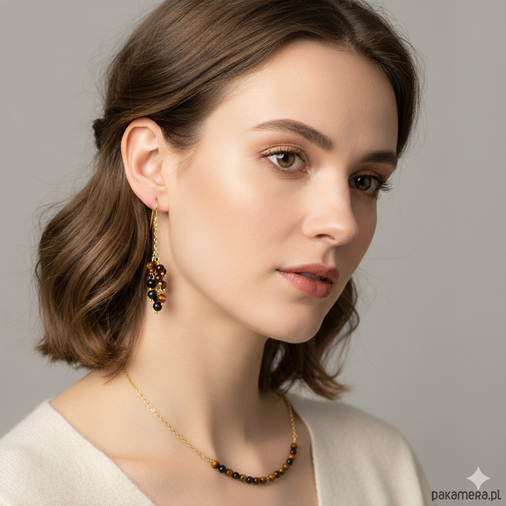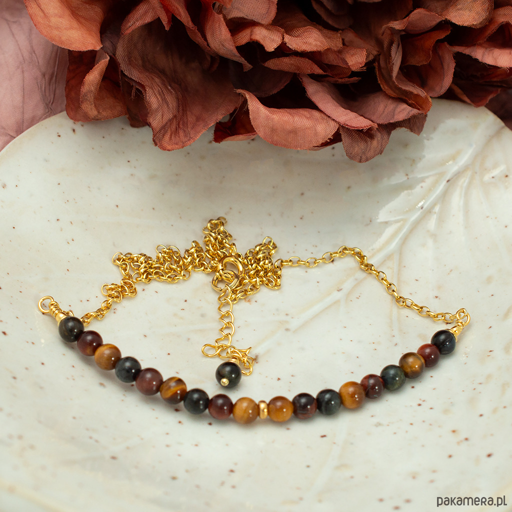 Elegancki naszyjnik z tygrysim okiem, sokolim okiem i bawolim okiem w różnych odcieniach brązu.