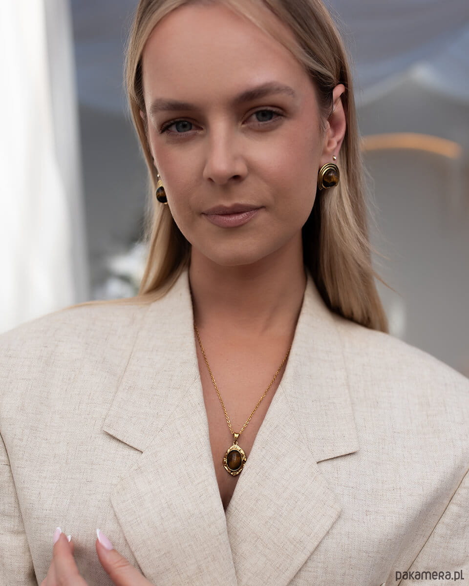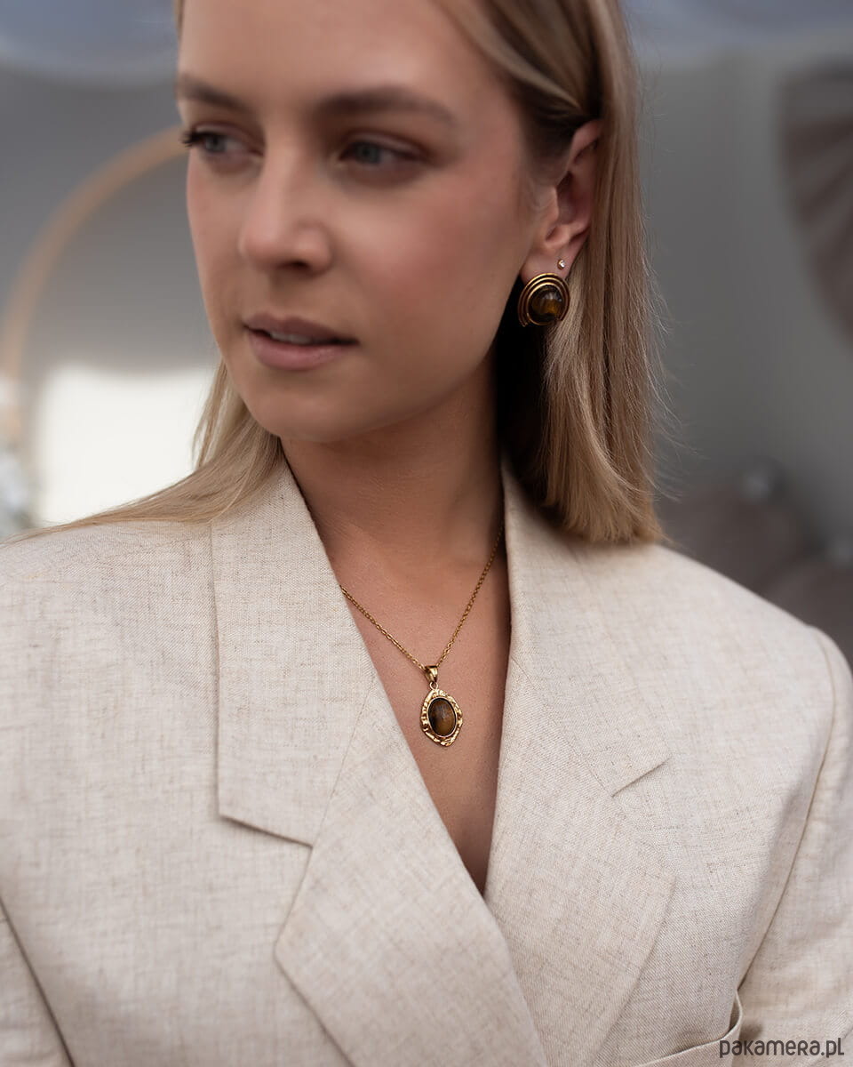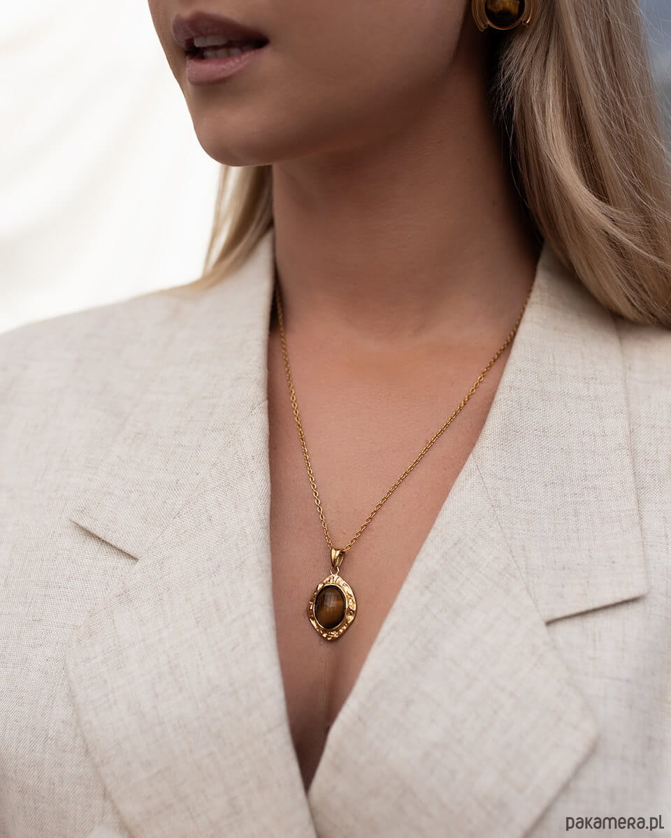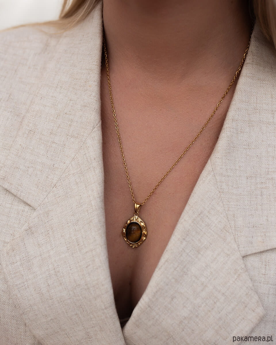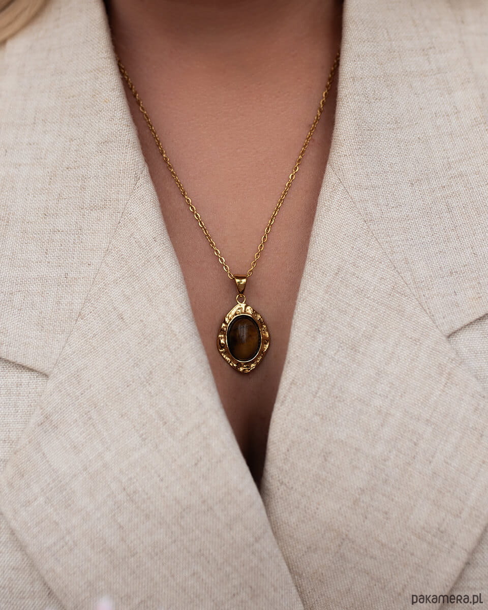 Szukasz dodatku, który dopełni Twój styl i doda mu tajemniczości? Naszyjnik Lyra to biżuteria z charakterem, jest subtelna, ale niezwykle wyrazista. Złoty łańcuszek zakończony owalnym, brązowym kamieniem przyciąga spojrzenia i intryguje swoją głębią. To połączenie elegancji z naturalnym ciepłem, idealne dla kobiet, które cenią piękno w najczystszej formie.Zawieszka w kolorze złota otula gładki, ciemny kamień tygrysiego oka - symbol siły, odwagi i harmonii. Naszyjnik Lyra doskonale sprawdzi się zarówno jako codzienna ozdoba, jak i efektowny dodatek do wieczorowej stylizacji. Niezależnie od okazji podkreśli Twój styl i doda Ci pewności siebie.Wymiary zawieszki: 2,9 cmDługość łańcuszka: 50 cm + 5 cm przedłużkaWaga: tylko 8,4 g