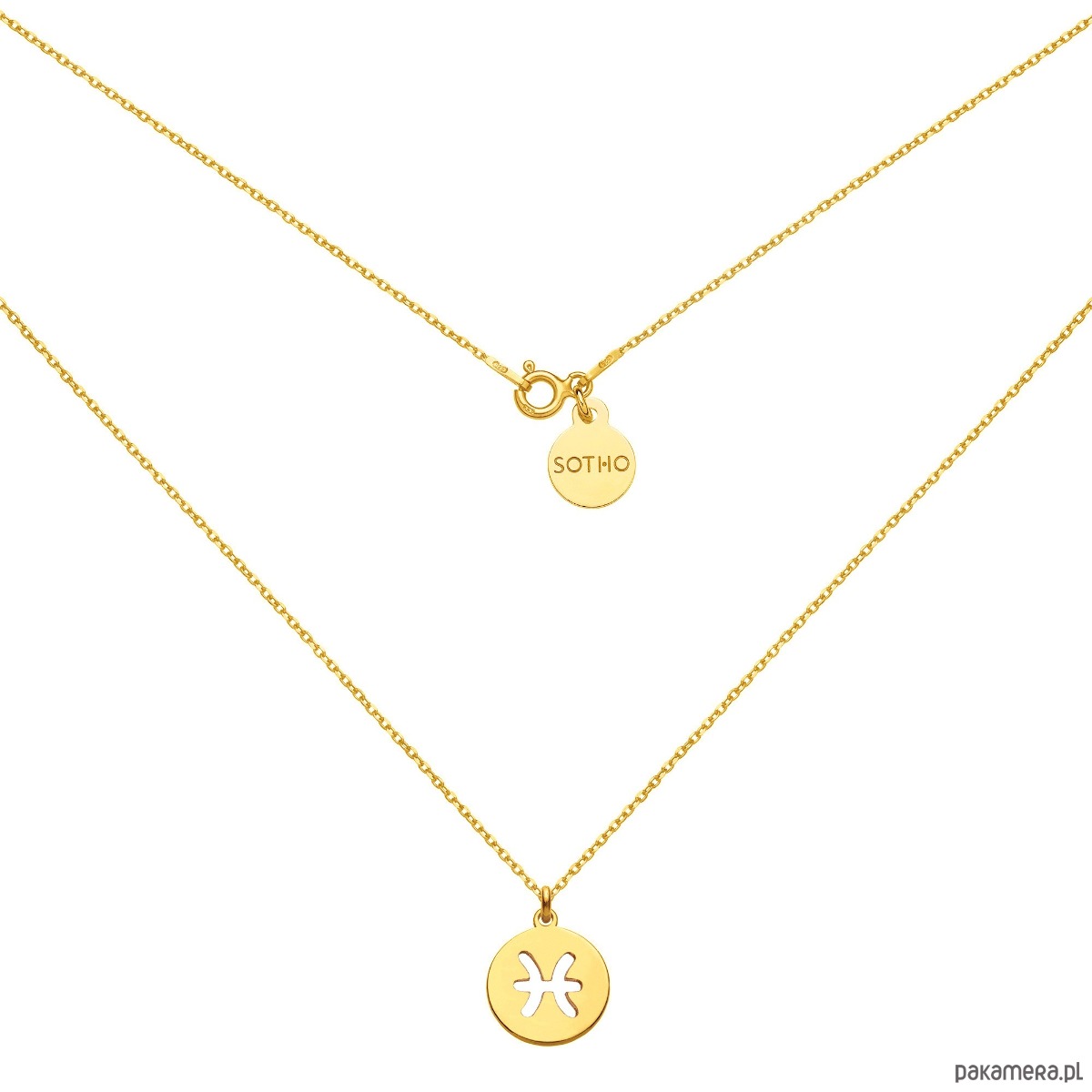 Złoty naszyjnik łańcuszkowy zdobiony znakiem zodiaku Ryby i zawieszką z logo marki. Całość wykonana ze srebra 925 powlekanego 24 karatowym żółtym złotem.