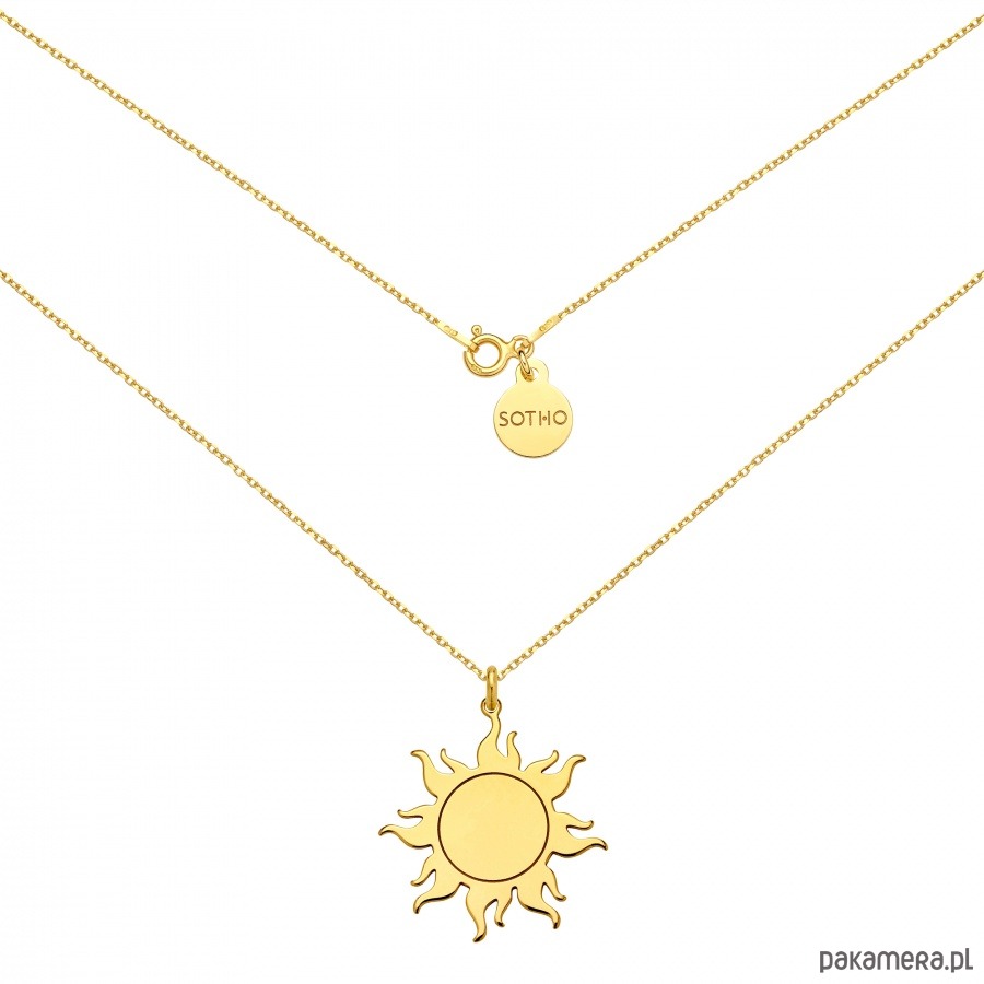 Złoty naszyjnik łańcuszkowy zdobiony słońcem i zawieszką z logo marki. Całość wykonana ze srebra 925 powlekanego 24 karatowym złotem.