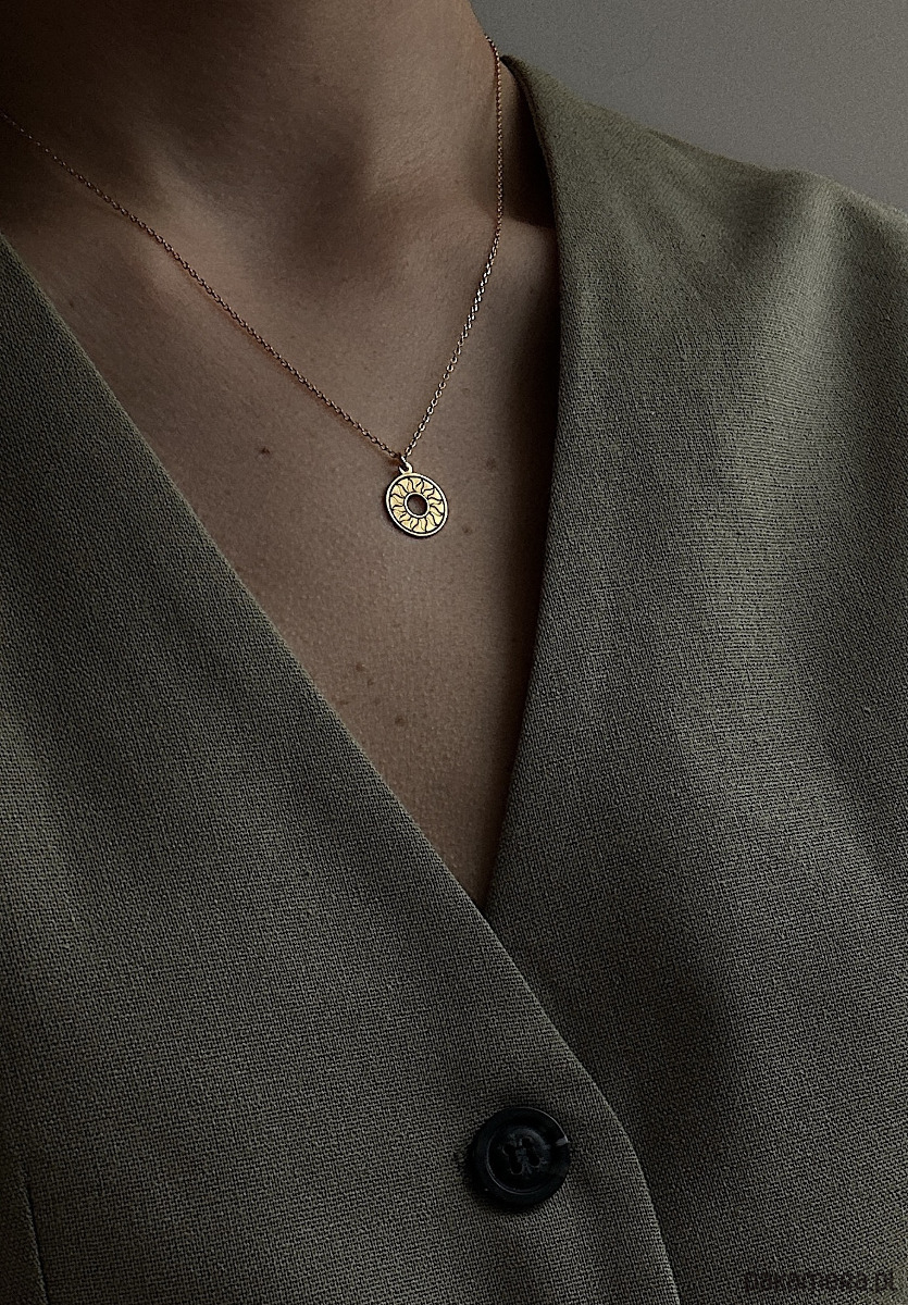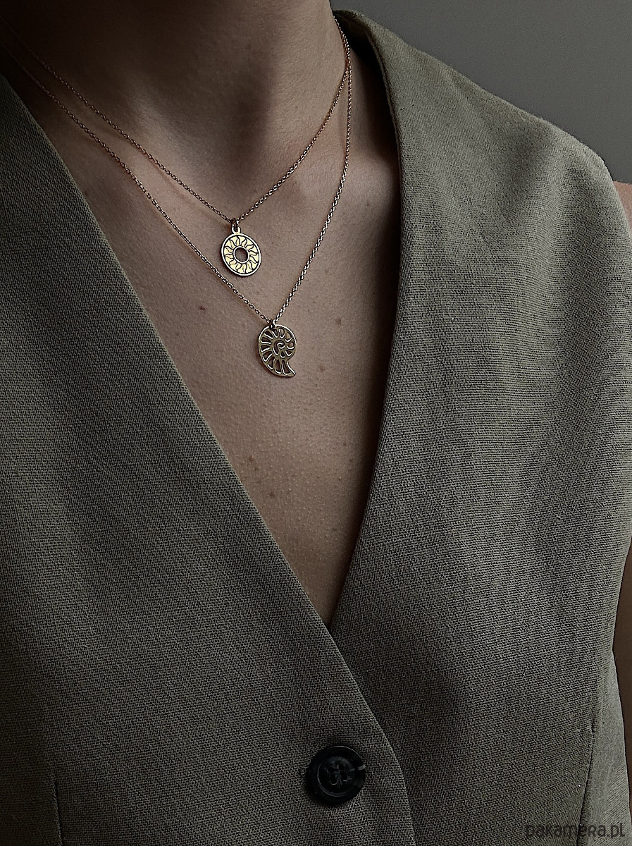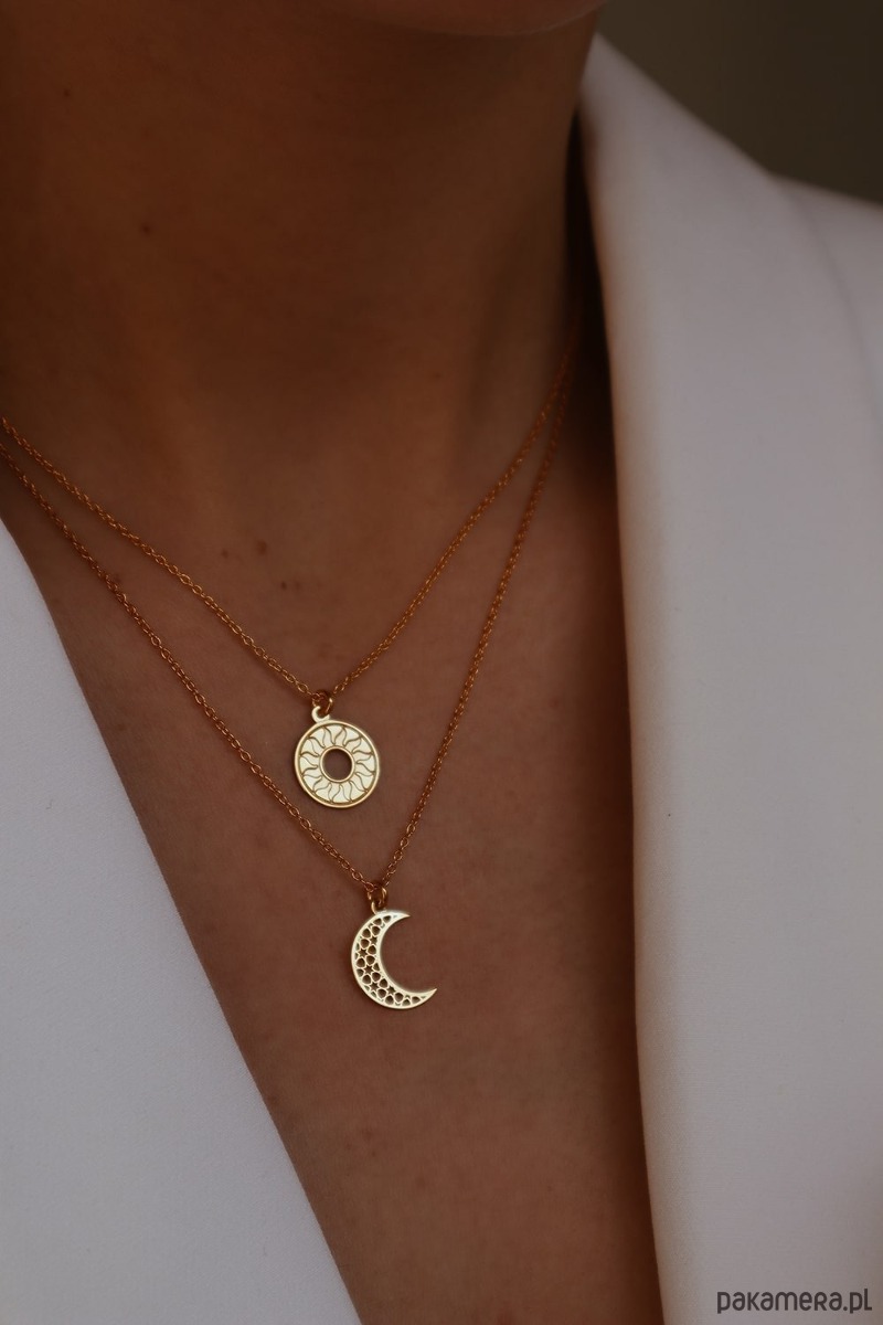 Złoty naszyjnik łańcuszkowy zdobiony słońcem i zawieszką z logo marki. Całość wykonana ze srebra 925 powlekanego 24 karatowym żółtym złotem.