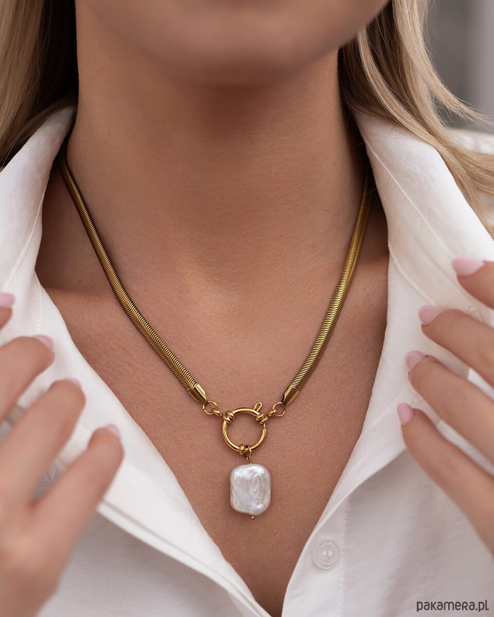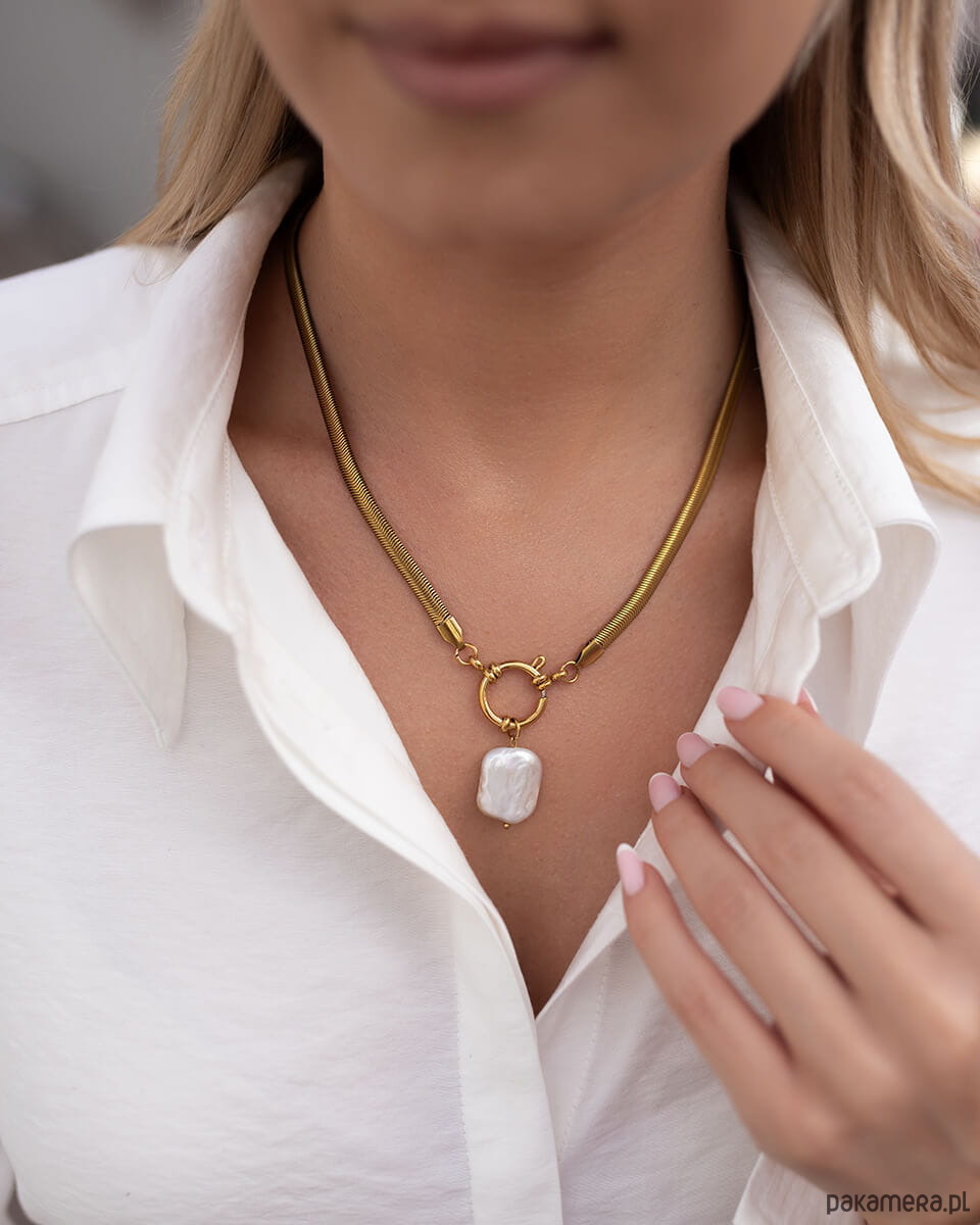 Szukasz biżuterii, która wyróżni Cię w tłumie, ale nie przytłoczy stylizacji? Naszyjnik Taira to połączenie klasyki z odważną formą – szeroki, płaski łańcuch w kolorze złota i zawieszka z prawdziwą perłą to duet, który z powodzeniem dopełni całą stylizację.To propozycja dla kobiet, które wiedzą, czego chcą i nie boją się tego pokazać. Idealny na ważne wyjścia, ale także do noszenia na co dzień z białą koszulą, oversizeowym swetrem czy marynarką.Długość naszyjnika to 42 cm (z regulacją do 43,5 cm, wysokość zawieszki 2,5 cm), co pozwala idealnie dopasować go do dekoltu i preferowanego stylu. Zapięcie federing jest solidne i wygodne w użytkowaniu.Dlaczego warto go mieć?Wykonany ze stali chirurgicznej – nie uczula, nie ciemnieje, nie ściera sięPozłacany metodą PVD – intensywny złoty kolor utrzymuje się latamiZawieszka z prawdziwą perłą – delikatny akcent, który przyciąga wzrokOdporność na wodę, pot i kosmetyki – możesz nosić go zawsze, bez zdejmowaniaTen naszyjnik jest odpowiedzią na potrzeby nowoczesnych kobiet, które chcą wyglądać wyjątkowo, ale bez kompromisów. Idealnie sprawdzi się jako:– biżuteria do pracy i na wieczorne wyjścia– prezent dla mamy, siostry lub przyjaciółki– naszyjnik na urodziny, święta, rocznicę– biżuteria dla kobiet kochających minimalizm i ponadczasowe formyW przeciwieństwie do srebra czy taniej biżuterii z sieciówek, stal chirurgiczna nie wymaga specjalnej pielęgnacji. Nie matowieje, nie traci blasku i nie zostawia śladów na skórze.Nie musisz już wybierać między stylem, a trwałością. Ten złoty naszyjnik z perłą ze stali chirurgicznej to wybór, który po prostu się opłaca.Dodaj do koszyka i poczuj różnicę – od pierwszego założenia.