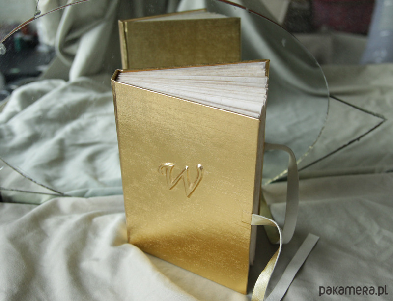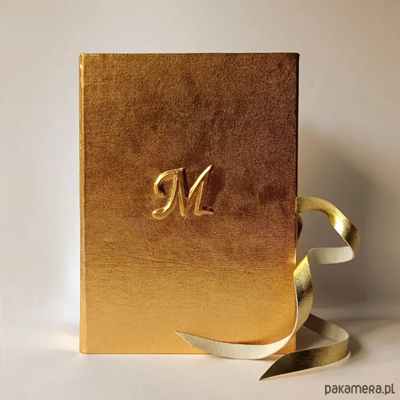Złoty notes, pamiętnik, dziennik... wykonany pod podstaw ręcznie w mojej pracowni Papirell. Okładka obita jest złotą tkaniną, do zamknięcia służą rzemienie ze złotej skóry naturalnej (rzemienie na odwrocie są szare). Jeśli księga ma być wykonana bez rzemieni proszę o taką informację. Na okładce umieszczam wypukły inicjał lub inicjały - proszę o ich podanie w wiadomości do zamówienia.