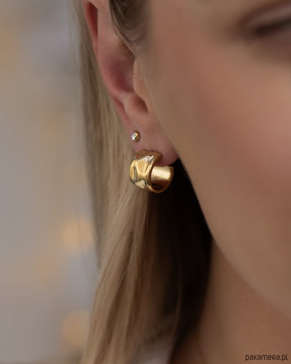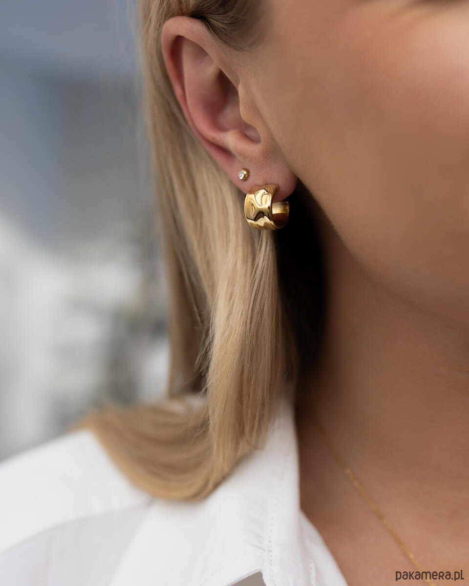 Te kolczyki to małe dzieła sztuki. Ich nowoczesny, nieco nieregularny kształt sprawia, że przyciągają wzrok i świetnie podkreślają indywidualny styl. To model, który mówi: „jestem odważna, pewna siebie i wiem, czego chcę”.Wykonane są z wysokiej jakości stali chirurgicznej. Dzięki temu:- nie ciemnieją, nawet po wielu miesiącach użytkowania,- są wodoodporne - możesz nosić je na co dzień, bez zdejmowania do kąpieli, na siłownię czy w czasie wakacji,- a co najważniejsze, są hipoalergiczne, dzięki czemu sprawdzą się idealnie u osób z wrażliwą skórą.Wymiary:wysokość: 1,5 cmszerokość: 1 cmwaga: 8,0 g - są wyraziste, ale komfortowe w noszeniuDostępne są w dwóch wersjach kolorystycznych, w złotym i srebrnym - wybierz kolor dla siebie!