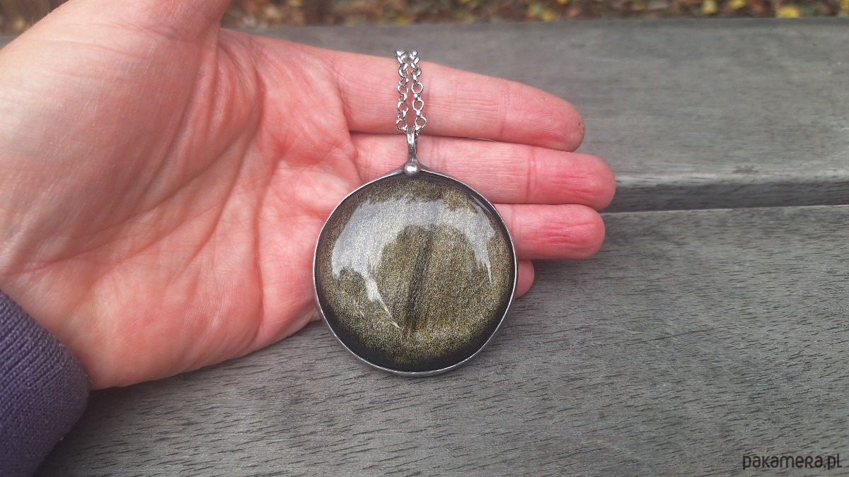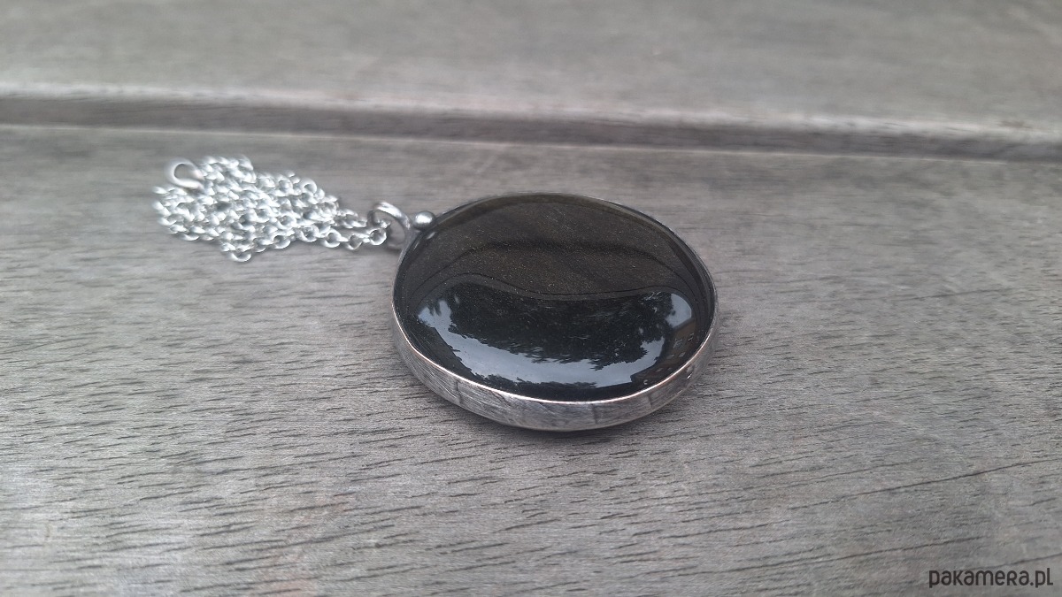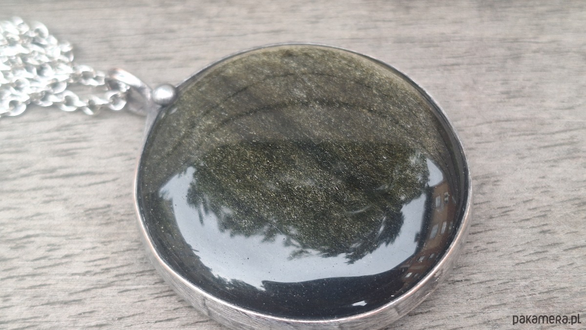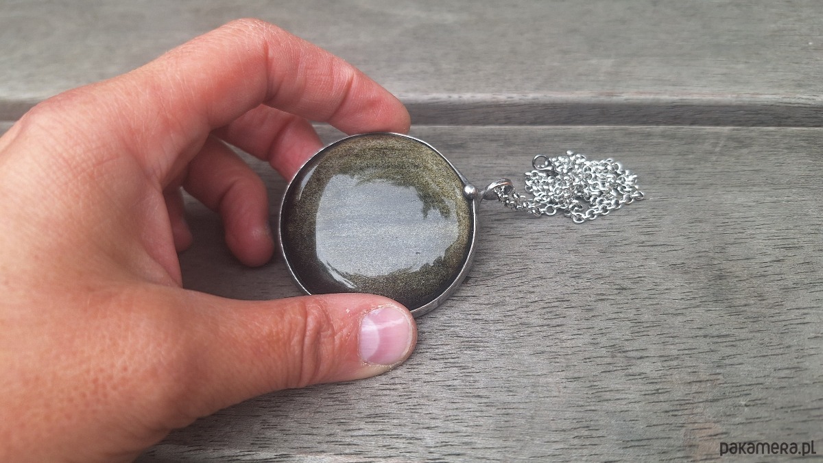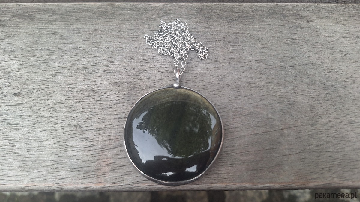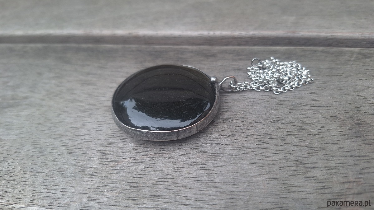 Wisiorek wykonany z miedzi, cyny i obsydianu. Wymiary ok. 5 na 5 cm. Zawieszony na łańcuszku o długości ok. 50 cm.