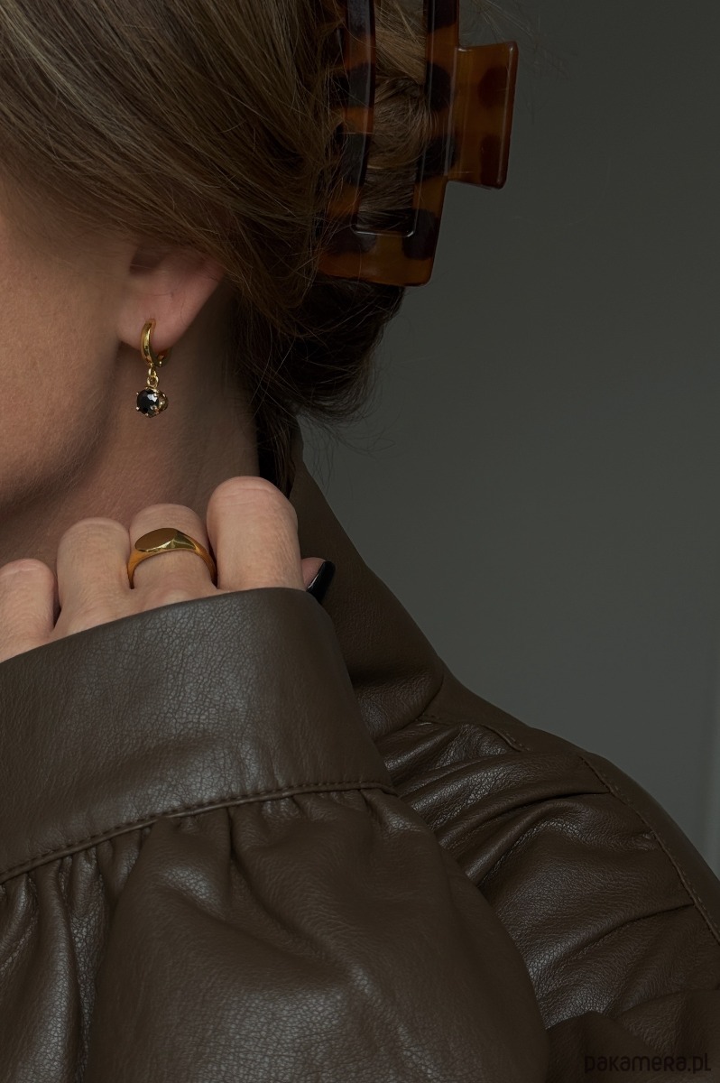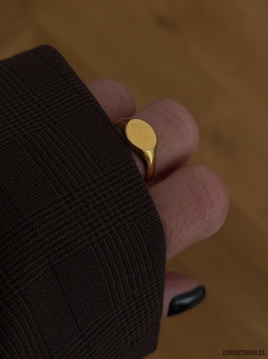 Złoty owalny sygnet wykonany ze srebra 925 powlekanego 24 karatowym żółtym złotem.