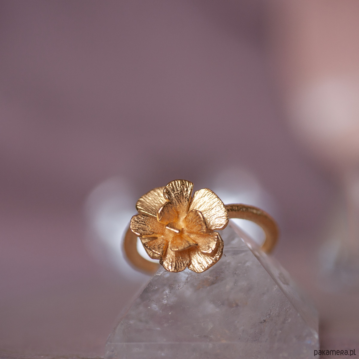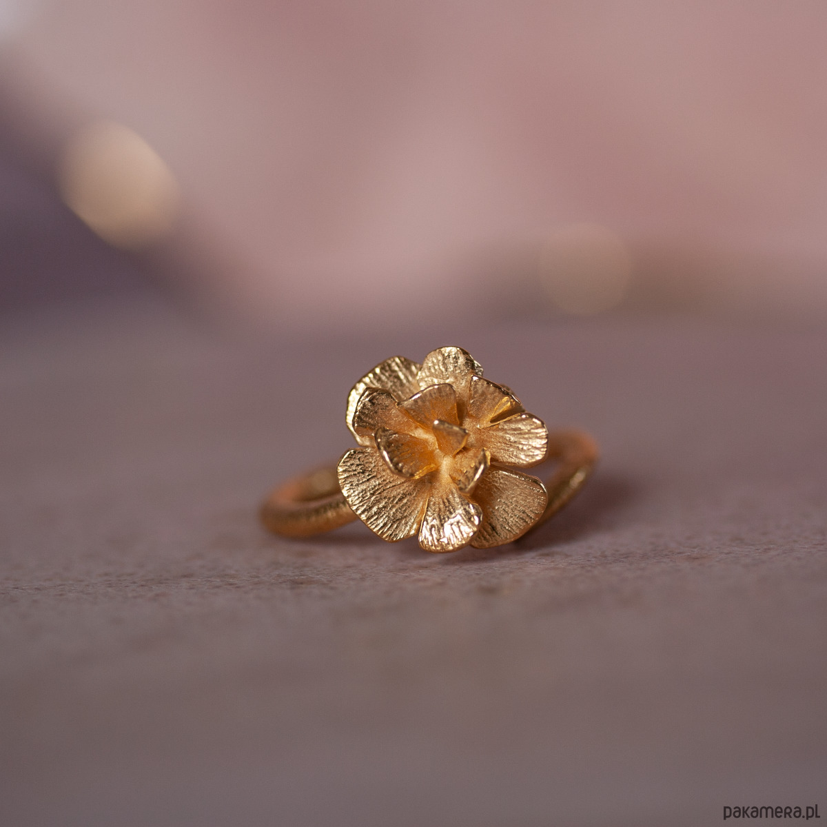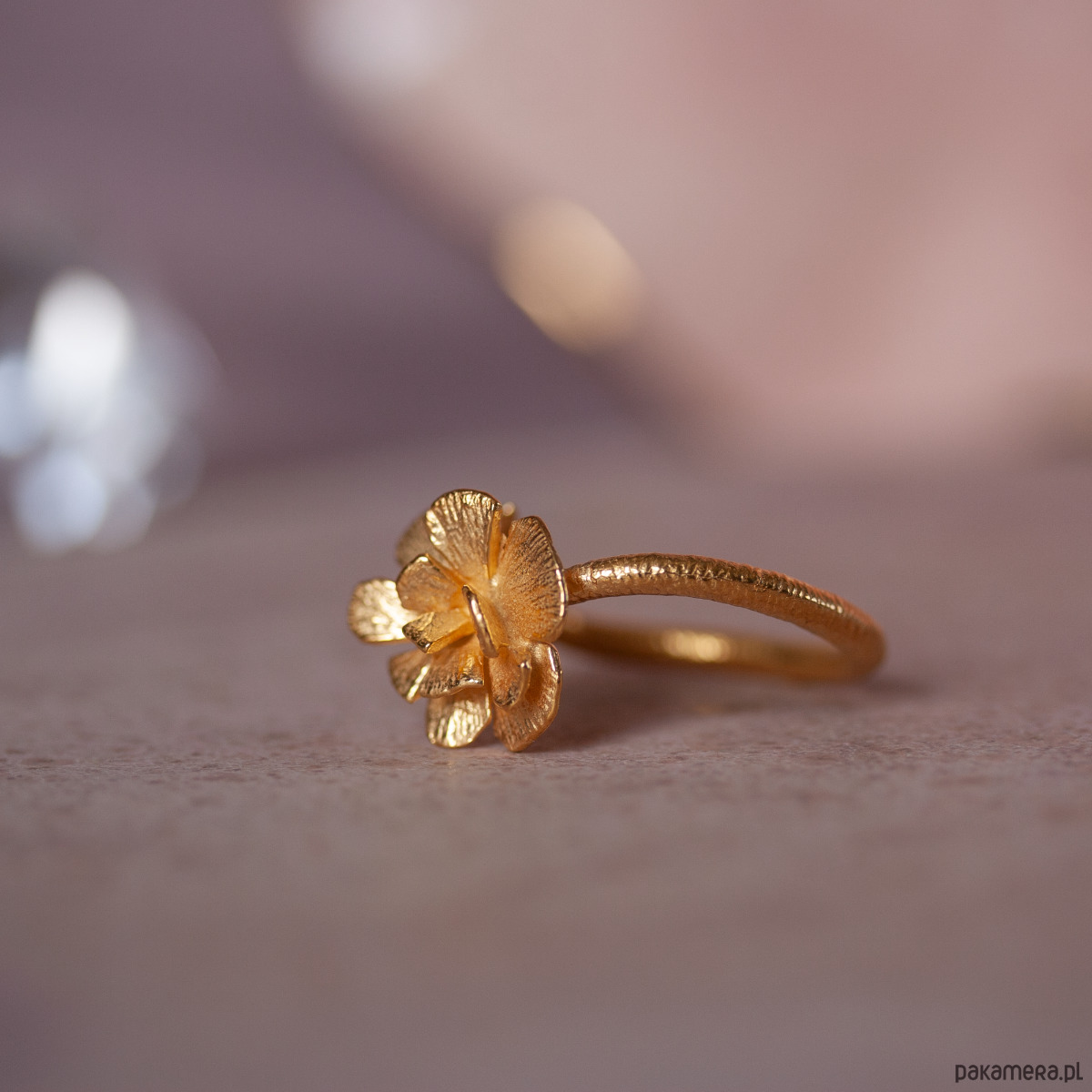 Złoty pierścień regulowany z kwiatem róży