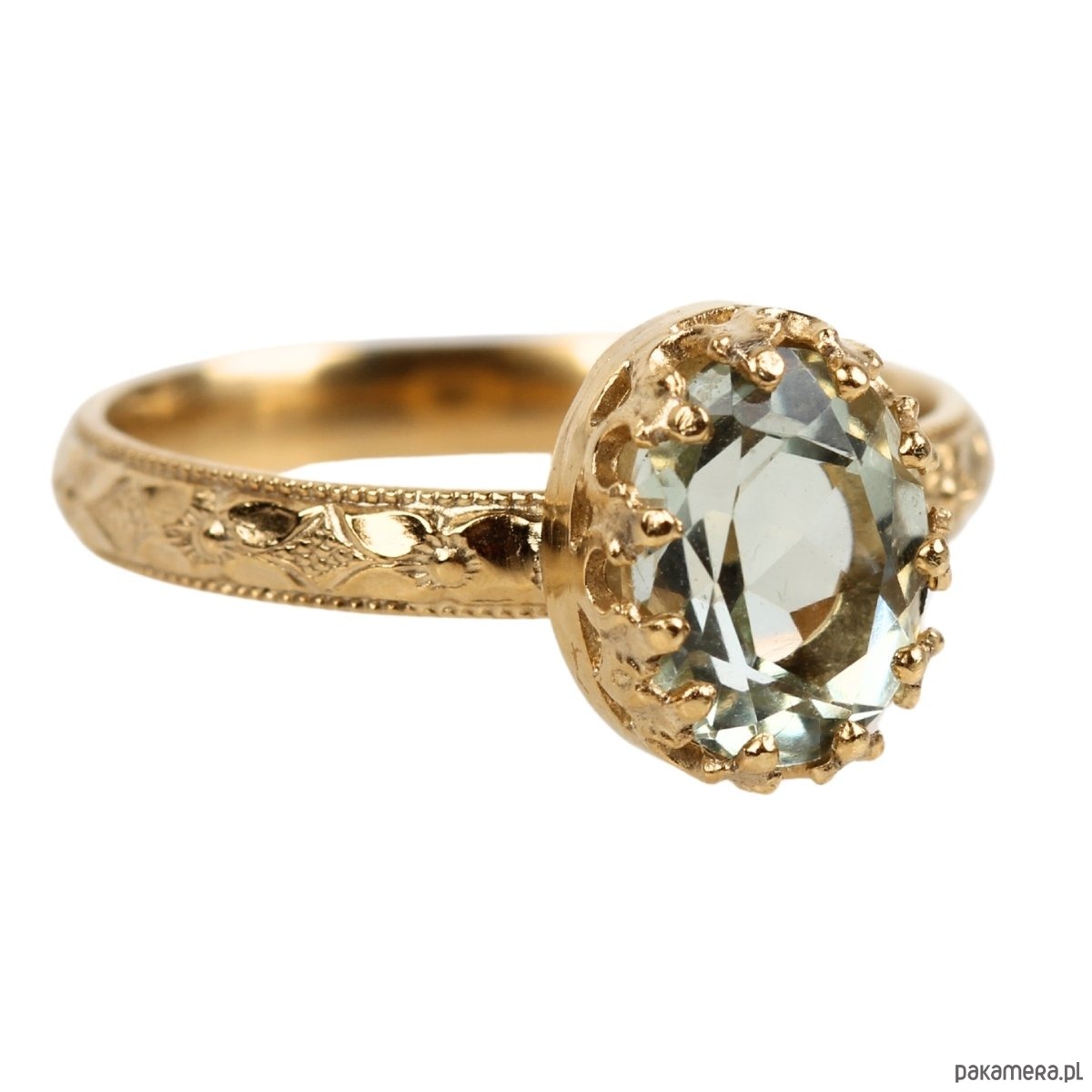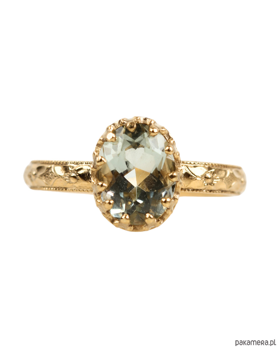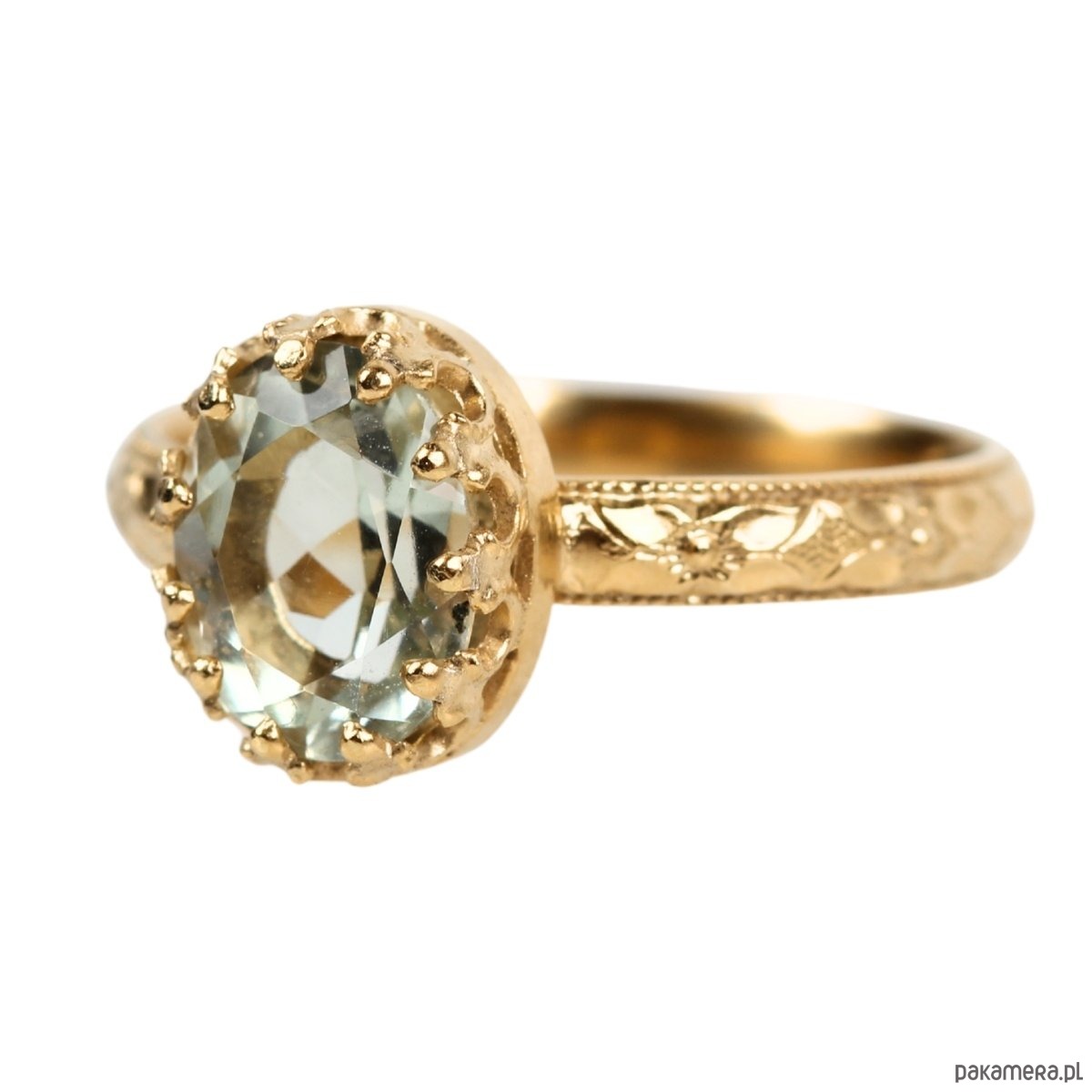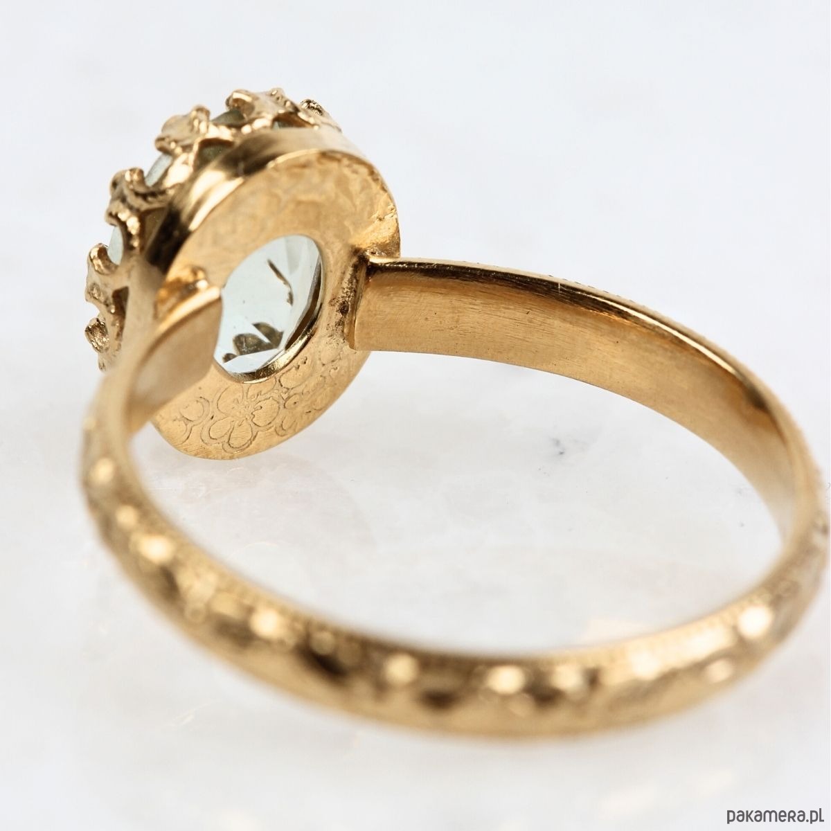 Ręcznie wykonany pierścionek z fasetowanym zielonym ametystem ze srebra pokrytego 24 karatowym złotem z przepięknie fakturowaną obrączką w kwiatowy wzór oraz ozdobną cargą wokół kamienia w stylu Vintage.