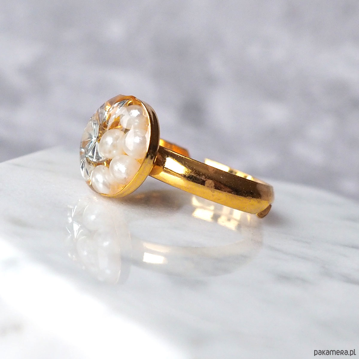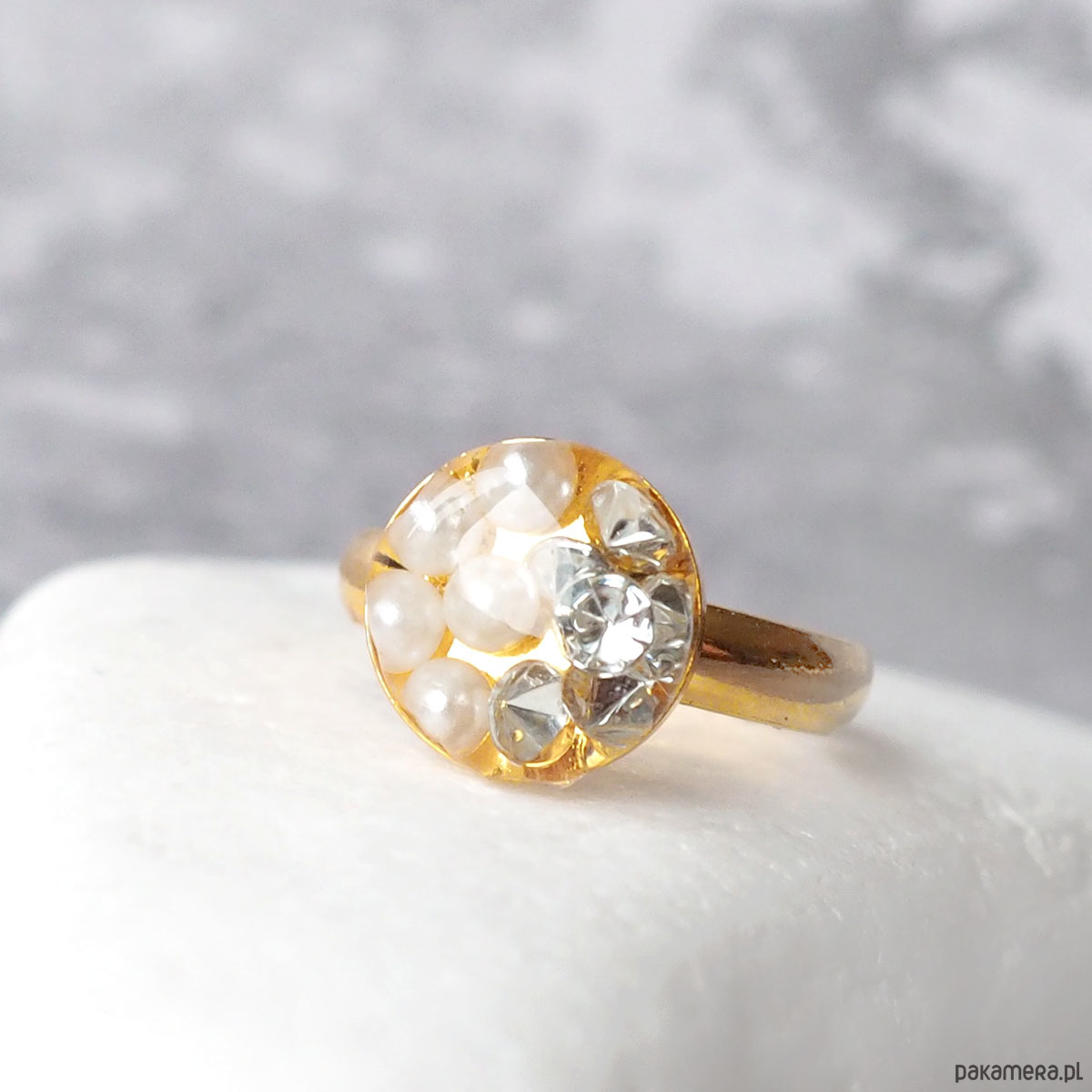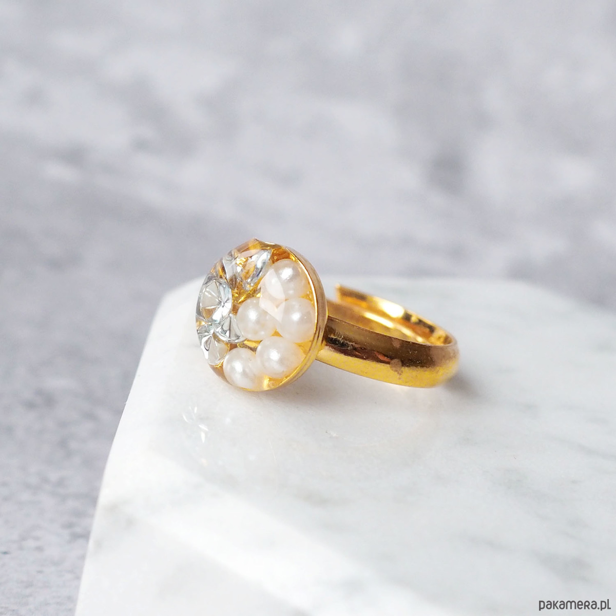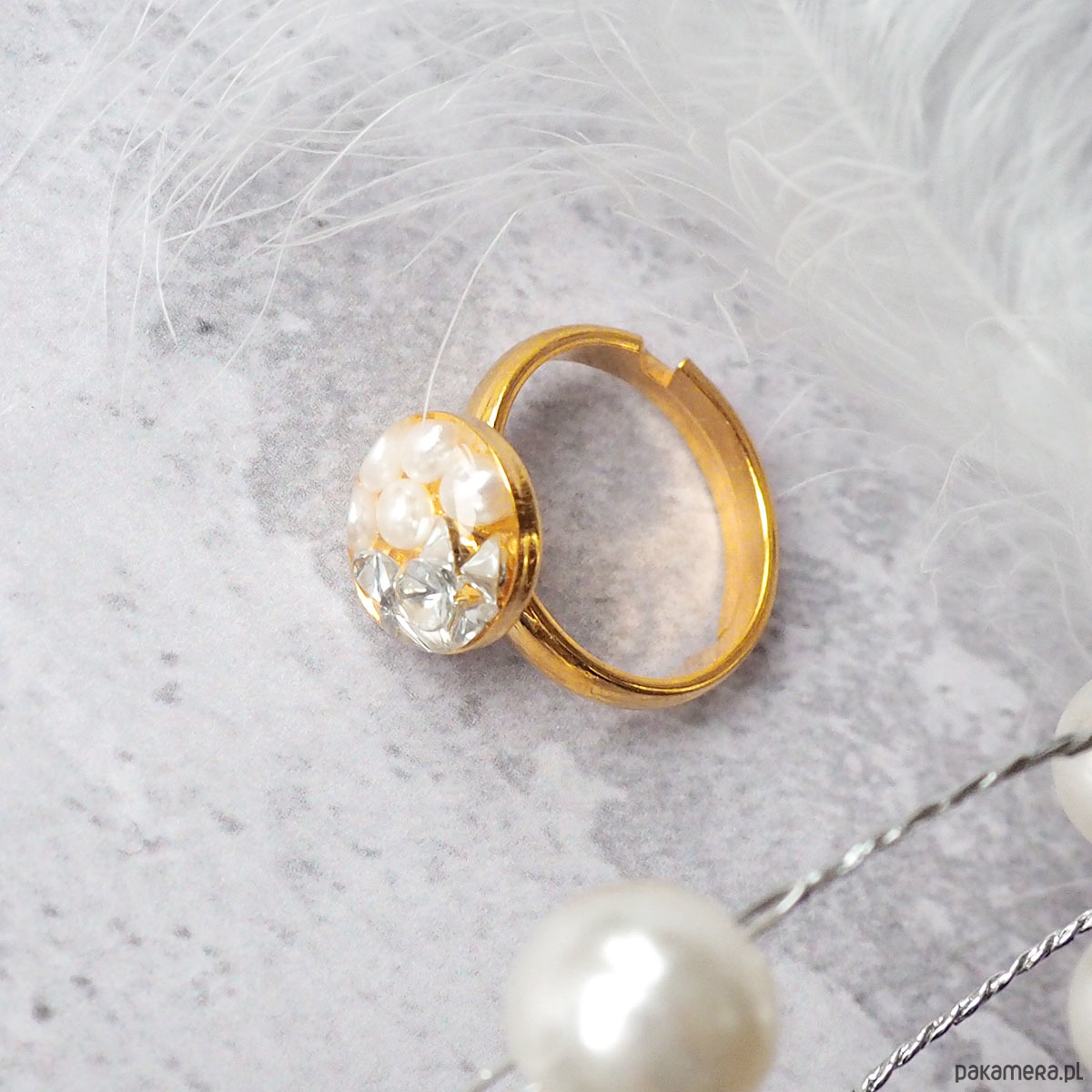 Bardzo efektowny regulowany pierścionek z perełkami i diamencikami w żywicy.