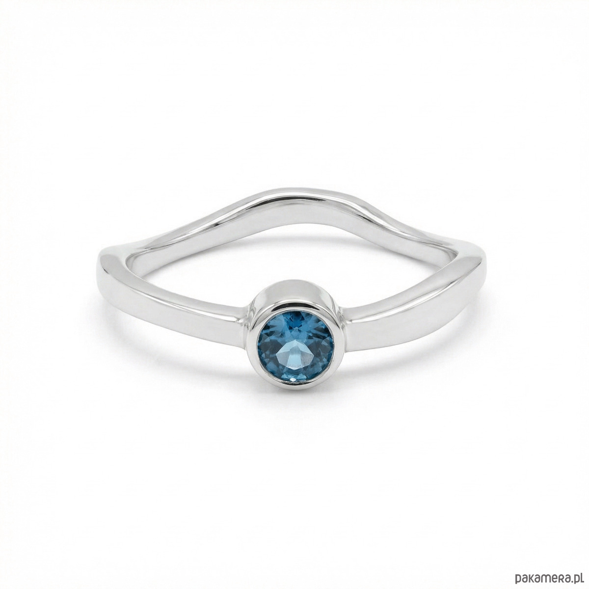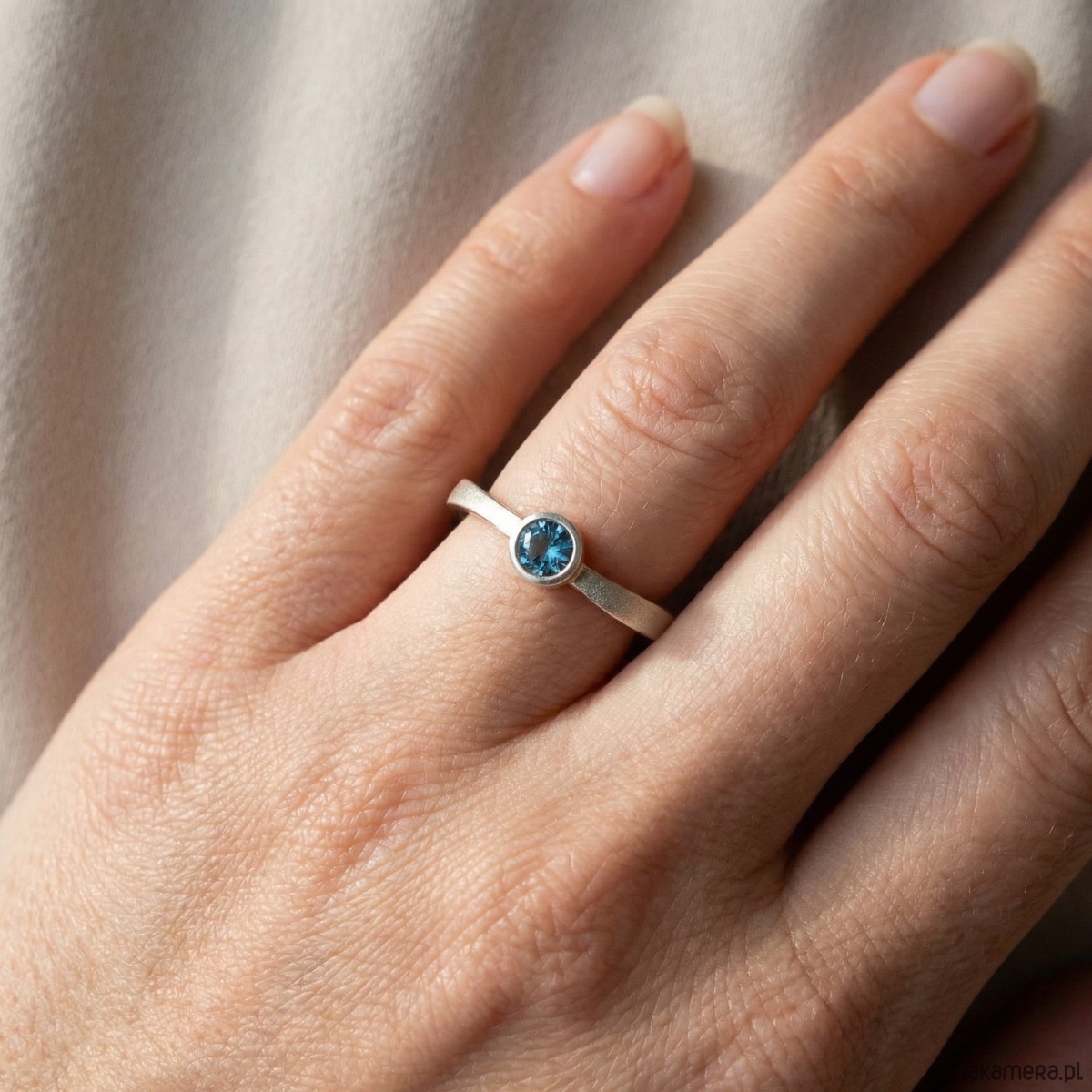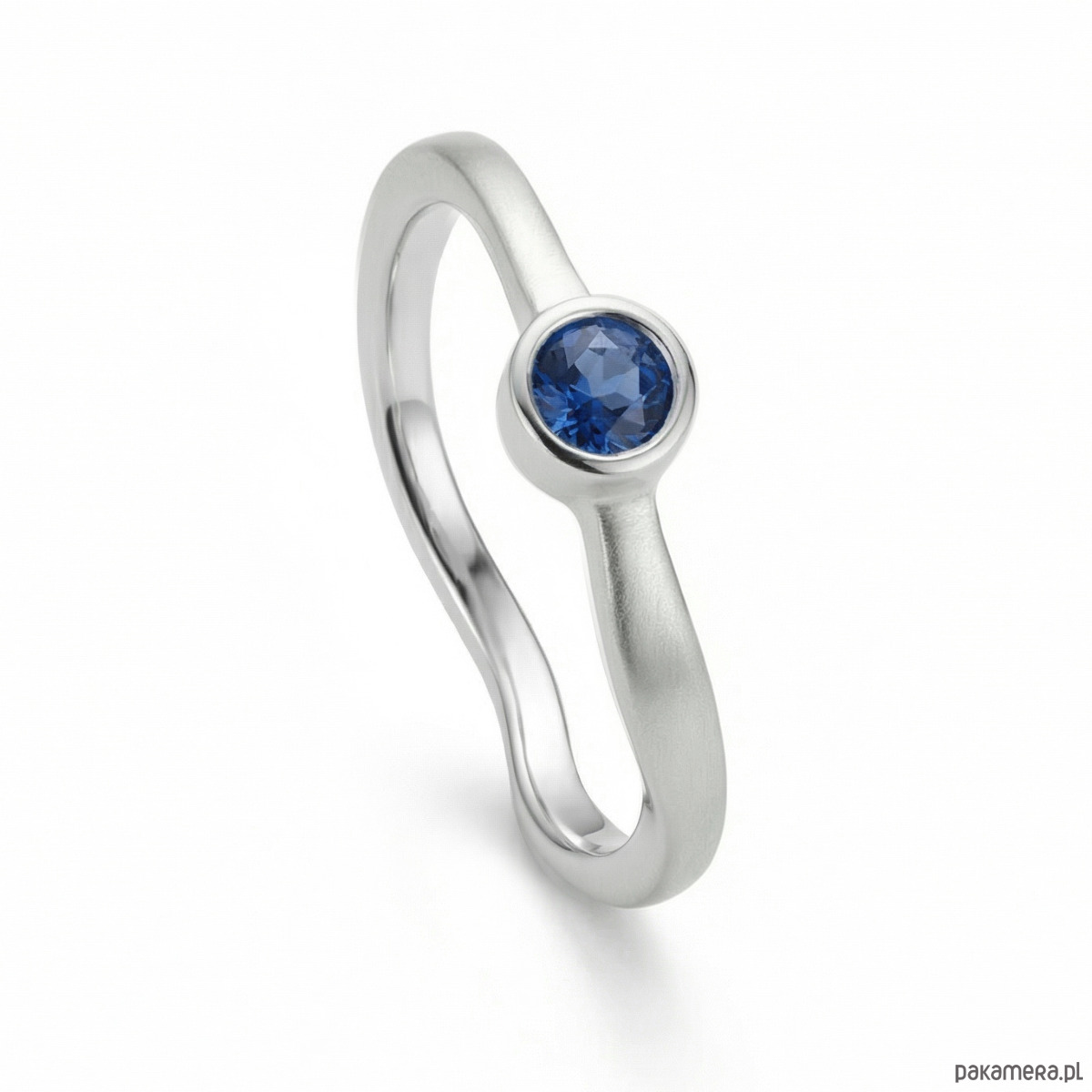 Delikatny pierścionek zaręczynowy z białego złota próby 0,585 z naturalnym szafirem. Szerokość szyny pierścionka waha się między 2 a 3 mm. Jego zewnętrzna powierzchnia jest piaskowana a wewnętrzna wypolerowana. 4 mm szafir to kamień szlachetny symbolizujący wierność, mądrość, prawdę i trwałość uczuć, często nazywany „kamieniem królewskim”. Do produktu dołączony jest certyfikat. Proszę podać swój rozmiar jubilerski lub średnicę wewnętrzną pierścionka po złożeniu zamówienia.