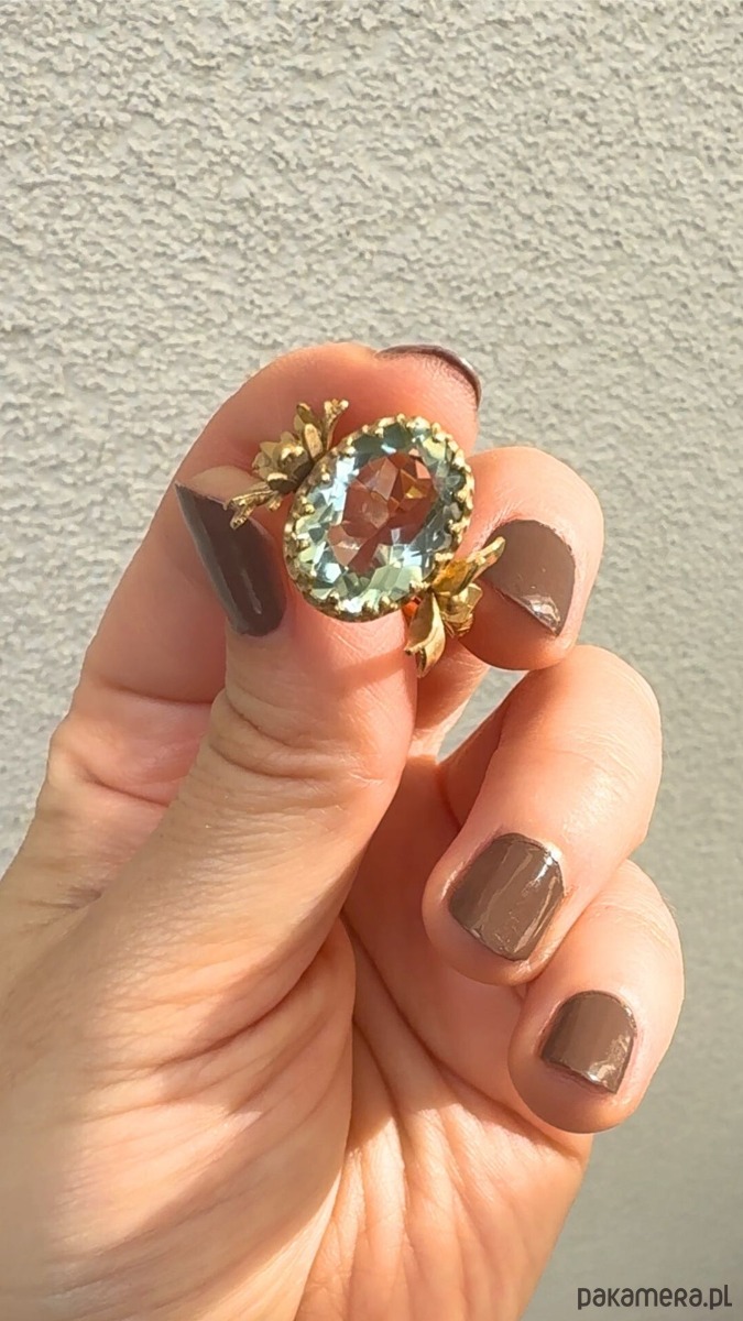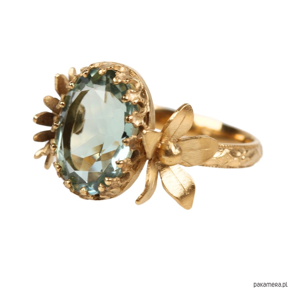 Ręcznie wykonany pierścionek z zielonym ametystem ze srebra pokrytego 24 karatowym złotem z przepięknie fakturowaną obrączką, ozdobną cargą wokół kamienia w stylu Vintage oraz dwoma trójwymiarowymi kwiatami po bokach kamienia.