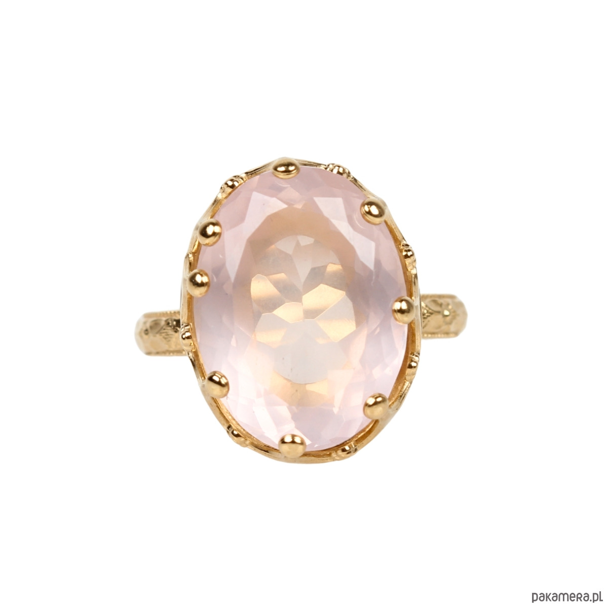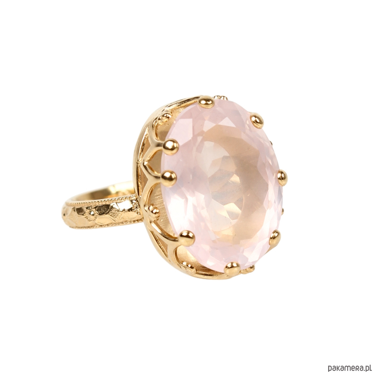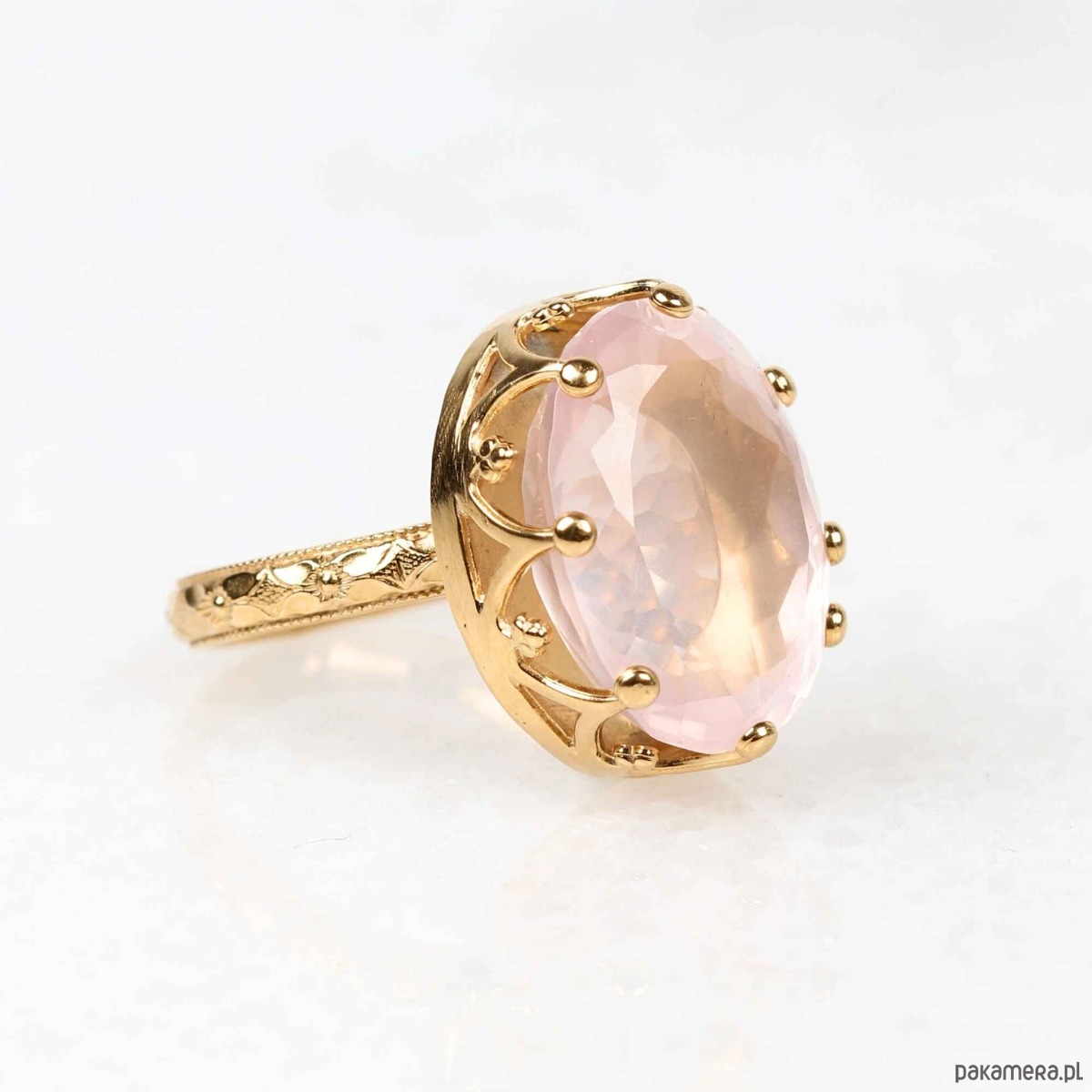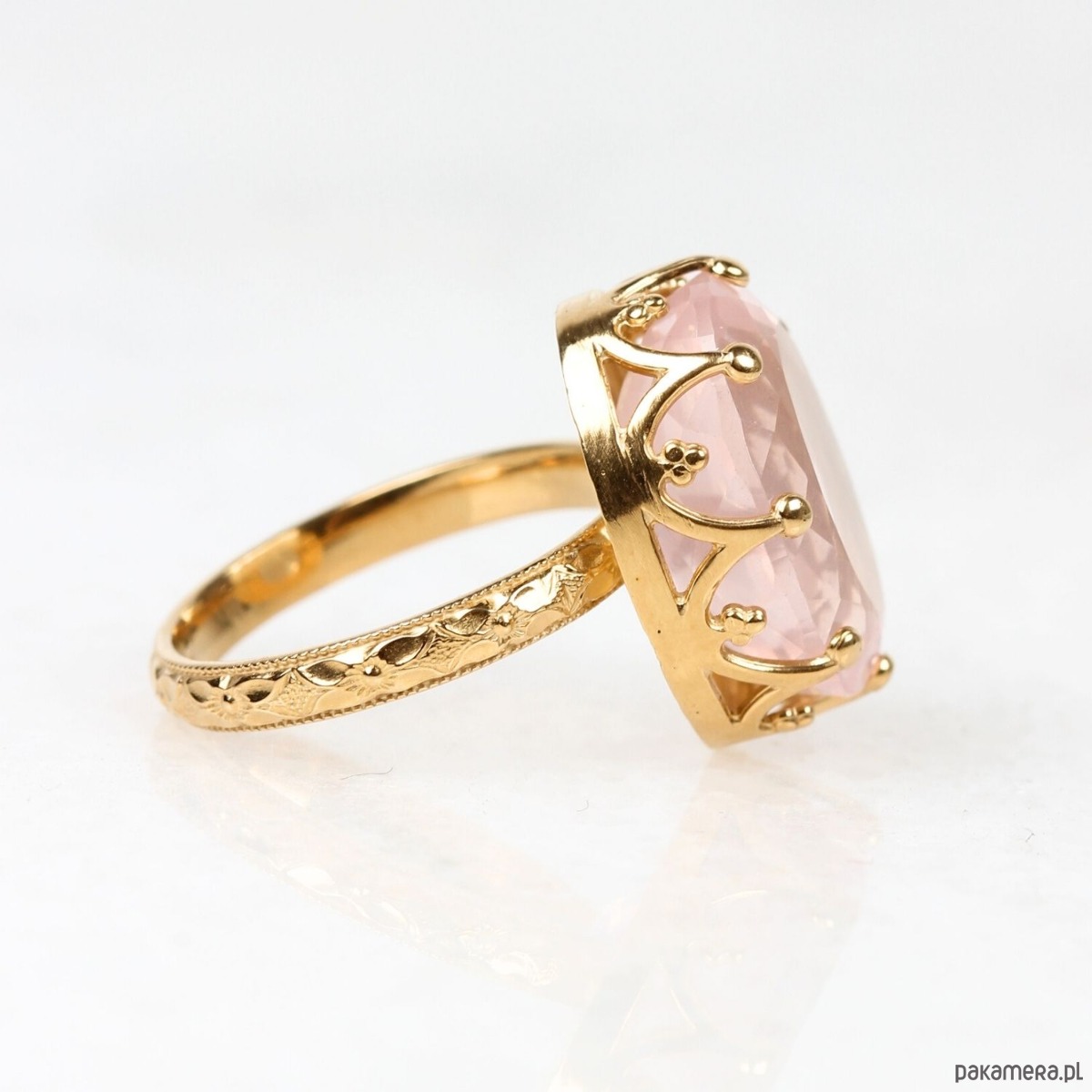 Ręcznie wykonany pierścionek z dużym fasetowanym kwarcem różowym ze srebra pokrytego 24 karatowym złotem z przepięknie fakturowaną obrączką w kwiatowy wzór oraz ozdobną cargą wokół kamienia w stylu Vintage.