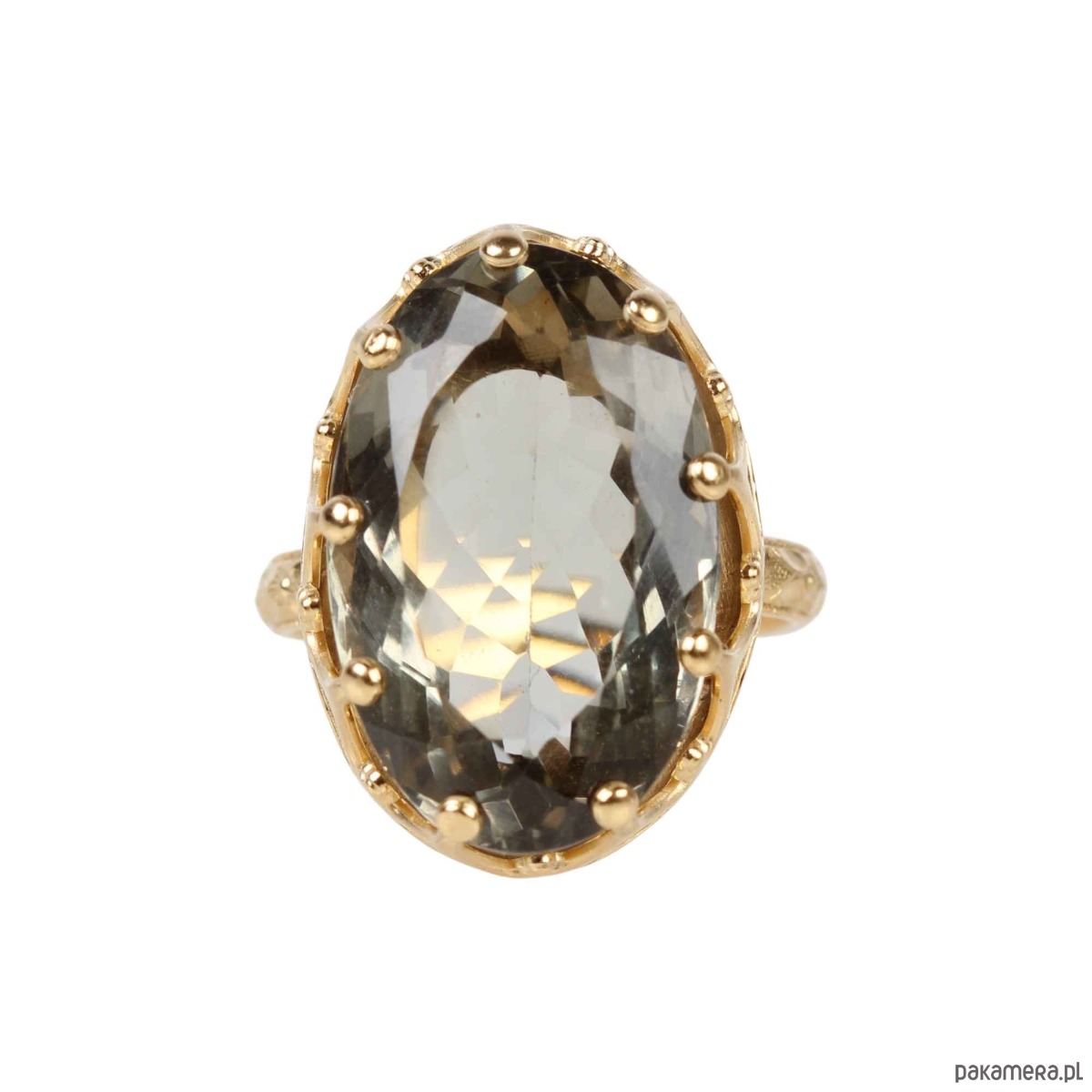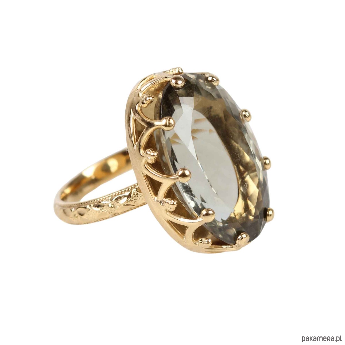Ręcznie wykonany pierścionek z dużym fasetowanym zielonym ametystem (peasiolitem) ze srebra pokrytego 24 karatowym złotem z przepięknie fakturowaną obrączką w kwiatowy wzór oraz ozdobną cargą wokół kamienia w stylu Vintage.