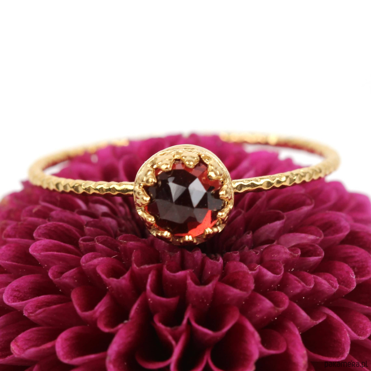 Ręcznie wykonany pierścionek z granatem ze srebra pokrytego 24-karatowym złotem z przepięknie fakturowaną obrączką i ozdobną cargą wokół kamienia w stylu Vintage.