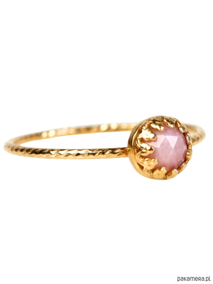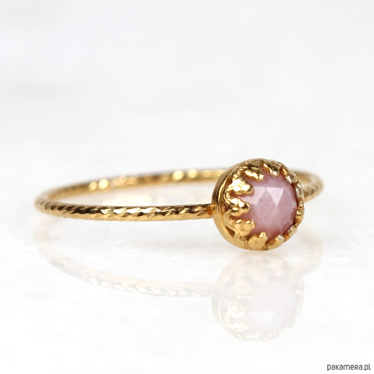 Ręcznie wykonany pierścionek z opalem różowym ze srebra pokrytego 24-karatowym złotem z przepięknie fakturowaną obrączką i ozdobną cargą wokół kamienia w stylu Vintage.