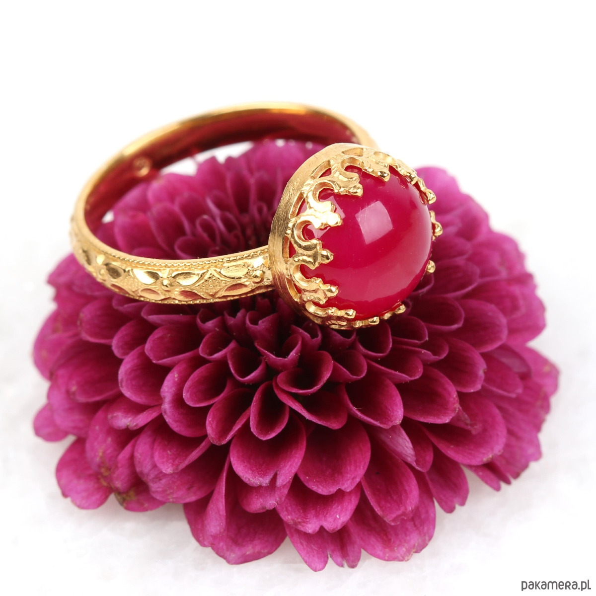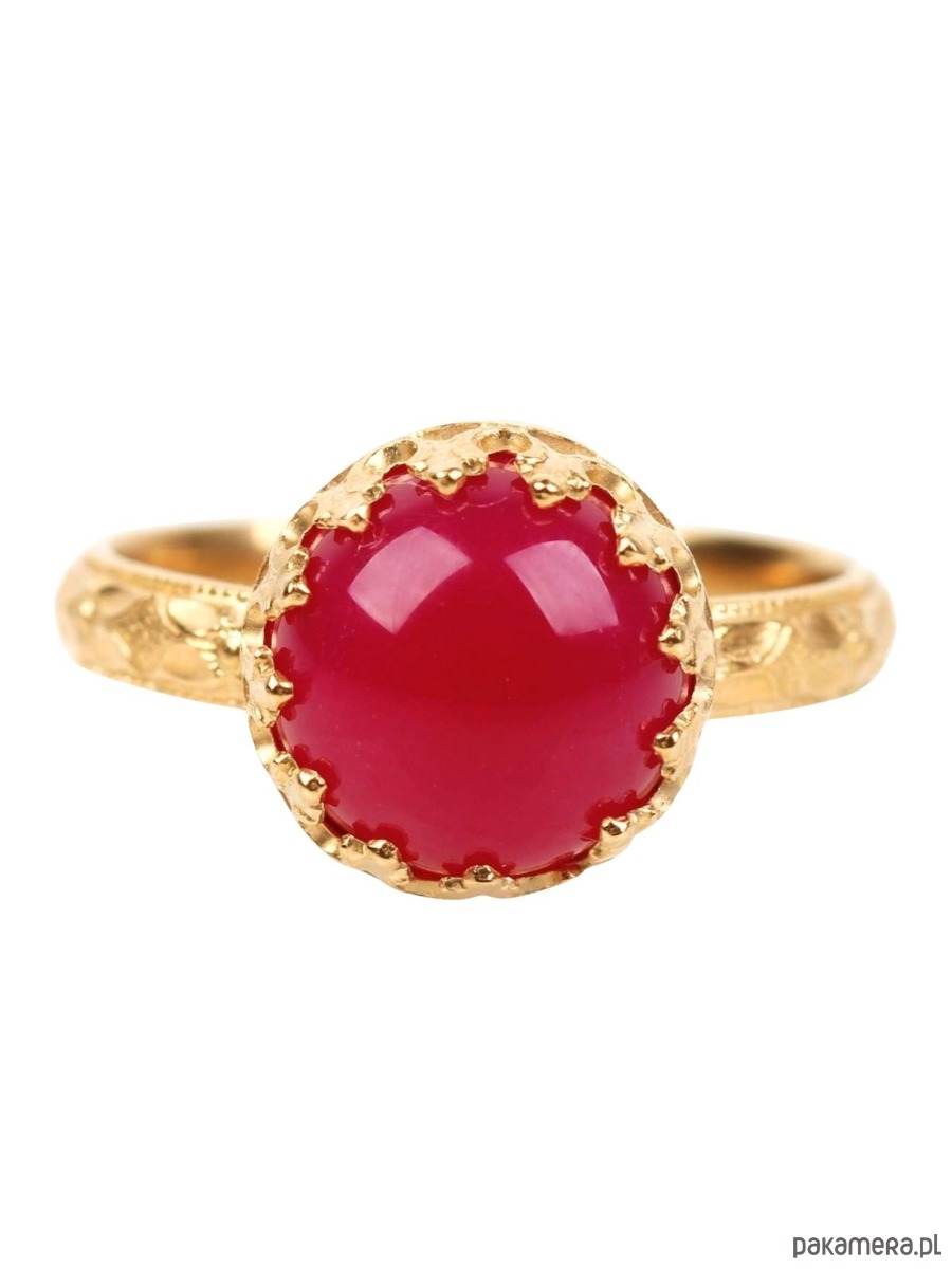 Ręcznie wykonany pierścionek z agatem w kolorze fuksji ze srebra pokrytego 24 karatowym złotem z przepięknie fakturowaną obrączką i ozdobną cargą wokół kamienia w stylu Vintage. Spód pierścionka ozdobiony kwiatami aby dodać mu jeszcze bardziej unikatowego charakteru (każdy egzemplarz jest zdobiony w inny sposób:)