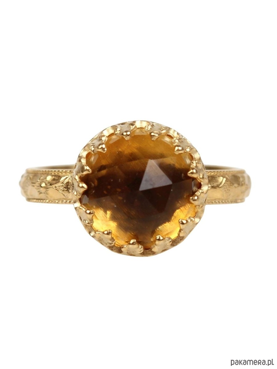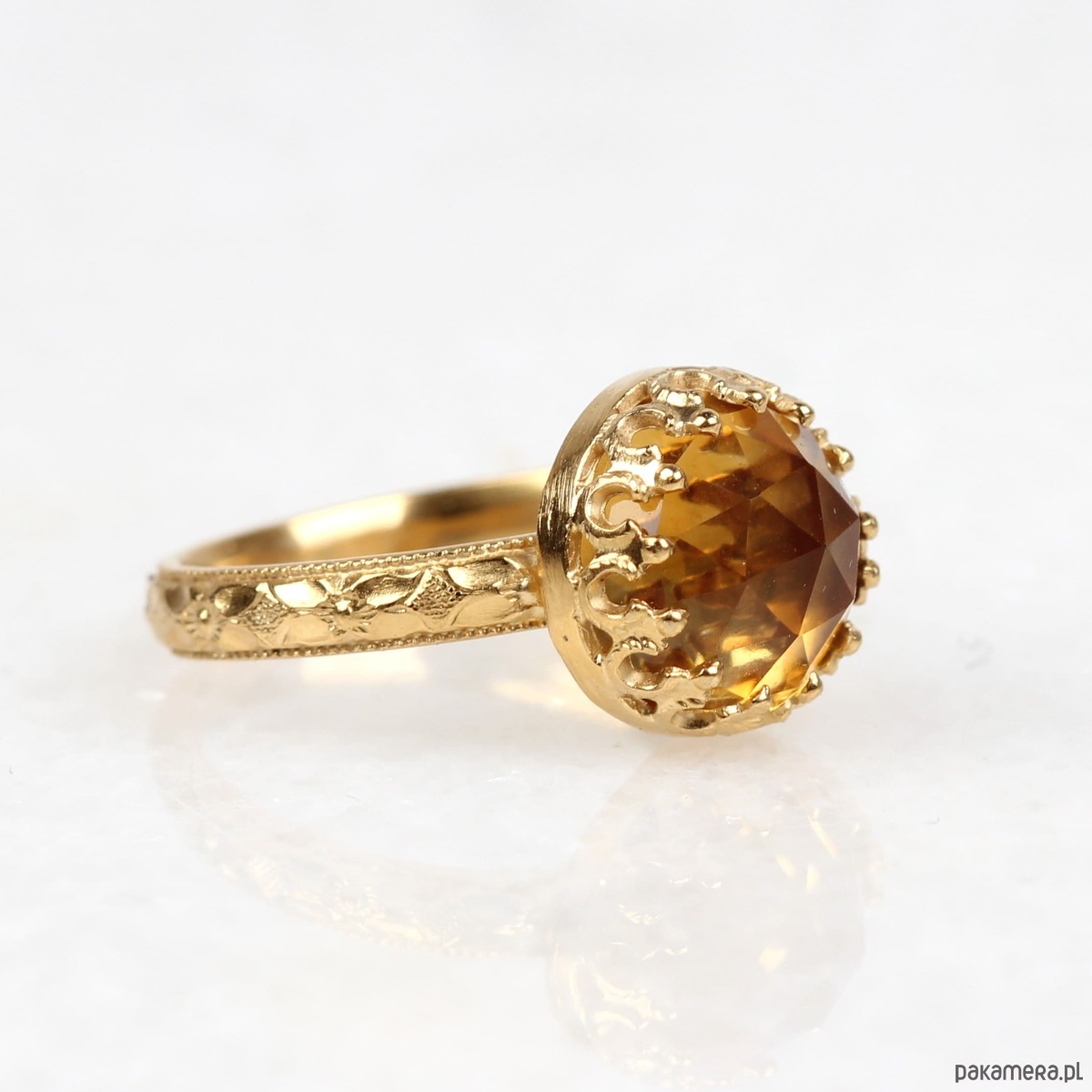 Ręcznie wykonany pierścionek z cytrynem ze srebra pokrytego 24 karatowym złotem z przepięknie fakturowaną obrączką i ozdobną cargą wokół kamienia w stylu Vintage. Spód pierścionka ozdobiony kwiatami aby dodać mu jeszcze bardziej unikatowego charakteru (każdy egzemplarz jest zdobiony w inny sposób:)