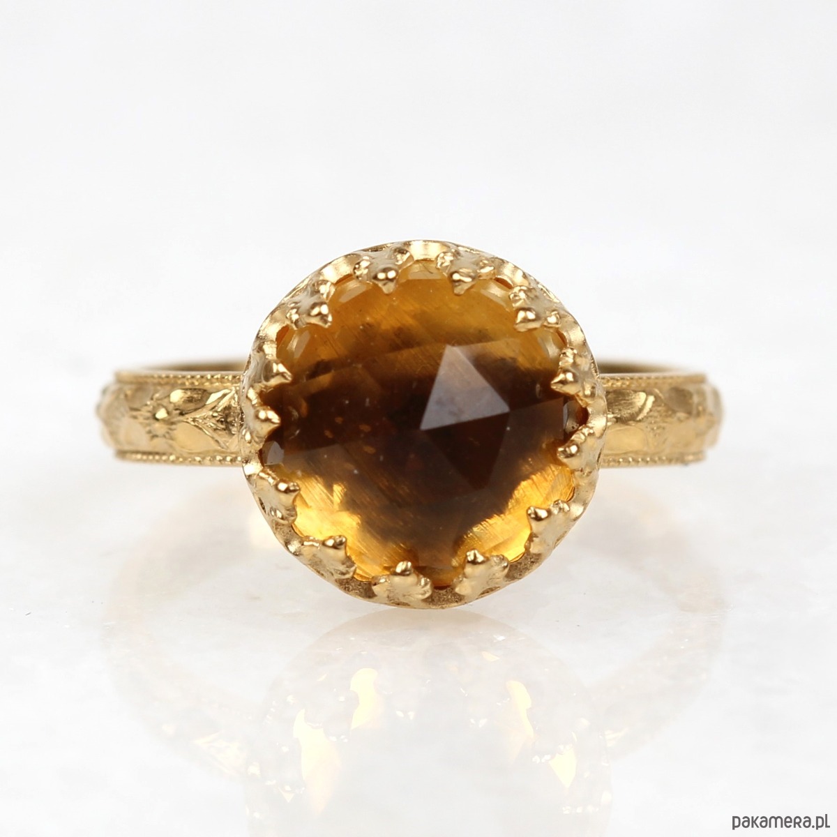 Ręcznie wykonany pierścionek z cytrynem ze srebra pokrytego 24 karatowym złotem z przepięknie fakturowaną obrączką i ozdobną cargą wokół kamienia w stylu Vintage. Spód pierścionka ozdobiony kwiatami aby dodać mu jeszcze bardziej unikatowego charakteru (każdy egzemplarz jest zdobiony w inny sposób:)