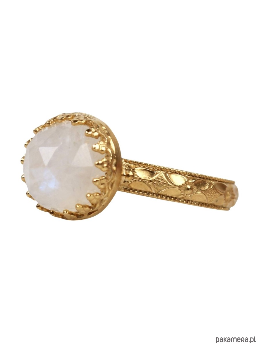 Ręcznie wykonany pierścionek z kamieniem księżycowym ze srebra pokrytego 24 karatowym złotem z przepięknie fakturowaną obrączką i ozdobną cargą wokół kamienia w stylu Vintage. Spód pierścionka ozdobiony kwiatami aby dodać mu jeszcze bardziej unikatowego charakteru (każdy egzemplarz jest zdobiony w inny sposób:)