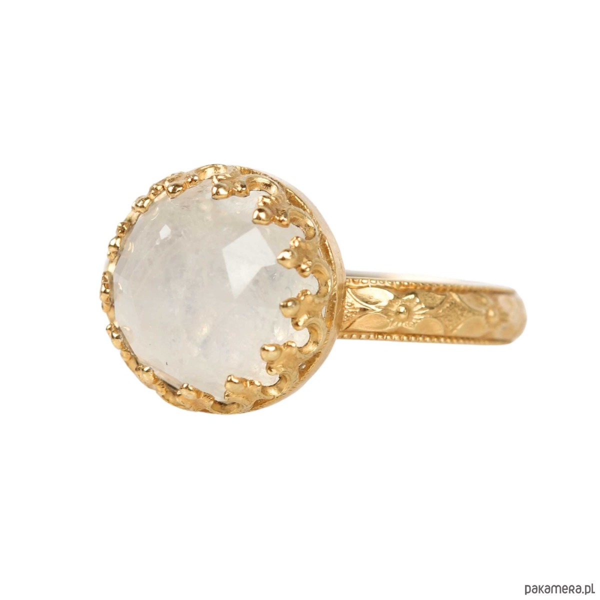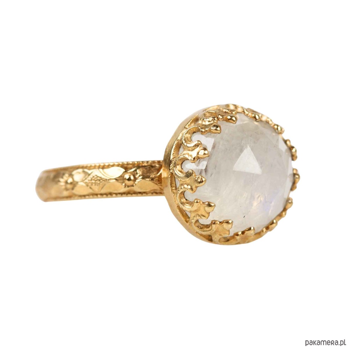 Ręcznie wykonany pierścionek z kamieniem księżycowym ze srebra pokrytego 24 karatowym złotem z przepięknie fakturowaną obrączką i ozdobną cargą wokół kamienia w stylu Vintage. Spód pierścionka ozdobiony kwiatami aby dodać mu jeszcze bardziej unikatowego charakteru (każdy egzemplarz jest zdobiony w inny sposób:)