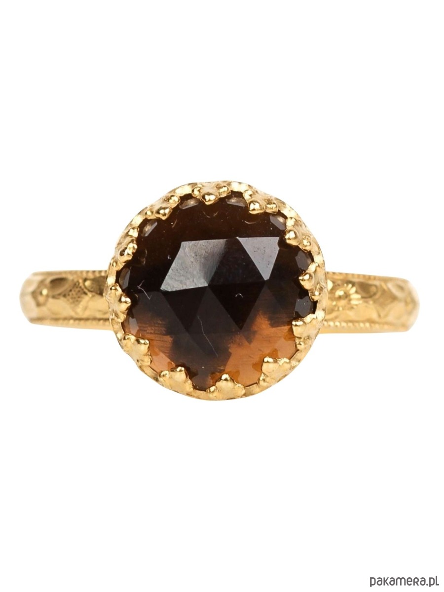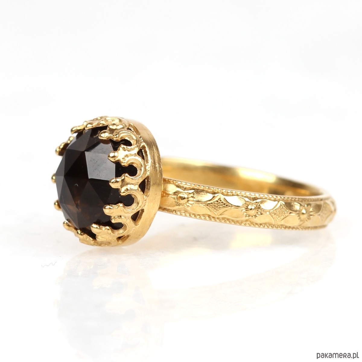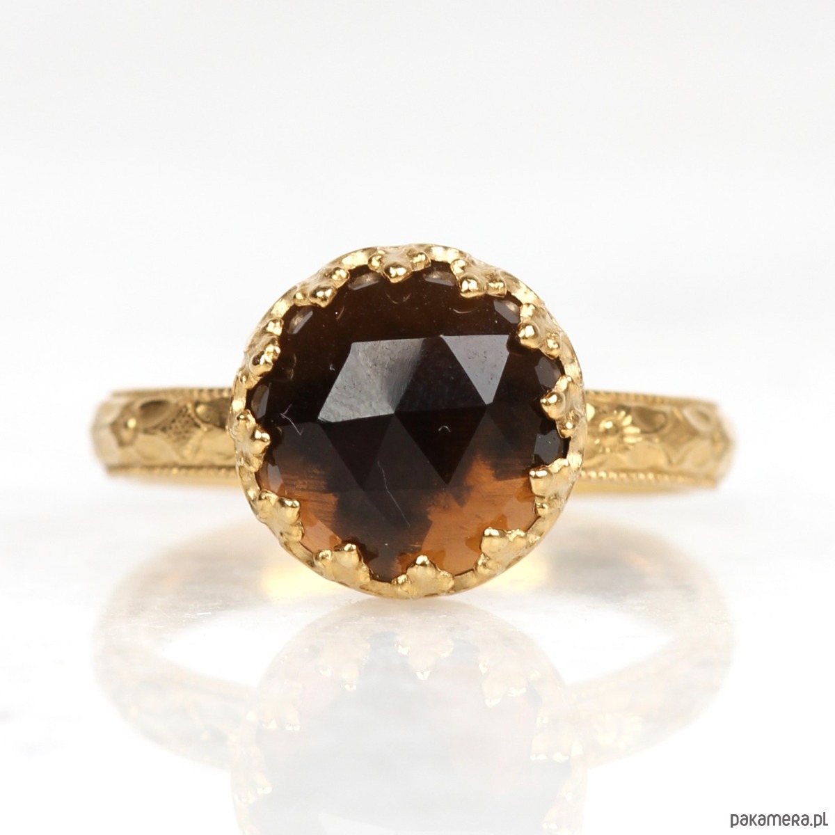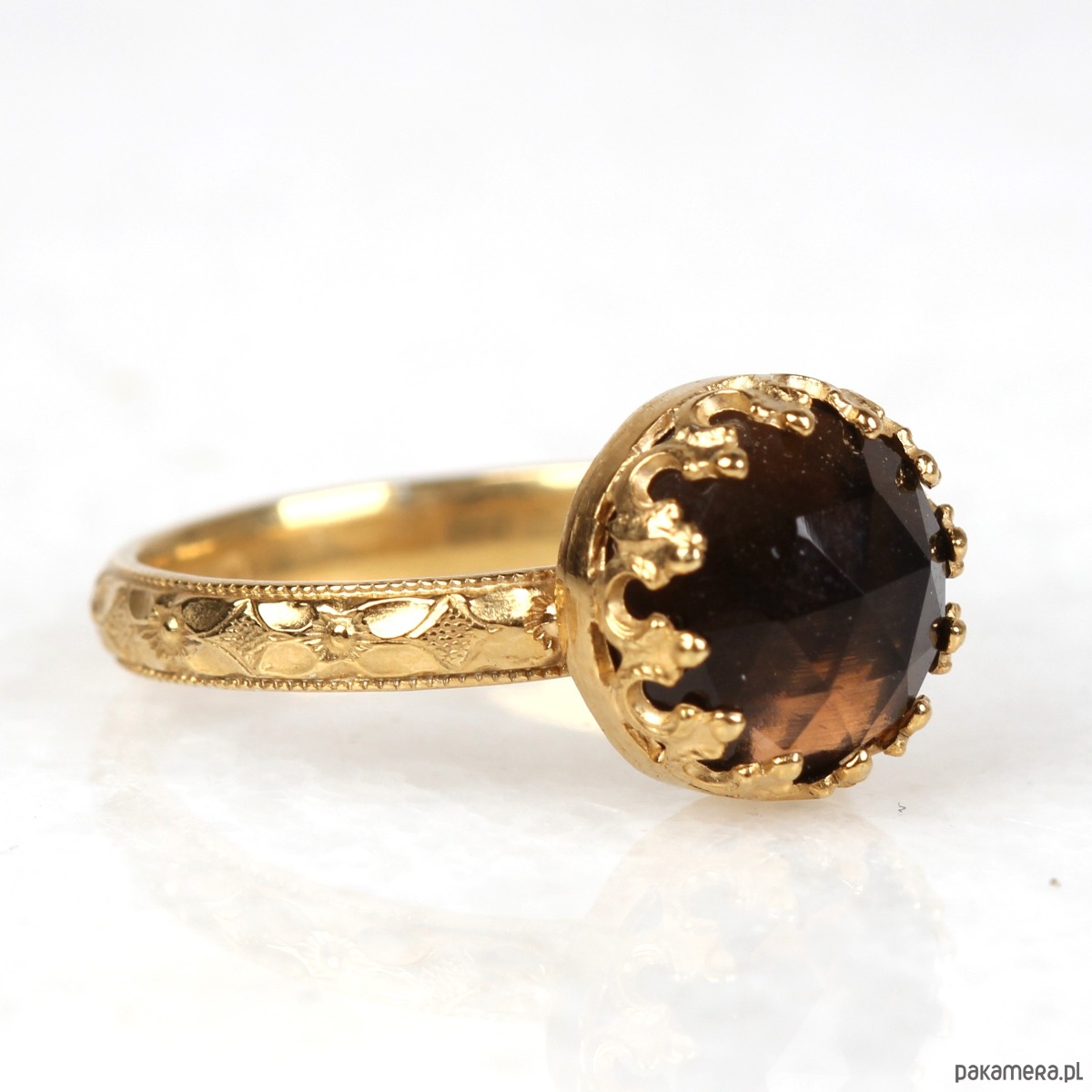 Ręcznie wykonany pierścionek z kwarcem dymnym ze srebra pokrytego 24 karatowym złotem z przepięknie fakturowaną obrączką i ozdobną cargą wokół kamienia w stylu Vintage. Spód pierścionka ozdobiony kwiatami aby dodać mu jeszcze bardziej unikatowego charakteru (każdy egzemplarz jest zdobiony w inny sposób:)