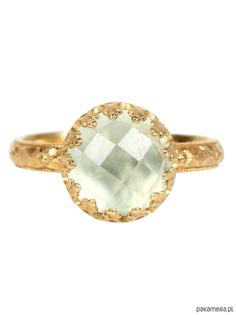 Ręcznie wykonany pierścionek z prehnitem ze srebra pokrytego 24 karatowym złotem z przepięknie fakturowaną obrączką i ozdobną cargą wokół kamienia w stylu Vintage. Spód pierścionka ozdobiony kwiatami aby dodać mu jeszcze bardziej unikatowego charakteru (każdy egzemplarz jest zdobiony w inny sposób:)