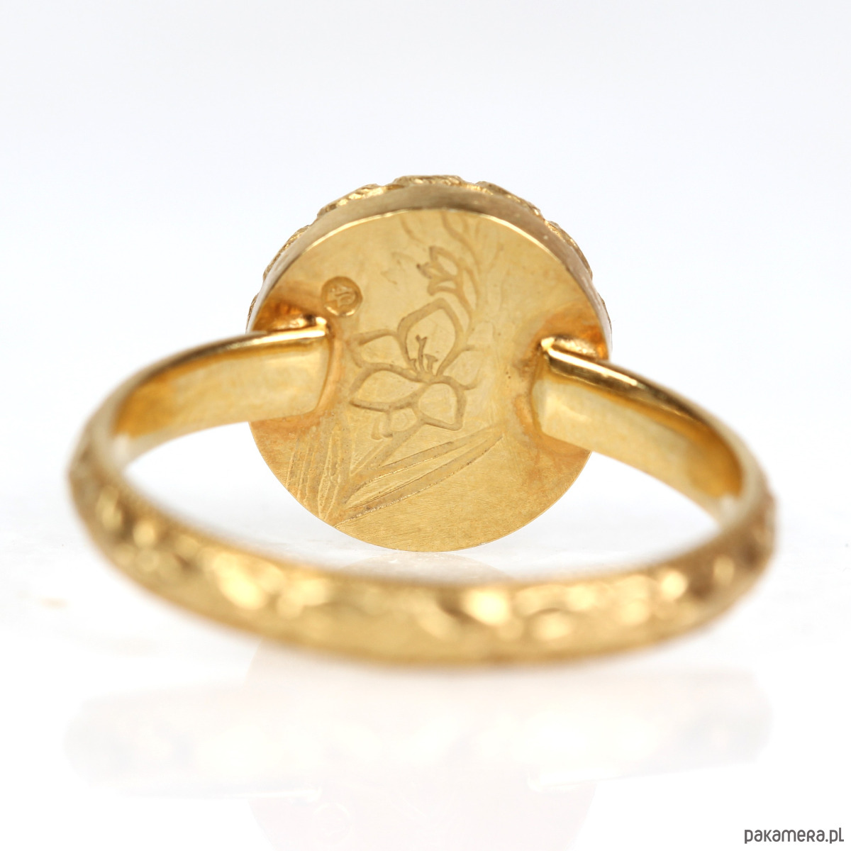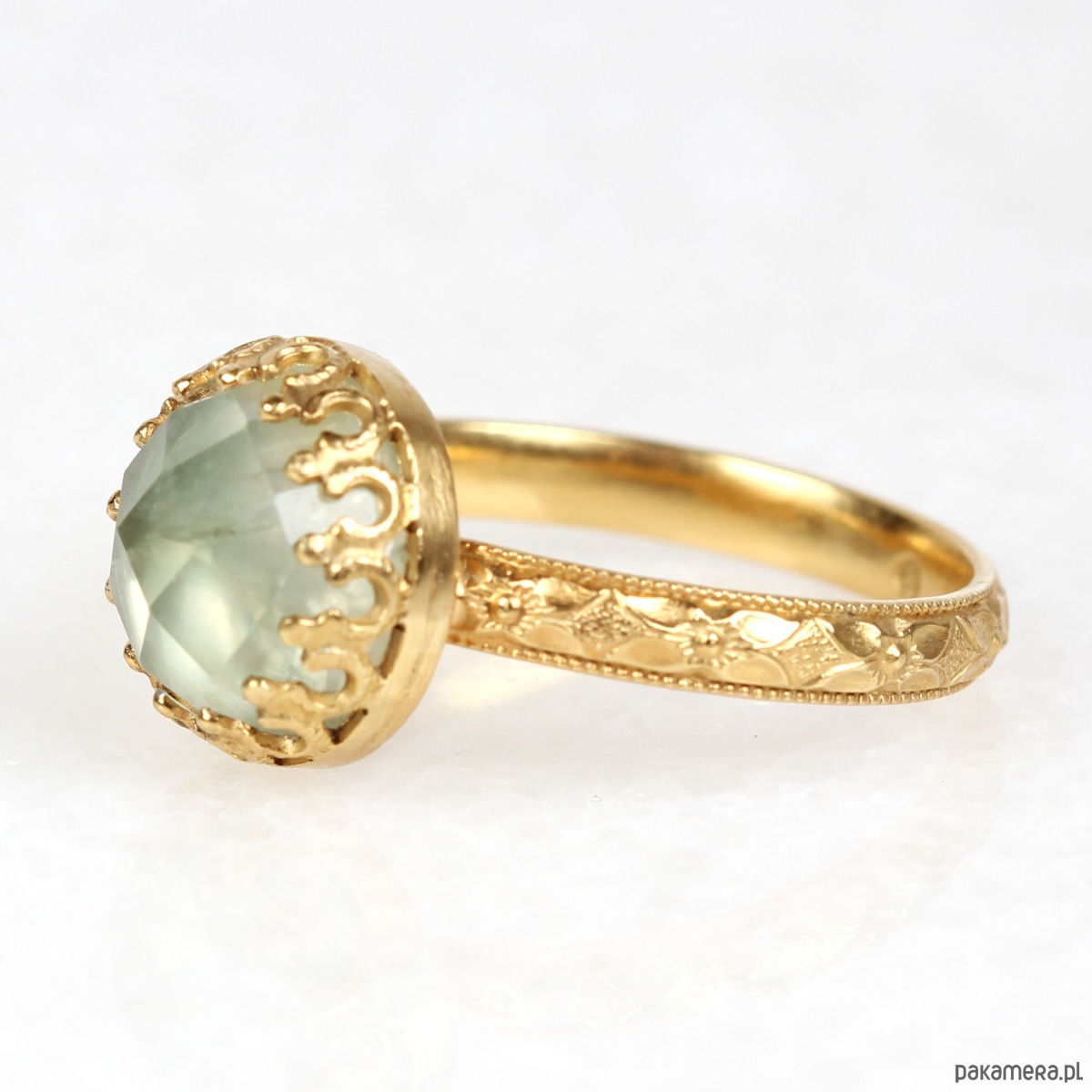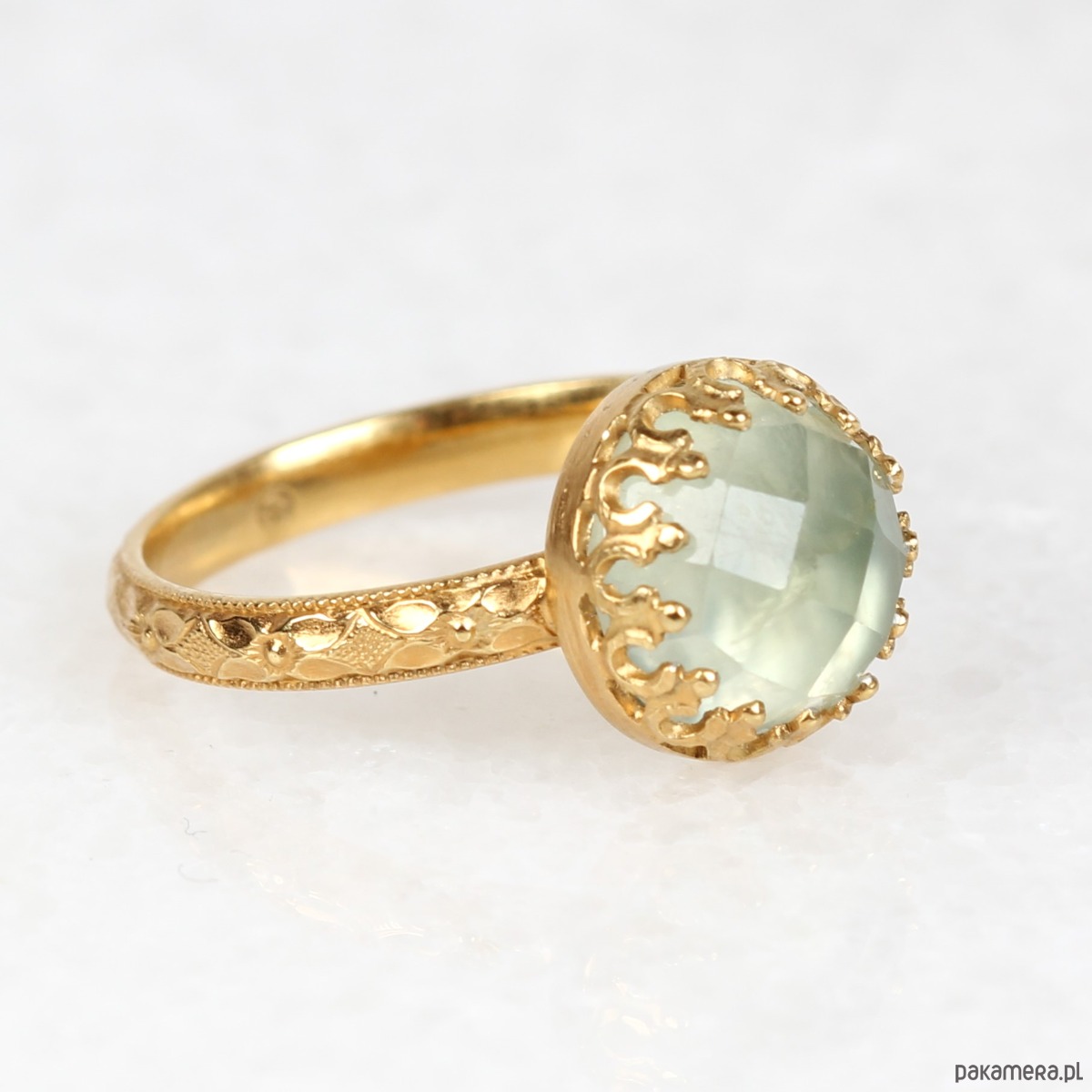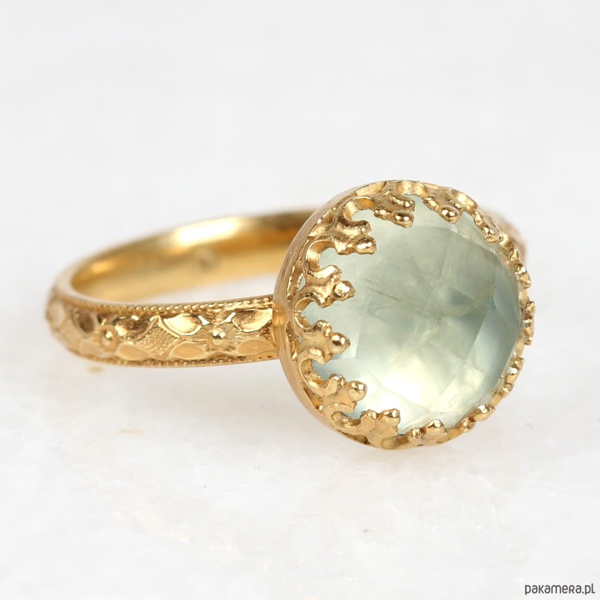 Ręcznie wykonany pierścionek z prehnitem ze srebra pokrytego 24 karatowym złotem z przepięknie fakturowaną obrączką i ozdobną cargą wokół kamienia w stylu Vintage. Spód pierścionka ozdobiony kwiatami aby dodać mu jeszcze bardziej unikatowego charakteru (każdy egzemplarz jest zdobiony w inny sposób:)