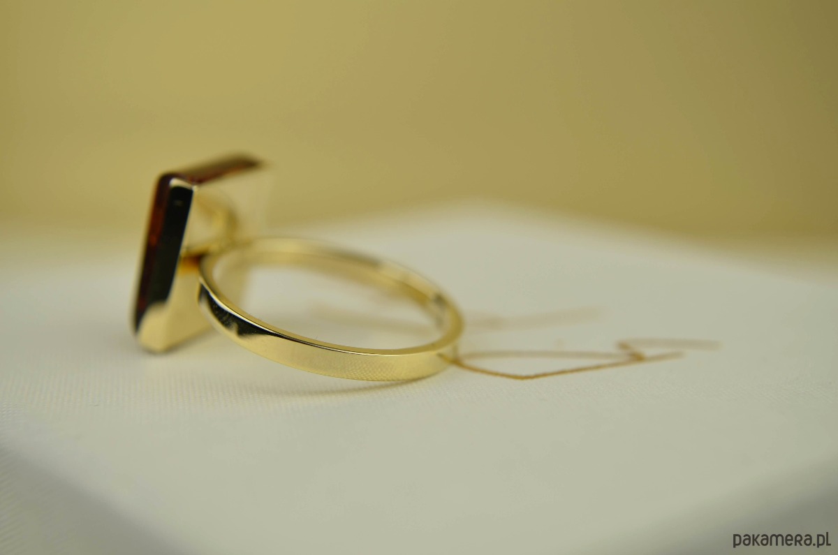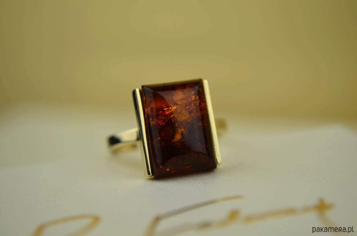 Prostokąt z koniakowego bursztynu złapałam w złote ramy i umieściłam na solidnej obrączce, żeby mógł towarzyszyć swojej właścicielce każdego dnia. Niezwykle eleganckie połączenie nasyconej koniakowej barwy bursztynu i żółtego złota cieszy wzrok, a prosta forma pierścionka sprawia, że nigdy nie wyjdzie z mody.