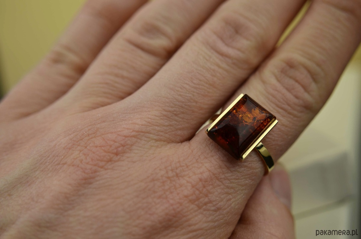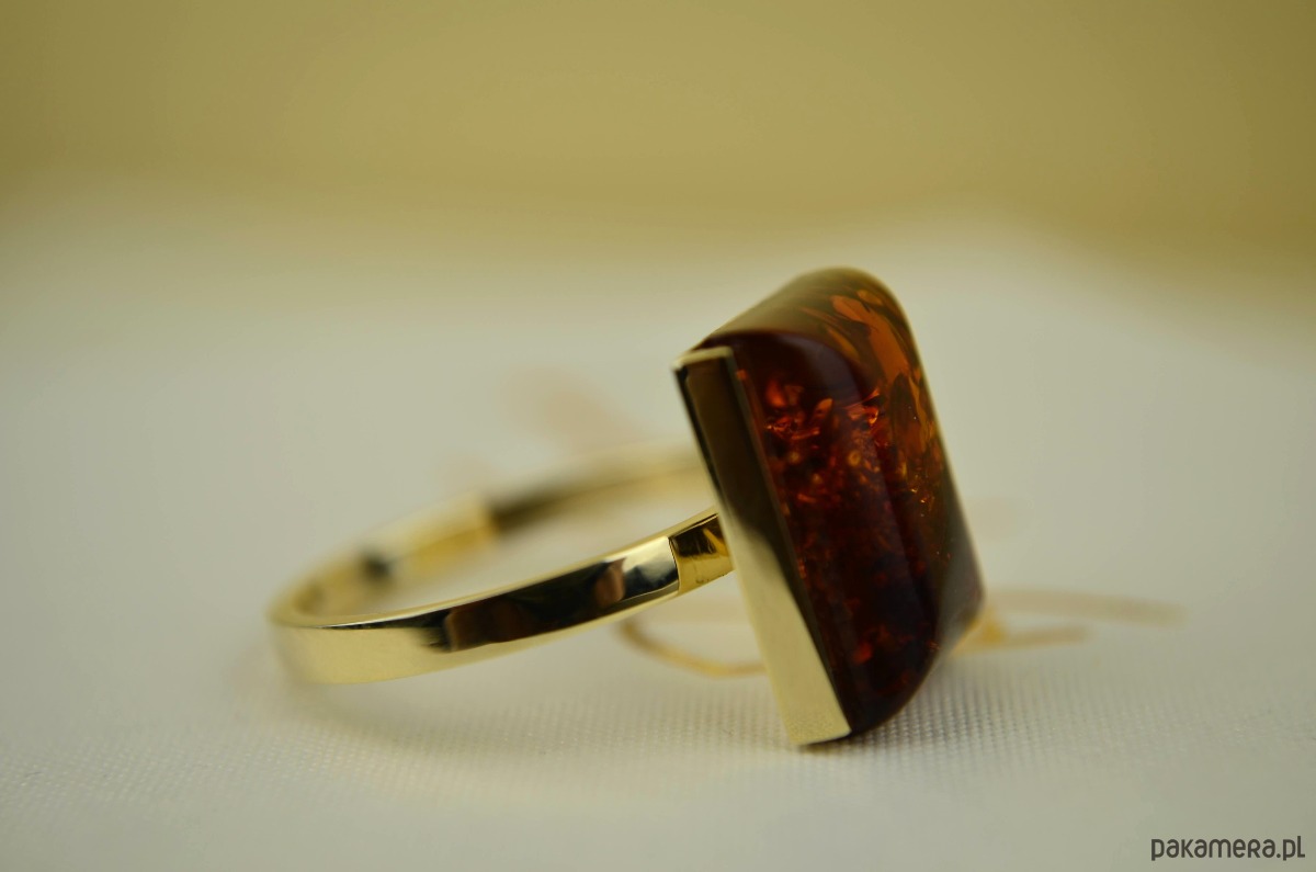 Złoty pierścionek z koniakowym bursztynem pr. 585