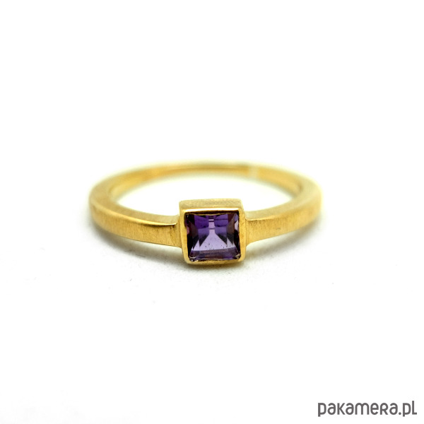 Pierścionek srebrny pozłacany z dużym kwadratowym ametystem 4x4 mm. Sama obrączka jest szeroka na 2 mm. Geometryczny pierścionek jest pozłocony czystym złotem Au 0,999.