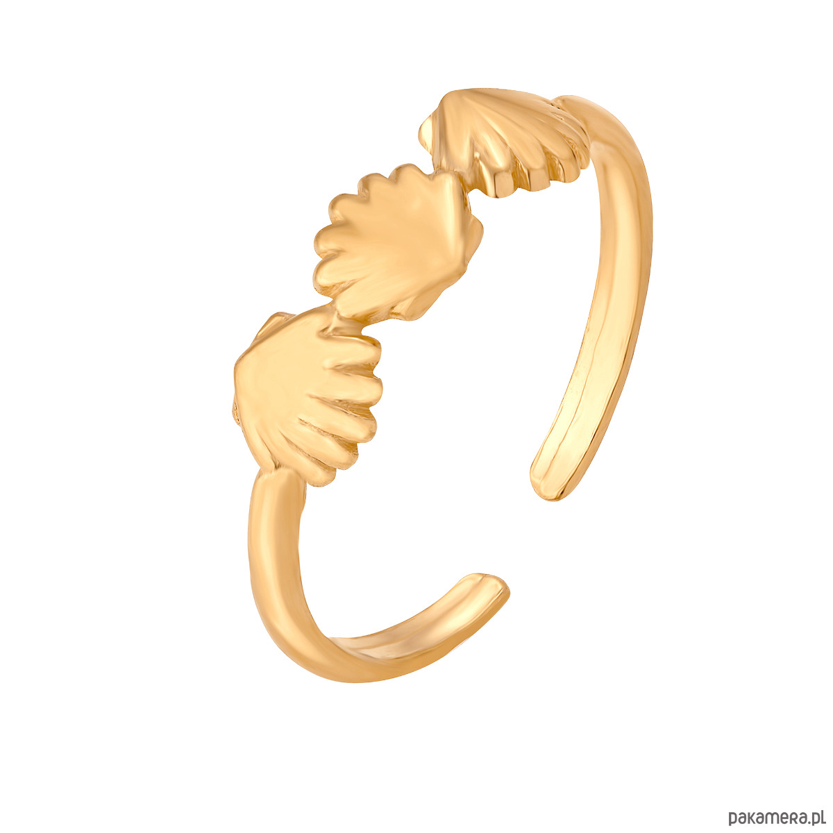 Złoty pierścionek zdobiony muszelkami. Wszystkie elementy wykonane ze srebra 925 powlekanego 24 karatowym żółtym złotem.