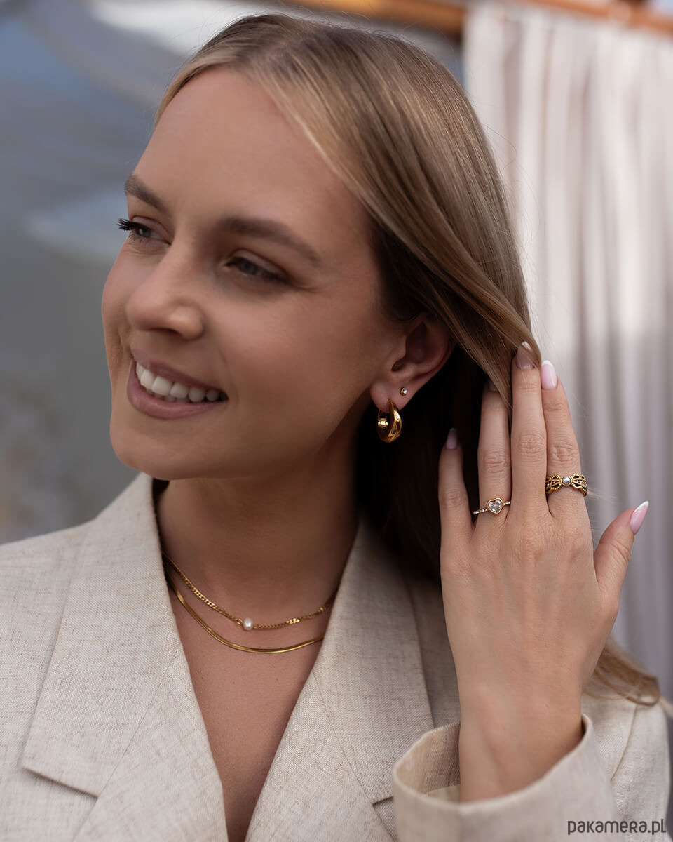 Ten złoty pierścionek ze stali chirurgicznej z sercem z cyrkonii to doskonały wybór dla kobiet, które kochają subtelną, ale błyszczącą biżuterię. Delikatny kształt serca i rząd iskrzących kamieni sprawiają, że całość wygląda niezwykle romantycznie i elegancko. To idealny pierścionek na prezent dla dziewczyny, żony lub... samej siebie.Wymiary:Wysokość serca: 0,8 cmŚrednica wewnętrzna pierścionka: 1,7 cmWaga: 2,3 g - lekki, wygodny, niemal niewyczuwalny na dłoniMateriał: stal chirurgiczna premium + cyrkonieWodoodporny i hipoalergiczny - idealny nawet dla wrażliwej skóryDlaczego warto go mieć?- Złoty pierścionek z sercem, który nie ciemnieje - dzięki stali chirurgicznej możesz nosić go codziennie- Nie uczula - odpowiedni nawet dla osób z wrażliwą skórą- Cyrkonie pięknie odbijają światło - wyglądają jak prawdziwe diamenty- Świetny wybór na prezent z okazji walentynek, rocznicy lub urodzin