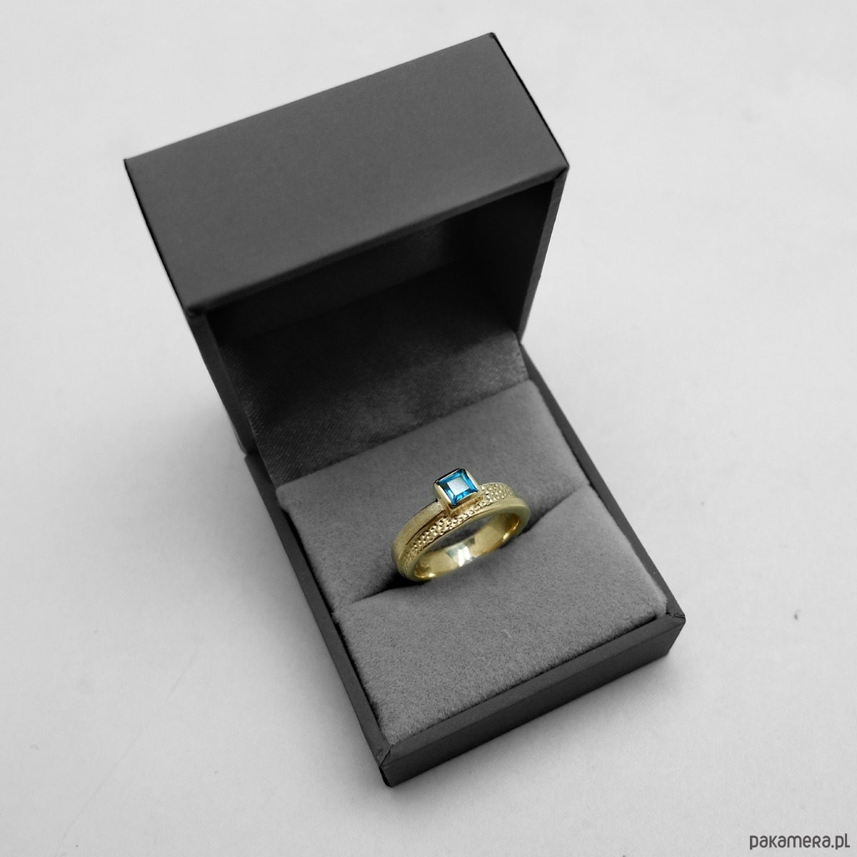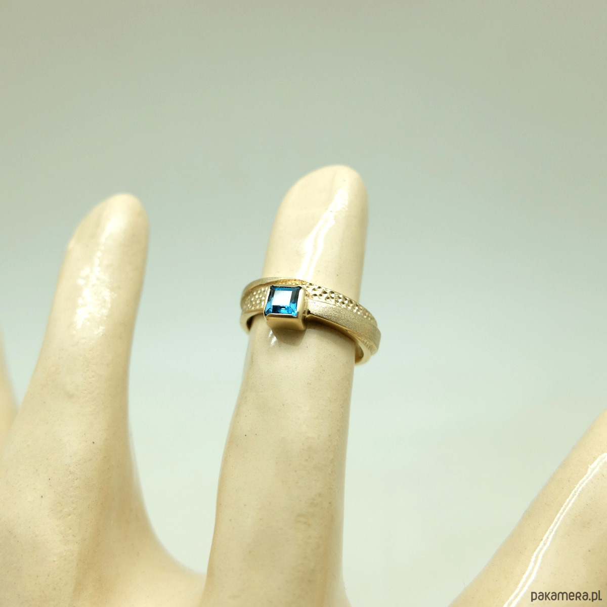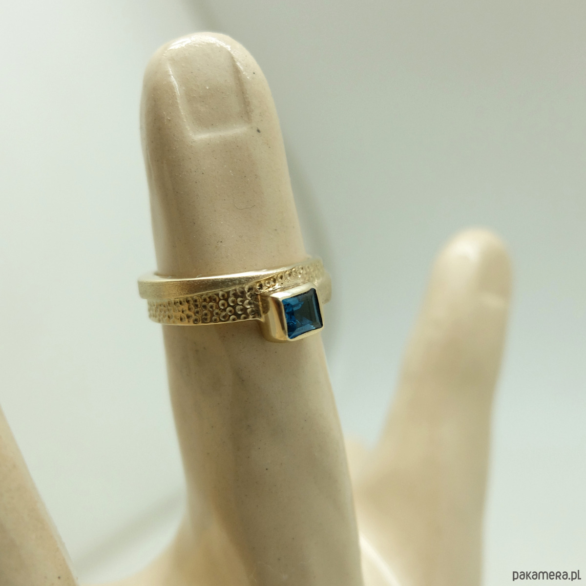 Pierścionek z żółtego złota próby 0,585 z kwadratowym topazem London o boku 4 mm. Pierścionek jest szeroki na 6 mm. Jego powierzchnia jest delikatnie satynowana na zewnątrz i polerowana wewnątrz. Do produktu dołączony jest certyfikat autentyczności.