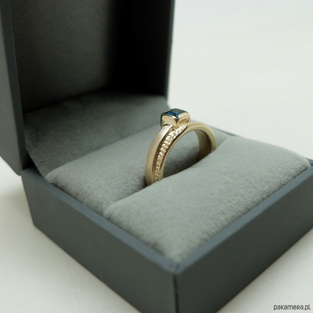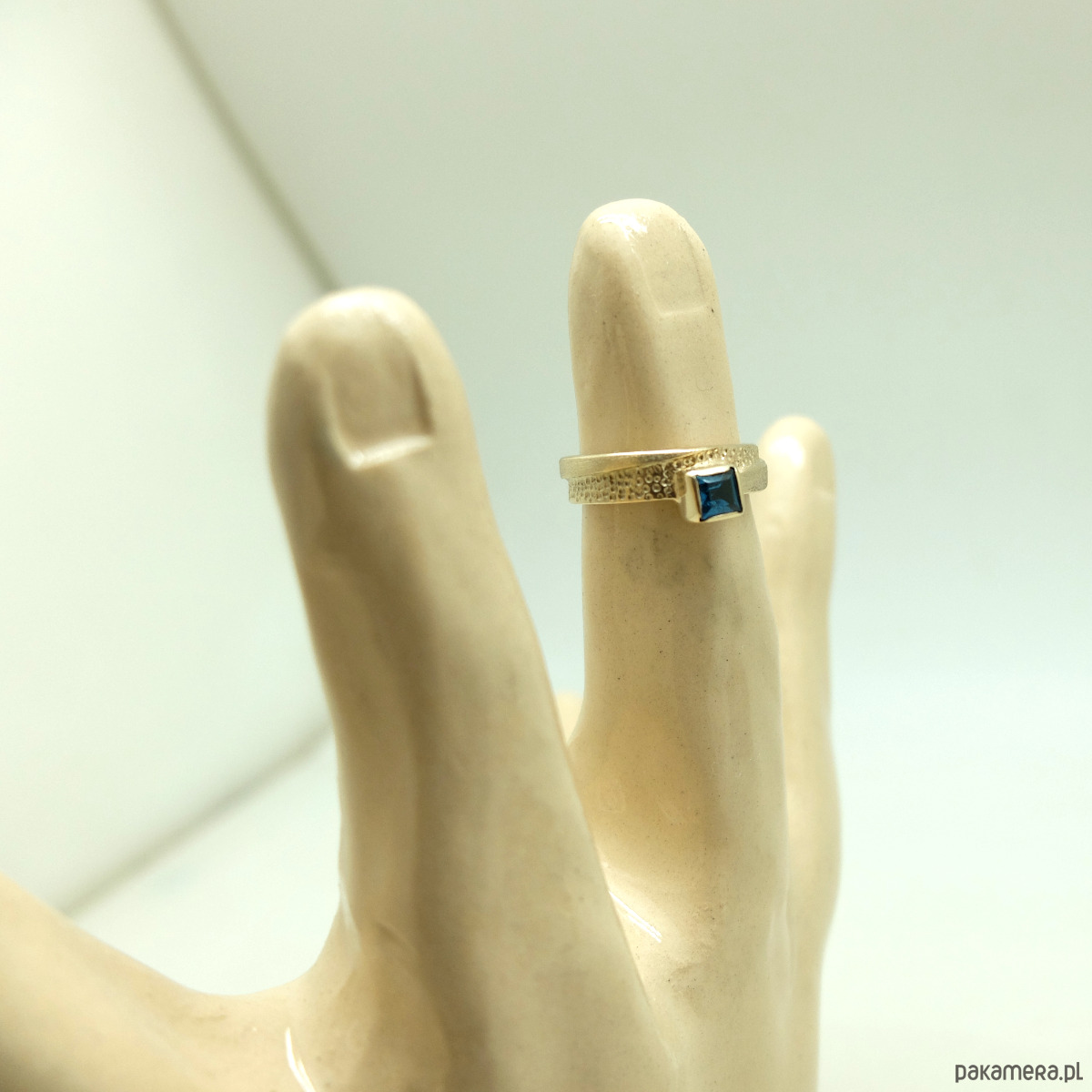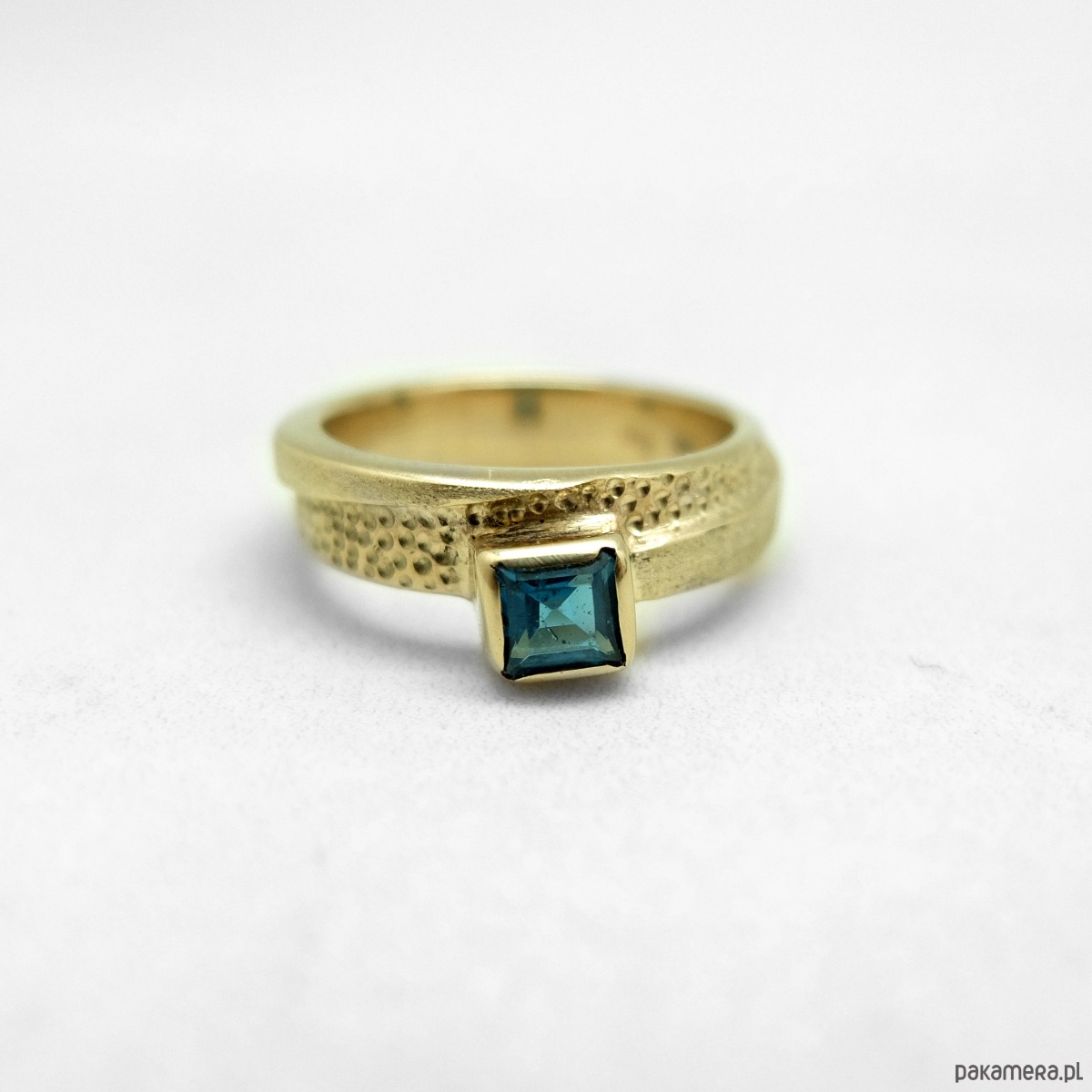 Pierścionek z żółtego złota próby 0,585 z kwadratowym topazem London o boku 4 mm. Pierścionek jest szeroki na 6 mm. Jego powierzchnia jest delikatnie satynowana na zewnątrz i polerowana wewnątrz. Do produktu dołączony jest certyfikat autentyczności.