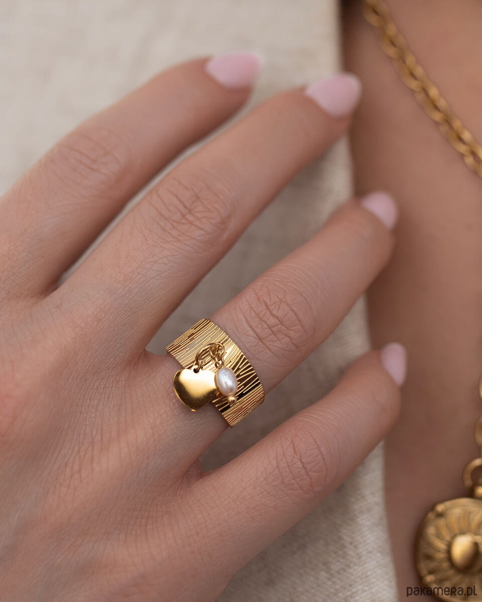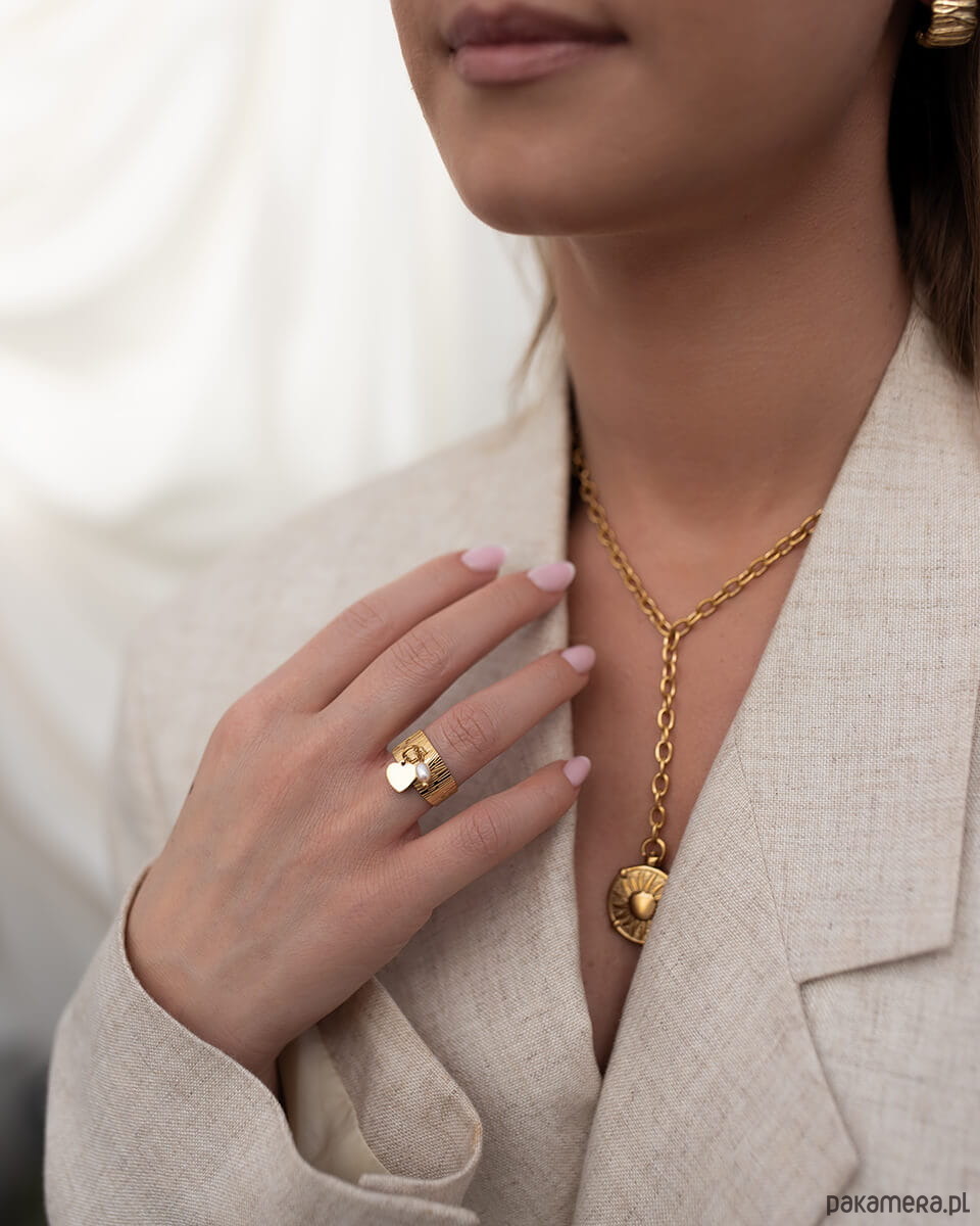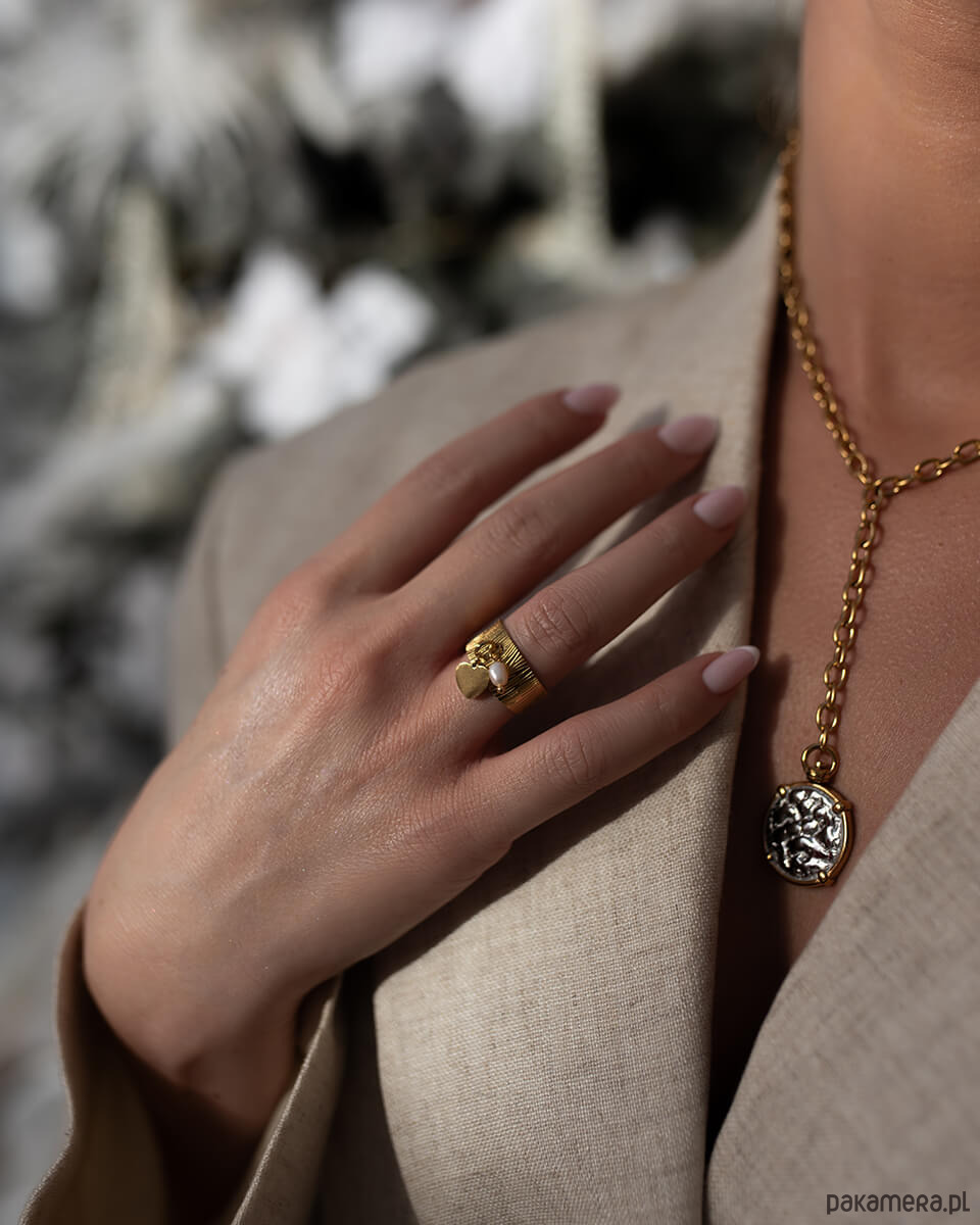 Jeśli szukasz nietuzinkowego pierścionka, który przyciąga spojrzenia wyjątkową formą, model Isara będzie idealnym wyborem. Ten projekt zachwyca detalem, który ożywia całą stylizację. Mała, swobodnie poruszająca się zawieszka nadaje mu lekkości i zmysłowości, czyniąc go doskonałą ozdobą kobiecej dłoni.To pierścionek dla kobiet, które szukają dodatków z charakterem – nieoczywistych, nowoczesnych, a jednocześnie bardzo eleganckich.Dlaczego warto?Wykonany ze stali szlachetnej (chirurgicznej) – nie ciemnieje, nie rdzewieje, nie uczulaZłota powłoka nanoszona metodą PVD – odporna na ścieranie, wodę i codzienne użytkowanieSubtelny wisiorek – nadaje biżuterii dynamiki i lekkościPonadczasowy design – pasuje zarówno do minimalistycznych, jak i eleganckich stylizacjiIdealny jako pierścionek na prezent dla kobiety, która kocha oryginalną, ale trwałą biżuterięJeśli zastanawiasz się jaka biżuteria nie ciemnieje, właśnie znalazłaś odpowiedź. Dzięki właściwościom stali szlachetnej możesz nosić ten pierścionek codziennie – bez obaw o blaknięcie, zmianę koloru czy reakcje alergiczne.Isara to świetny wybór dla kobiet, które:– cenią modne i trwałe dodatki na co dzień– chcą dodać oryginalnego akcentu swoim codziennym stylizacjom– szukają trwałej alternatywy dla biżuterii z sieciówek– chcą nosić biżuterię bez zdejmowania – nawet na siłownię, pod prysznic czy na basenPostaw na biżuterię, która nie tylko wygląda zjawiskowo, ale też zostaje z Tobą na długo. Isara to połączenie trwałości i kobiecego uroku w najlepszym wydaniu.