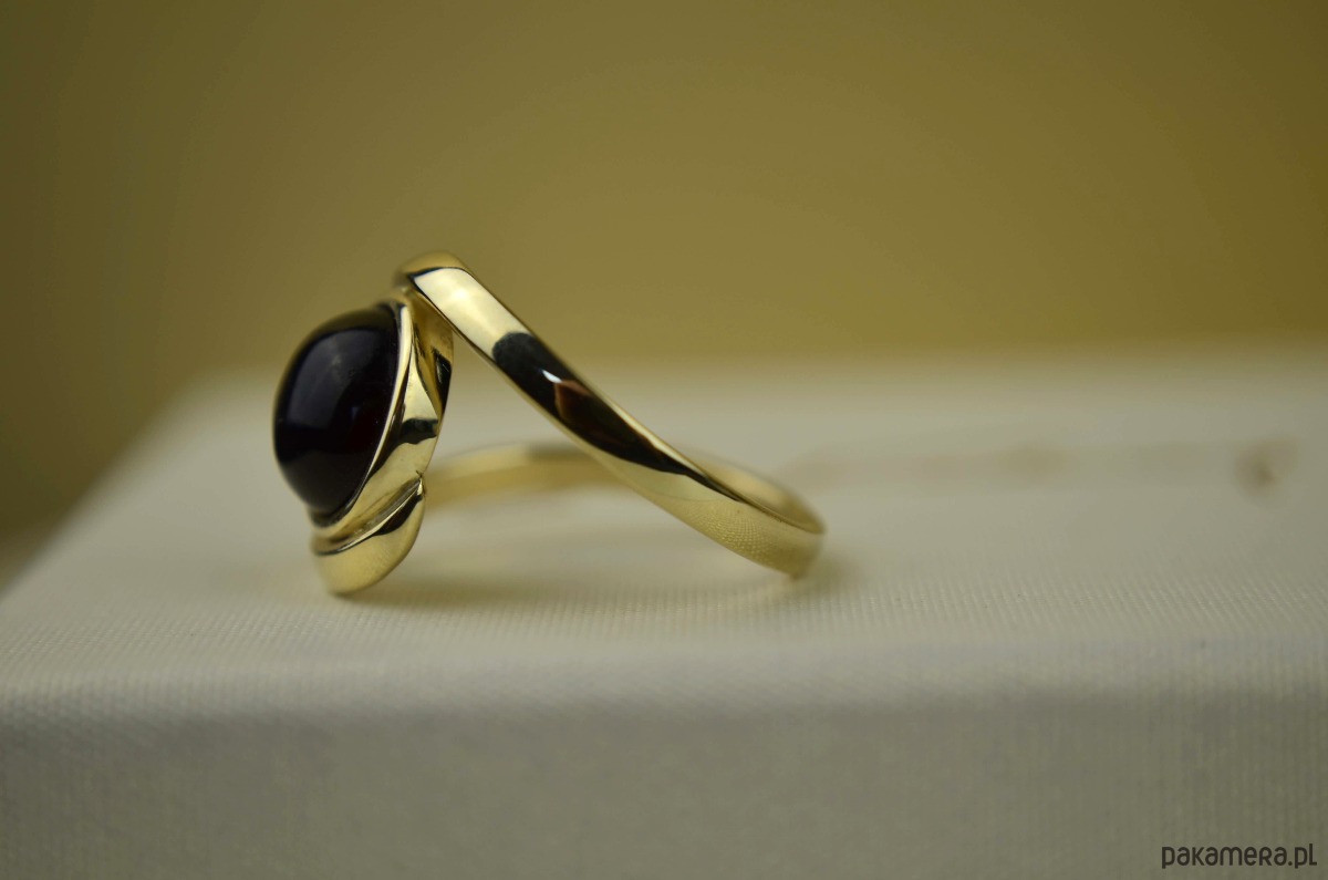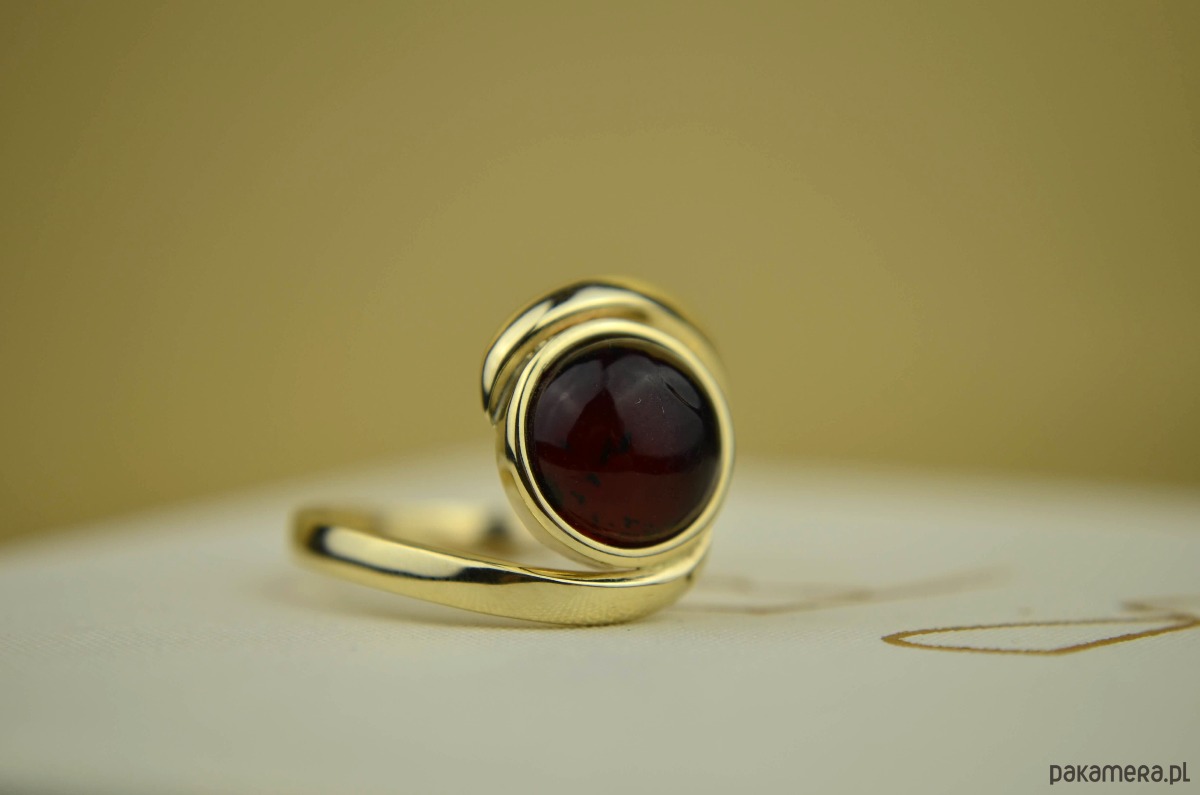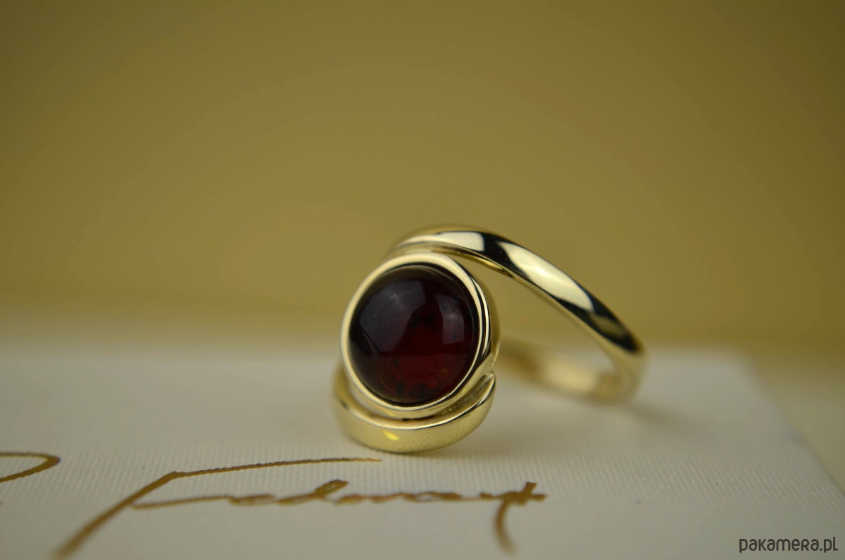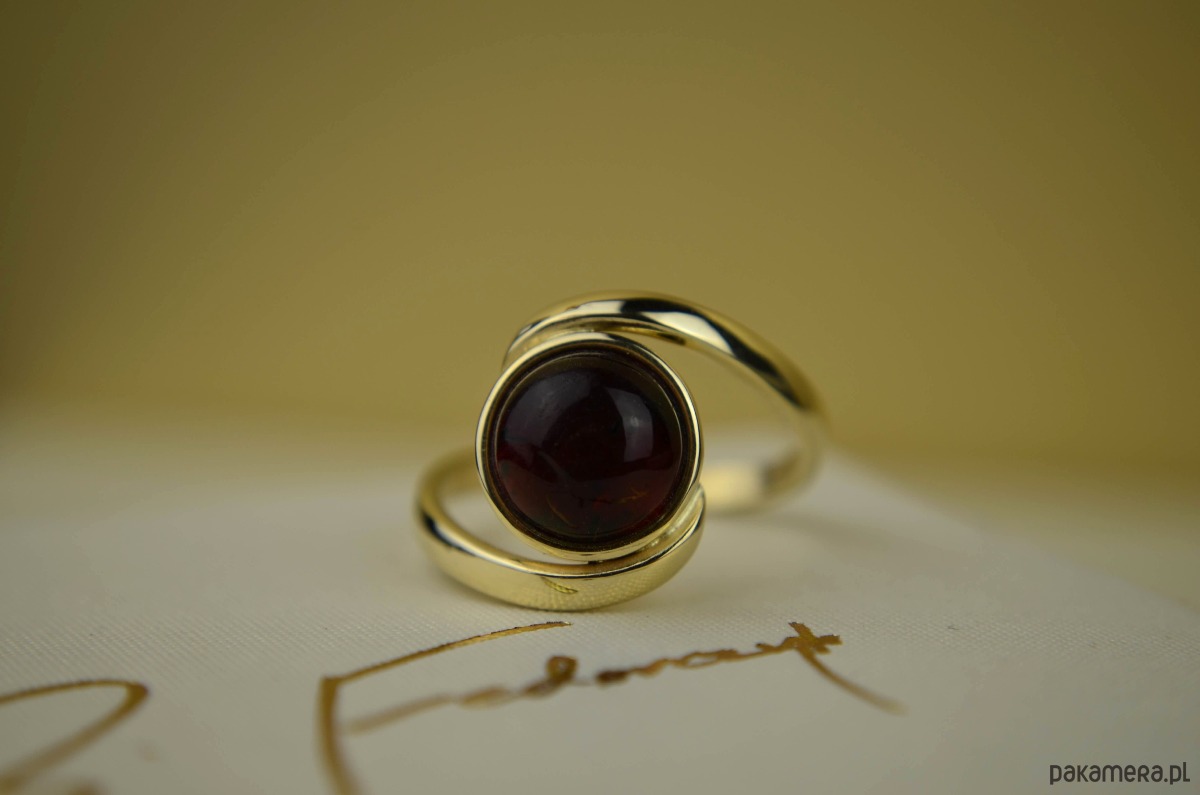 Złota wstęga, która trzyma w swoich ramionach piękne oczko z wiśniowego bursztynu- oto klasyczny pierścionek dla Pań, które lubią połączenie bursztynu ze złotem. W centrum pierścionka umieściłam okrągły kaboszon bursztynu o nasyconym wiśniowym kolorze- ciemnym z wyraźną rubinową poświatą. Złoto wypolerowałam na najwyższy połysk. Taki pierścionek będzie prawdziwą gratką dla miłośniczek złota Bałtyku!
