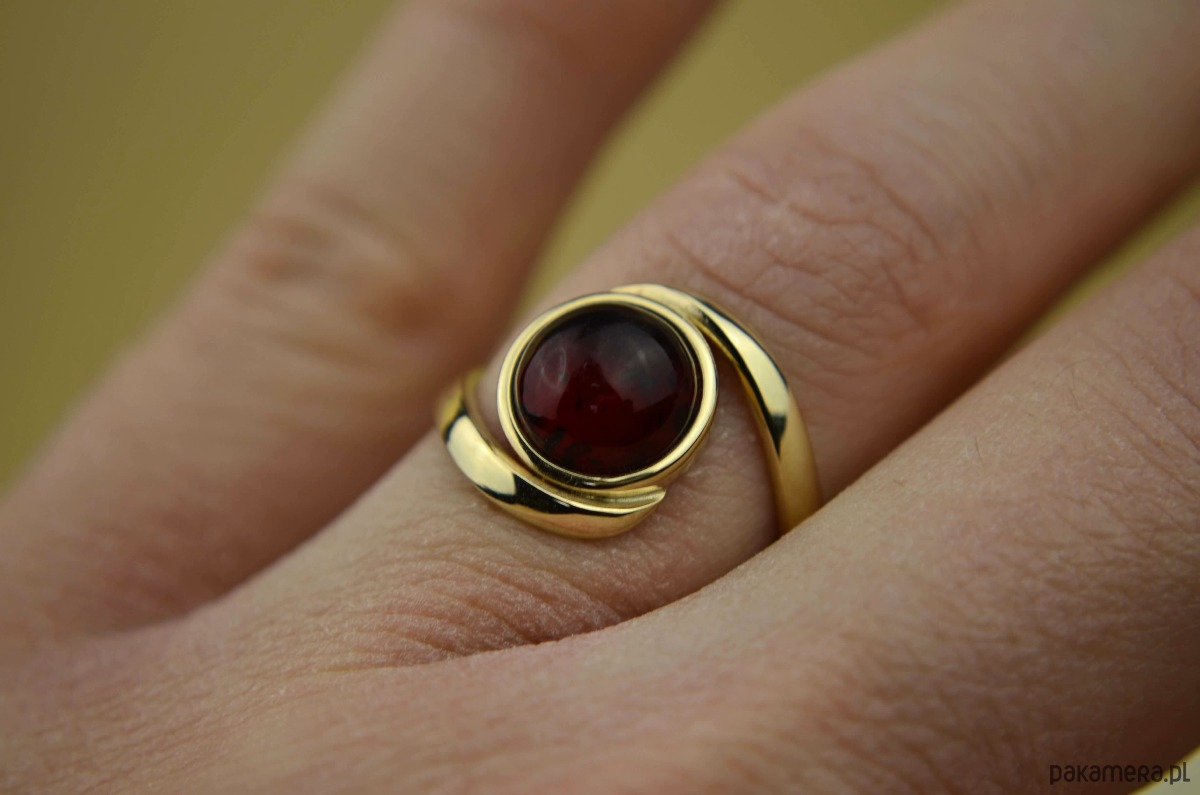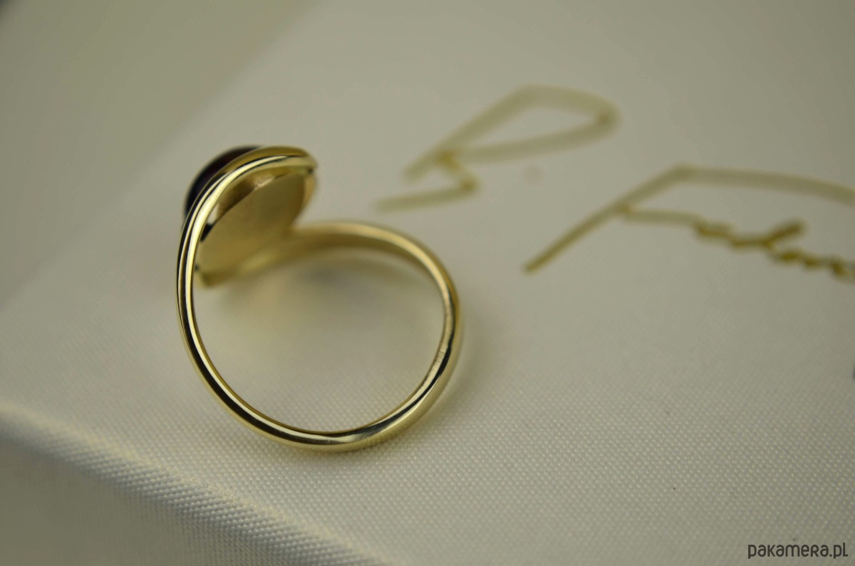 Złoty pierścionek z wiśniowym bursztynem pr. 585