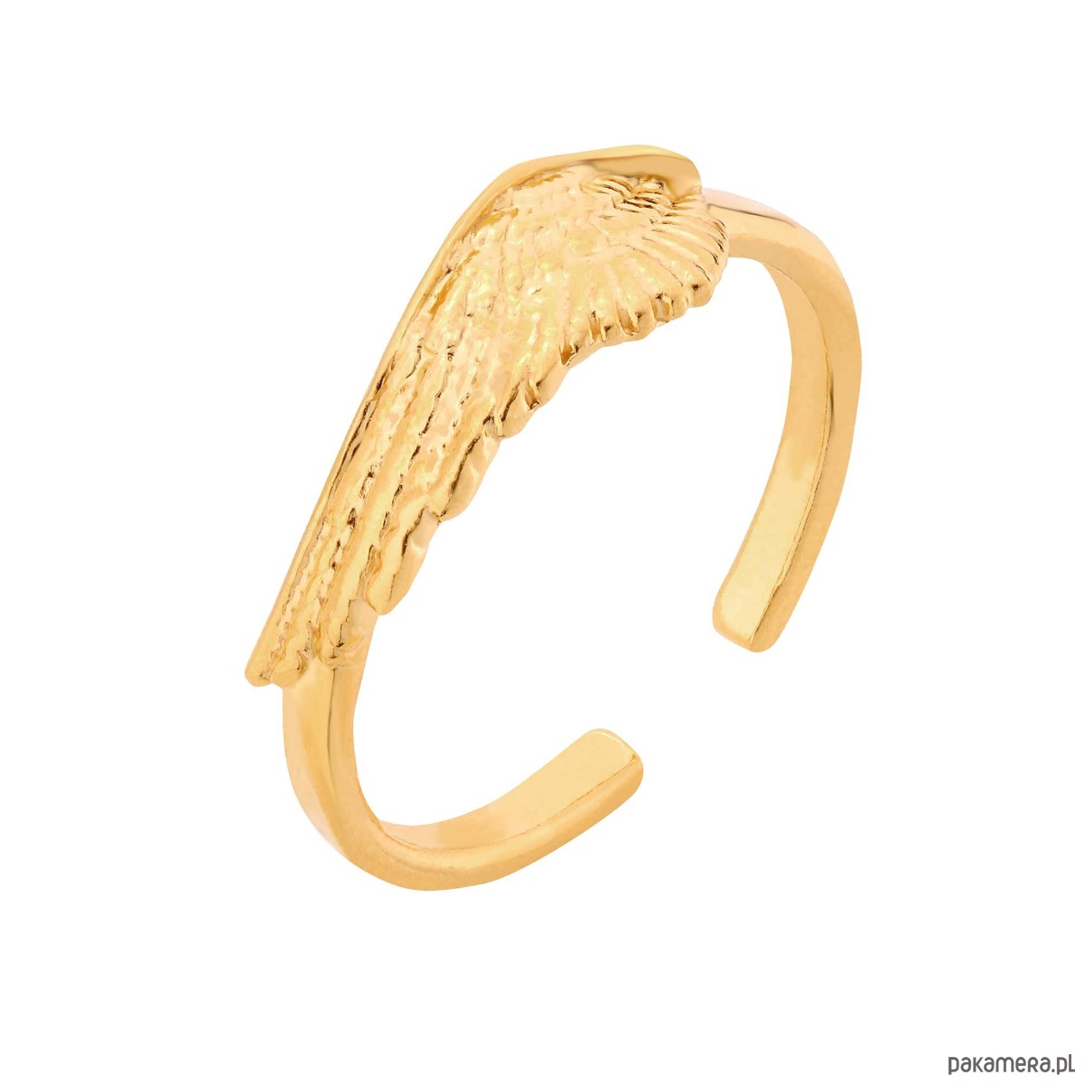 Złoty pierścionek ze skrzydłem. Wszystkie elementy wykonane są ze srebra 925 powlekanego 24 karatowym żółtym złotem.