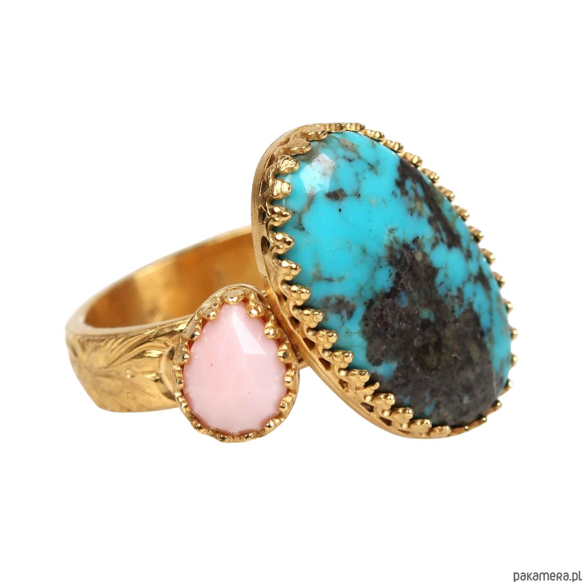 Ręcznie wykonany pierścionek z turkusem i opalem różowym ze srebra pokrytego 24 karatowym złotem z przepięknie fakturowaną obrączką i ozdobną koronkową obudową wokół kamieni w stylu Vintage.